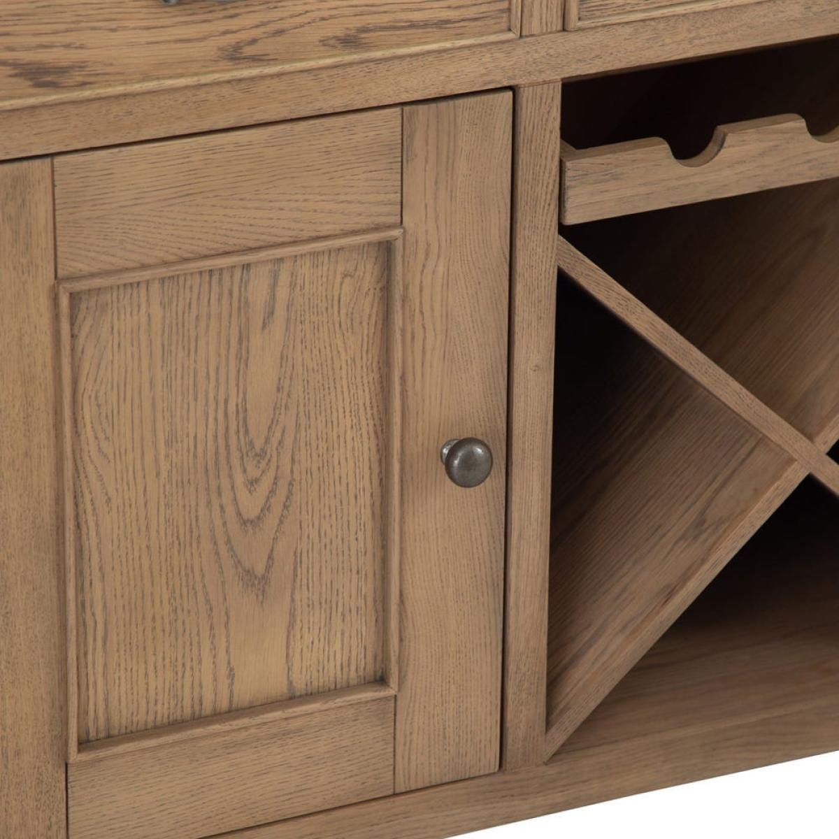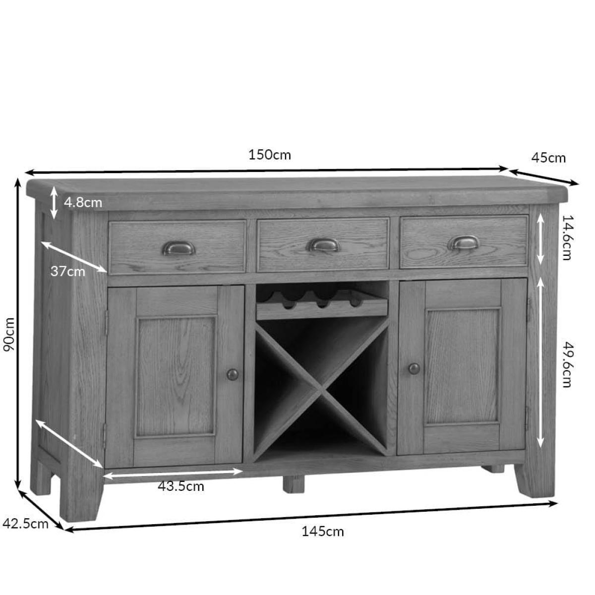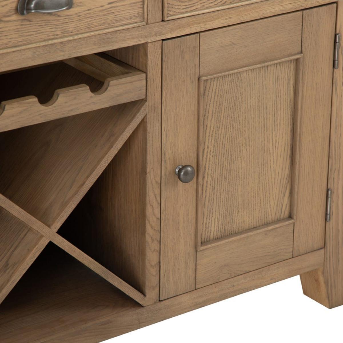 Store your reds, whites and rosés in style with our Wessex smoked oak large sideboard wine rack. This two-in-one wine repository and sideboard combines easy-going down-time with practical storage facilities. Before your guests arrive, stow away any overlooked toys and games in one of the 44cm x 37cm drawers. And when they get here, grab a bottle from the cross wine rack, which fits 12 standard bottles and a further three in a space above it – more than enough for a couple of dinner parties. The two cupboards on either side will house your flutes, tumblers and stemless glasses and bring some traditional style to your room with their smoked oak finish.