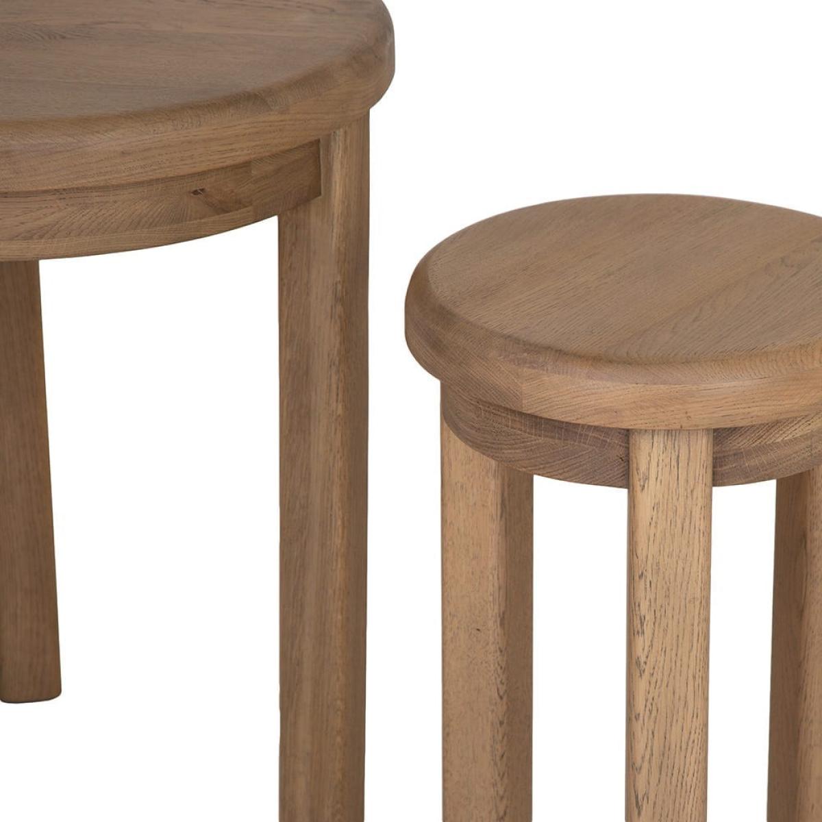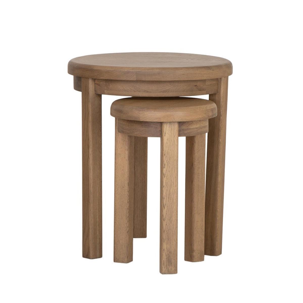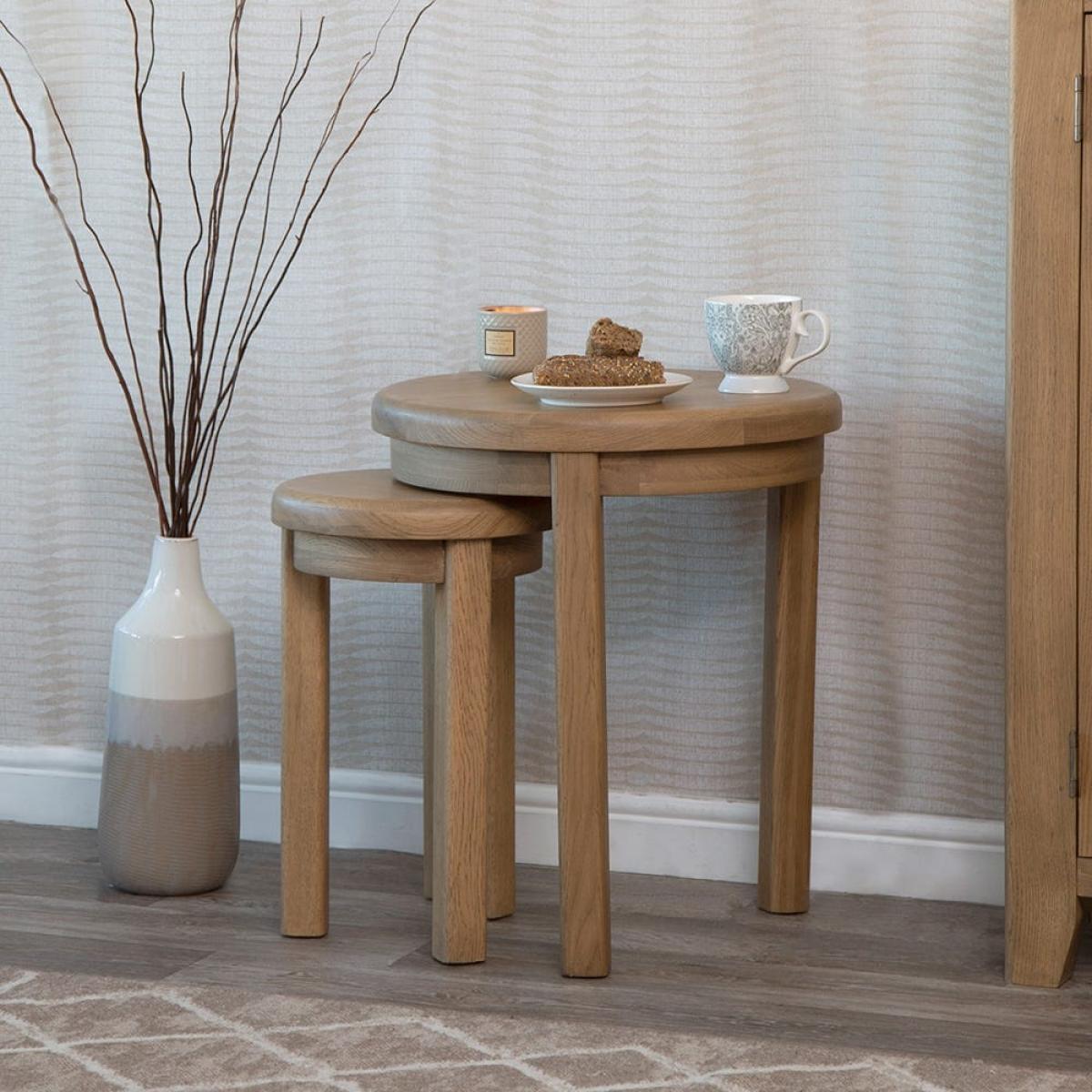 Need somewhere to put a couple of mugs and a slice of cake when pals are round? With our Wessex smoked oak round nest of tables, you won’t be short of table space. There are two tables in this set – one at 60cm and one at 50. 5cm – and they slot together cleanly when you’re finished with them. They’re also a familiar and welcoming presence in your living room. Their round wood tops and hardy legs have been smoked to create a warming and unique appearance that’s like furniture from old country homes.