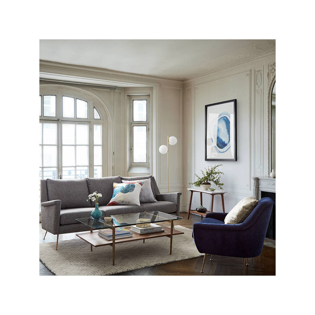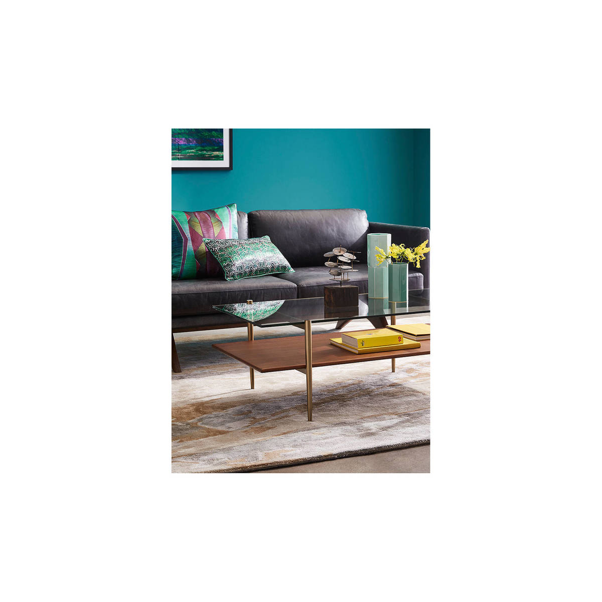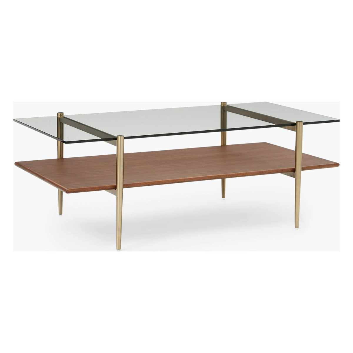 The Art Display coffee table from west elm combines mid-century styling with clean lines to bring a focal point to your living room decor. Its two-tier, rectangular profile is designed with an airy glass top and a convenient lower shelf that's finished in a smart walnut veneer. Supported by a sturdy, yet minimalist metal frame in an antique-brass effect finish, it lend storage and style to your space.