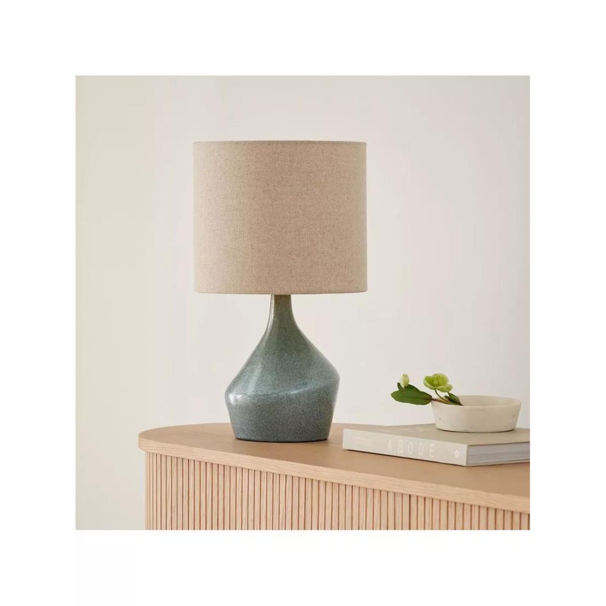 Variegated colouring adds a special touch to the fluid form of the Asymmetry Ceramic Table Lamp, inspired by Japanese pottery. Topped with a linen shade, it offers diffused light next to a bed or a reading nook. Ceramic base in an organic shape Natural linen shade Grey cloth-wrapped cord Slight variations in speckled finish are to be expected Plug-in Bulb included, white LED Compatible with dimming smart bulbs (sold separately)