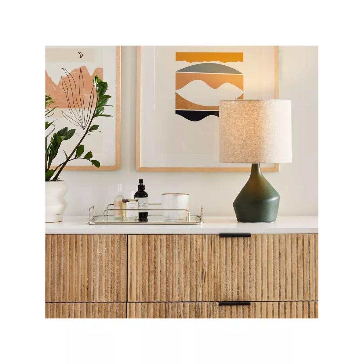 I love this lampshade because of its sculptural shape and calming green jade finish, which adds a touch of sophistication to any space. It works particularly well in contemporary or minimalist interiors, where its clean lines can stand out without overwhelming the room. To style it effectively, consider placing it on a neutral sideboard or bedside table-pair it with natural textures like wood or ceramics for a balanced look. Practical tip: choose a warm-toned bulb to complement the green hue and create a cosy atmosphere, making it versatile for both living rooms and bedrooms.