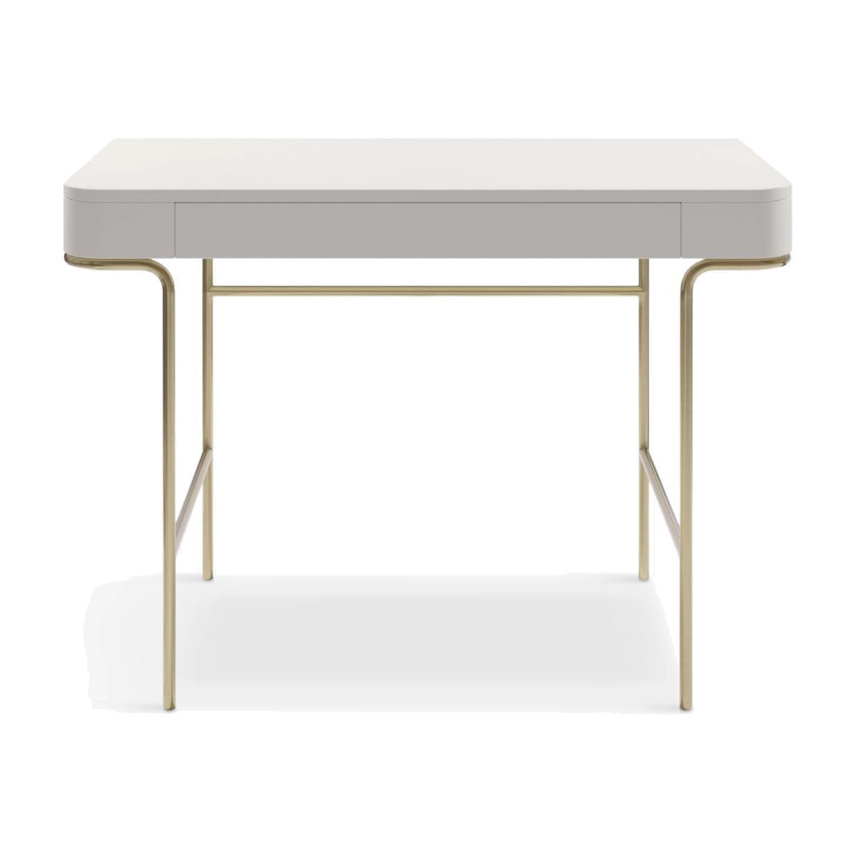 I love this desk for its clean, contemporary aesthetic combined with subtle elegance. The Oyster tone adds a soft, neutral backdrop that works well in both modern and transitional interiors, while the antique brass detailing brings warmth and a touch of sophistication. It’s versatile enough to sit in a home office, bedroom nook, or even a stylish salon. For styling, consider pairing it with minimalist accessories-think sleek desk lamps, a curated selection of books, or tactile desk organisers-to keep the look streamlined. Its understated charm makes it a flexible piece that can adapt to different colour schemes and decor styles, perfect for creating a chic yet practical workspace.