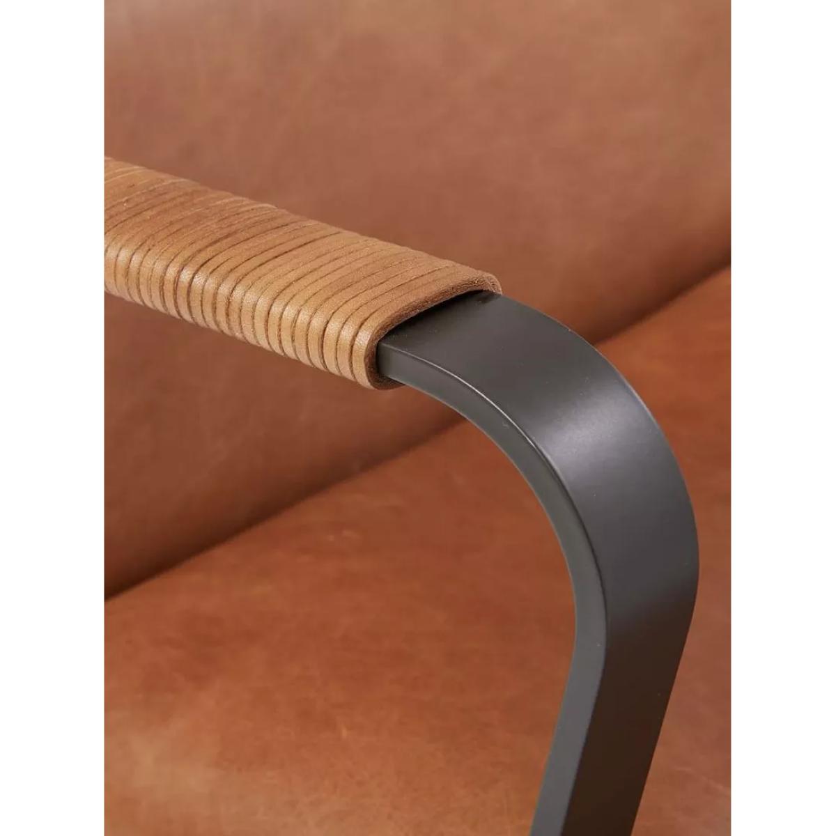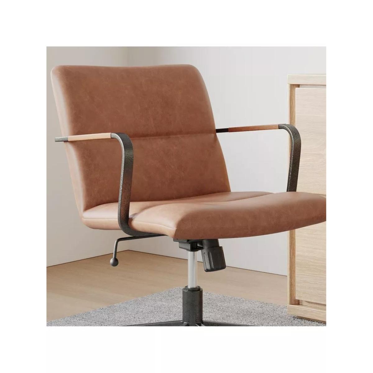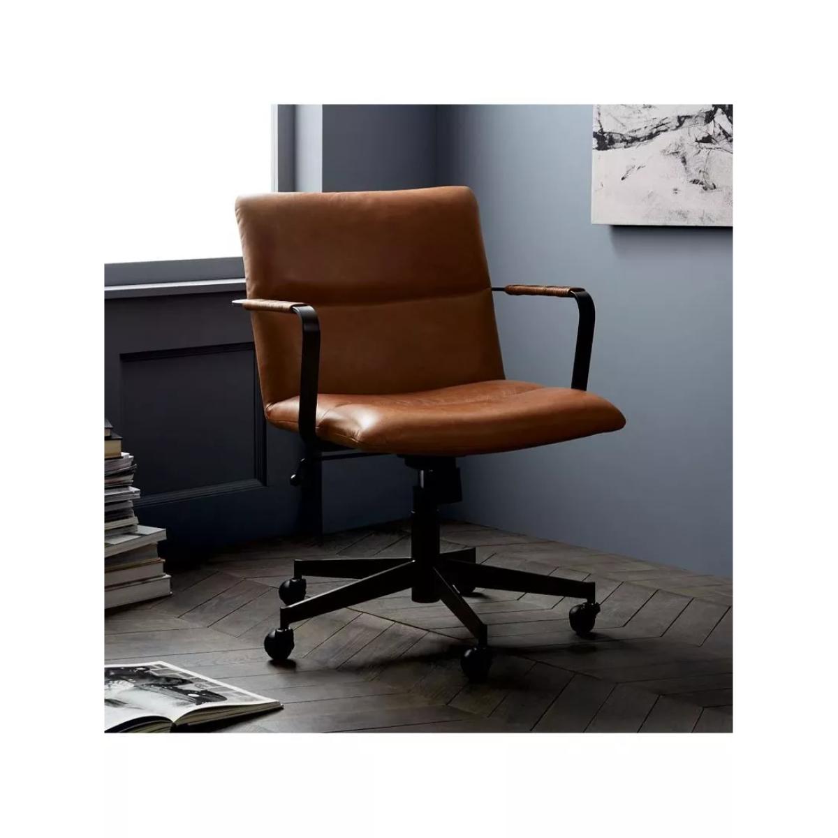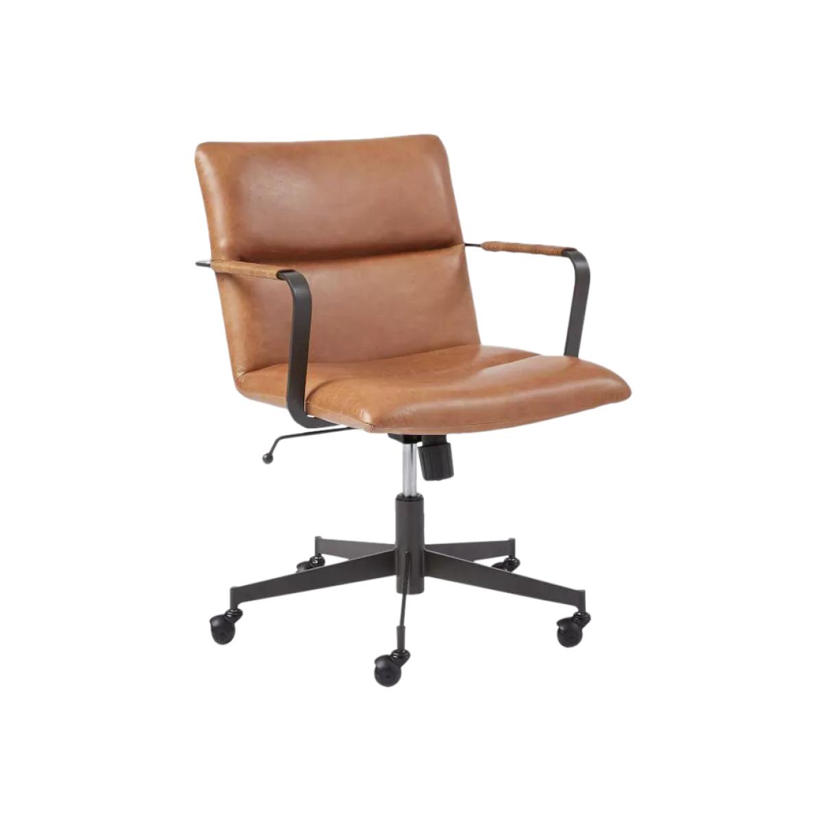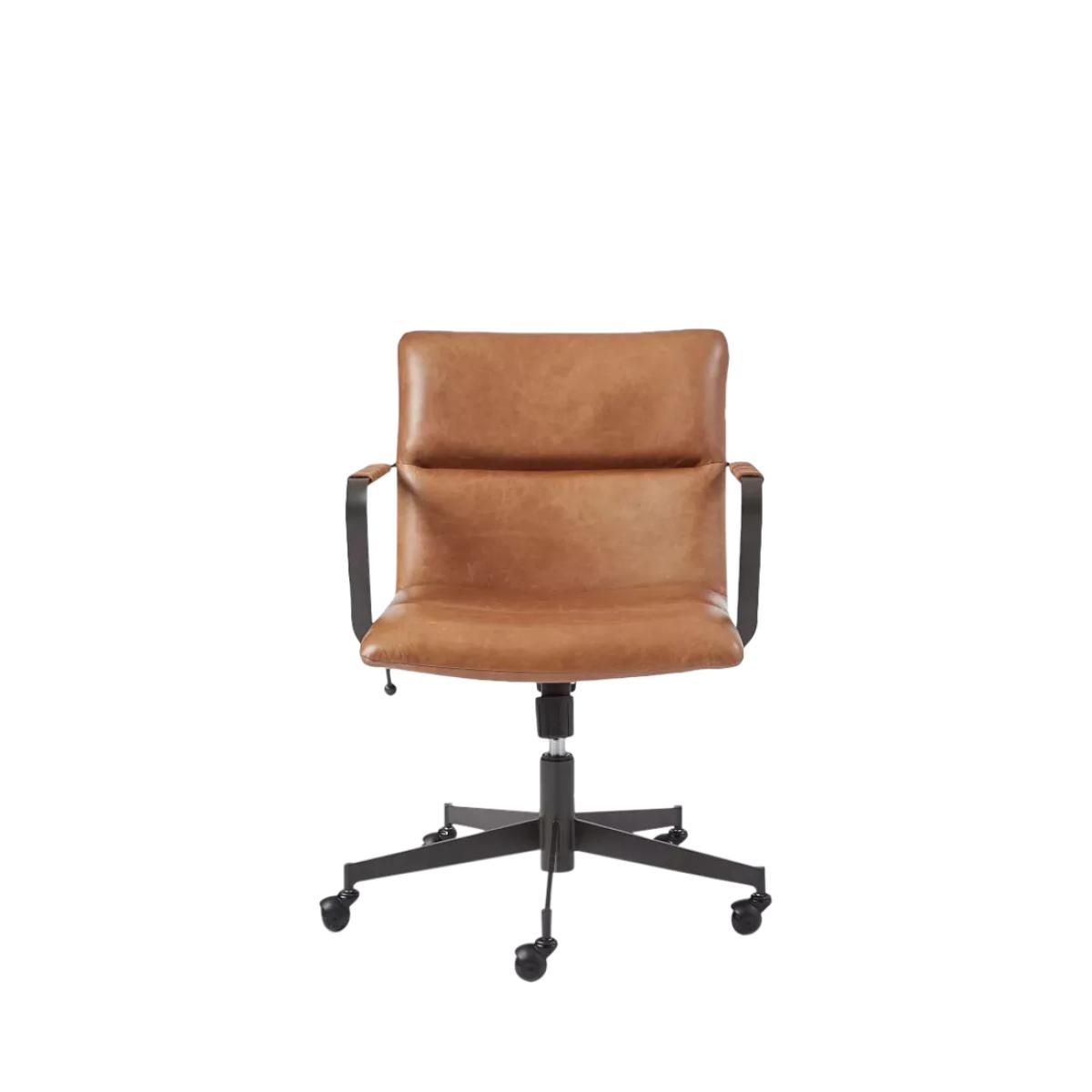 Match everyday comfort with vintage style. This office chair is made in top-grain leather with metal arms that wrap around the back for a '70s twist. Leather cording covers the armrests Adjustable comfort:Adjust the height so it's just right beside the desk or dining table Quality material: The metal frame was built to last, so you'll know it's extra sturdy Metal base and arms Base swivels and tilts Care should be taken when placing this chair directly on wooden floors. To prevent scratches, use a protective mat Pair it with your favourite west elm desk