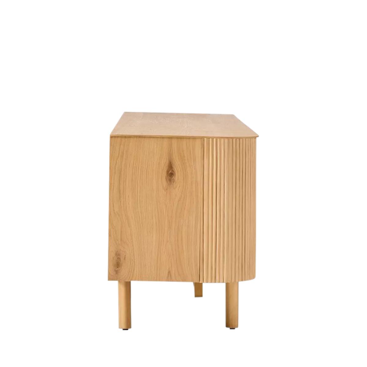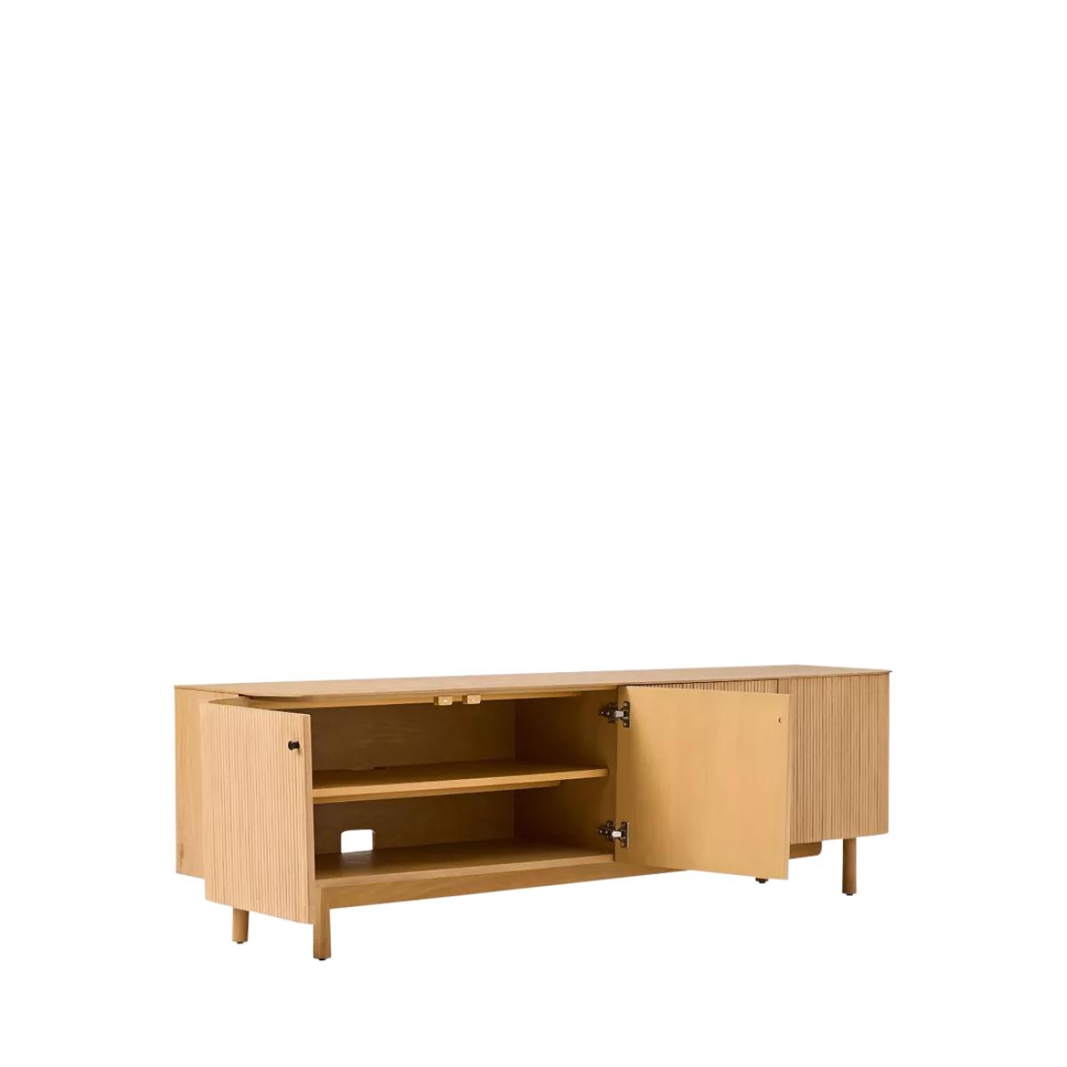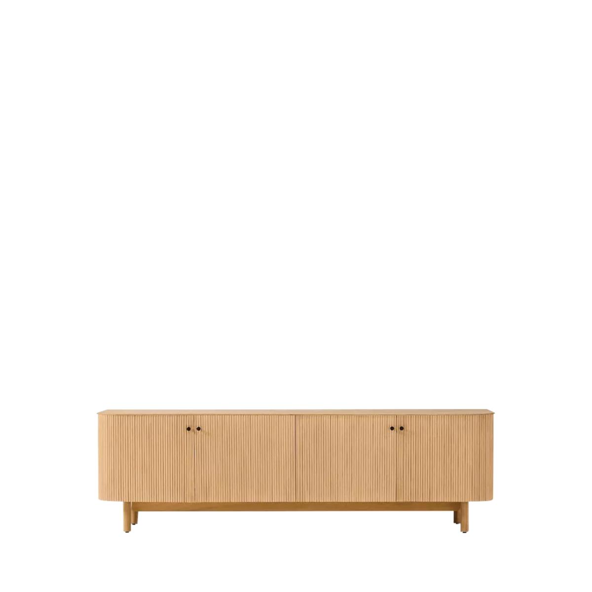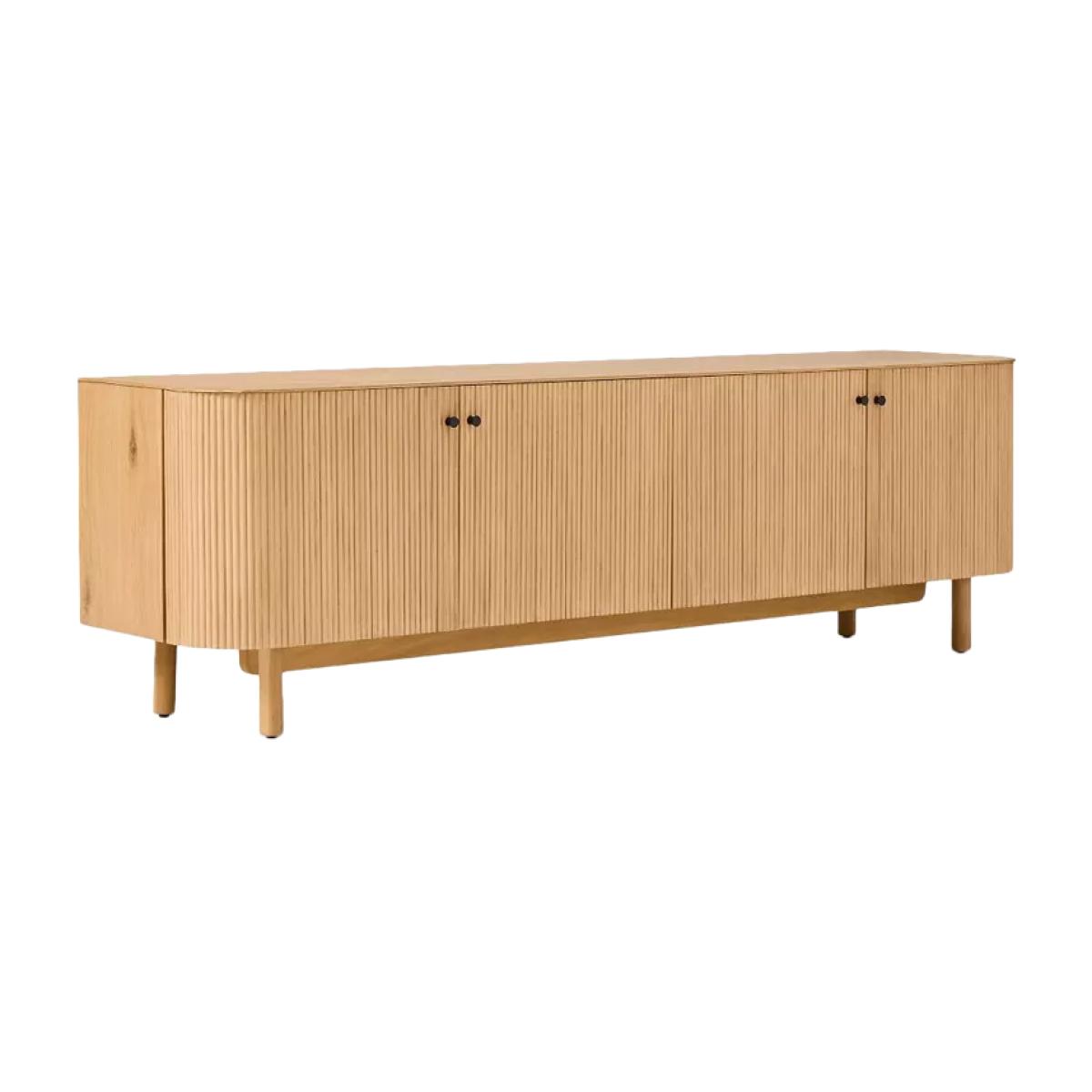 Rounded corners accentuate the fluted front of this sideboard. Elegant cylindrical legs keep it lifted off the floor. Fine fluting: fluted fronts are a subtle way to give this piece texture, depth and contrast Statement making: its large scale makes it the perfect anchor piece for your living room Oak veneer over engineered wood top, frame and shelves Solid wood legs Two cabinets with one adjustable shelf in each Accommodates a flat-screen TV up to 203cm with a maximum weight of 45kg Four cut-outs on the back panel for cord management All wood is kiln-dried for added durability Made with FSC®-certified wood from responsibly managed forests Made in a Fair Trade Certified™ factory, empowering workers who made it By choosing this product you are supporting responsible management of the world's forests. The Forest Stewardship Council® (FSC®) is a global, not-for-profit organisation that helps take care of forests and the people and wildlife that call them home. To learn more, visit www.fsc.org.
