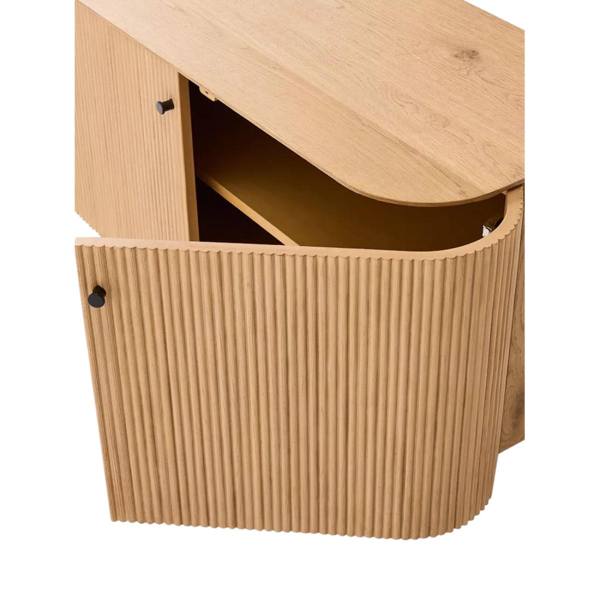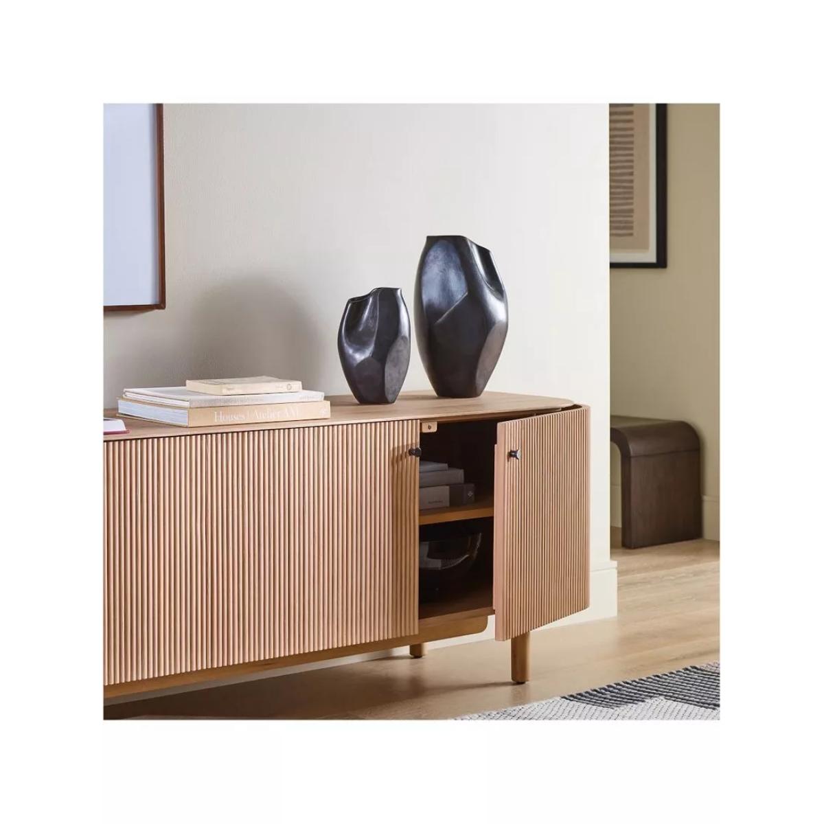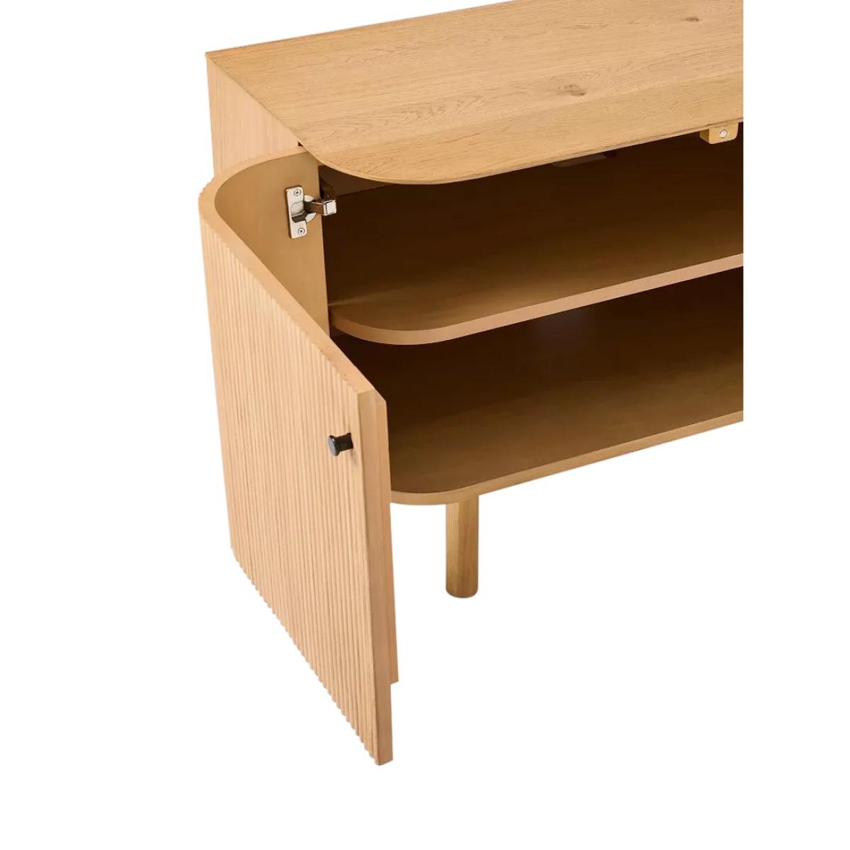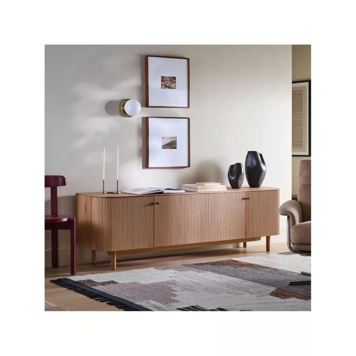 Rounded corners accentuate the fluted front of this sideboard. Elegant cylindrical legs keep it lifted off the floor. Fine fluting: fluted fronts are a subtle way to give this piece texture, depth and contrast Statement making: its large scale makes it the perfect anchor piece for your living room Oak veneer over engineered wood top, frame and shelves Solid wood legs Two cabinets with one adjustable shelf in each Accommodates a flat-screen TV up to 203cm with a maximum weight of 45kg Four cut-outs on the back panel for cord management All wood is kiln-dried for added durability Made with FSC®-certified wood from responsibly managed forests Made in a Fair Trade Certified™ factory, empowering workers who made it By choosing this product you are supporting responsible management of the world's forests. The Forest Stewardship Council® (FSC®) is a global, not-for-profit organisation that helps take care of forests and the people and wildlife that call them home. To learn more, visit www.fsc.org.