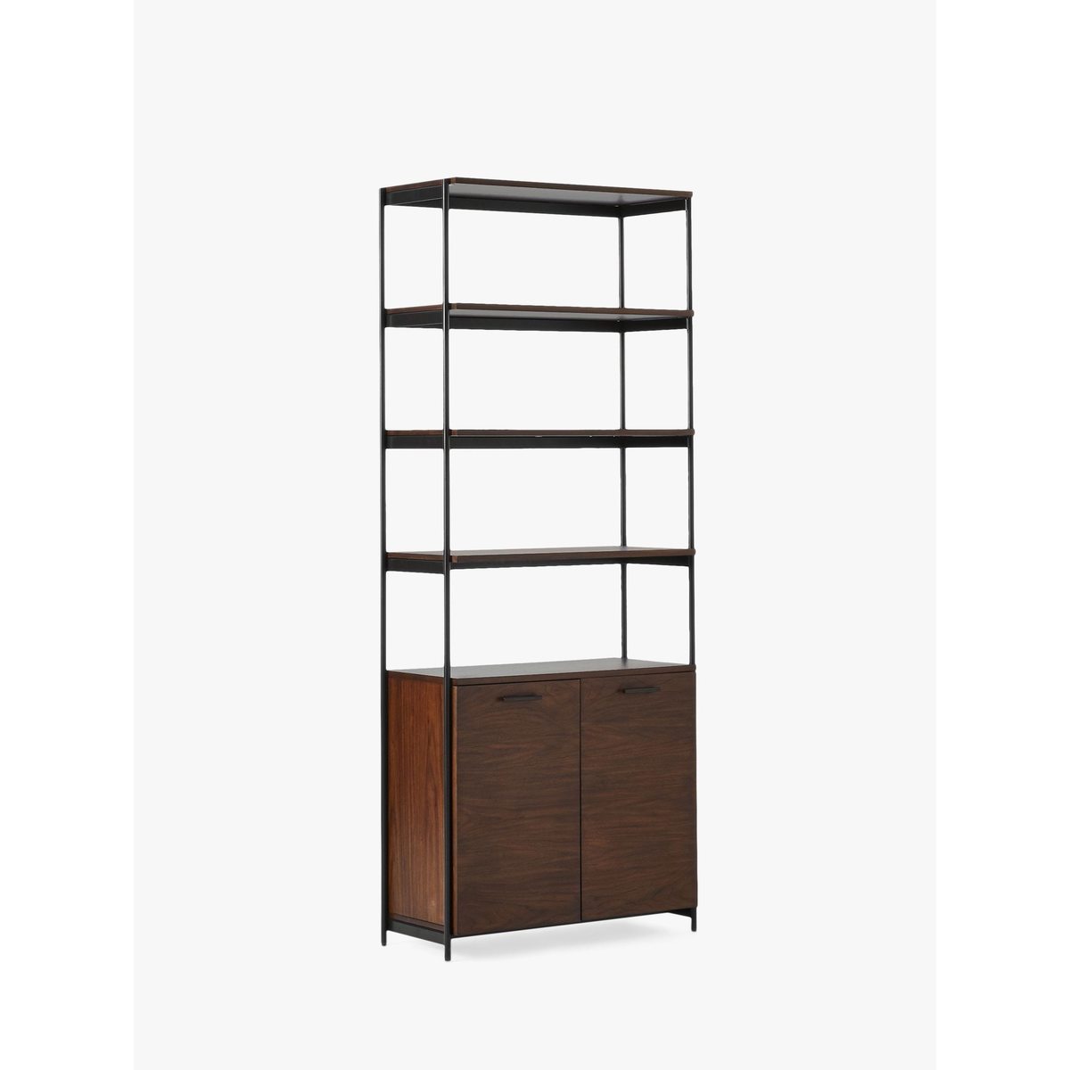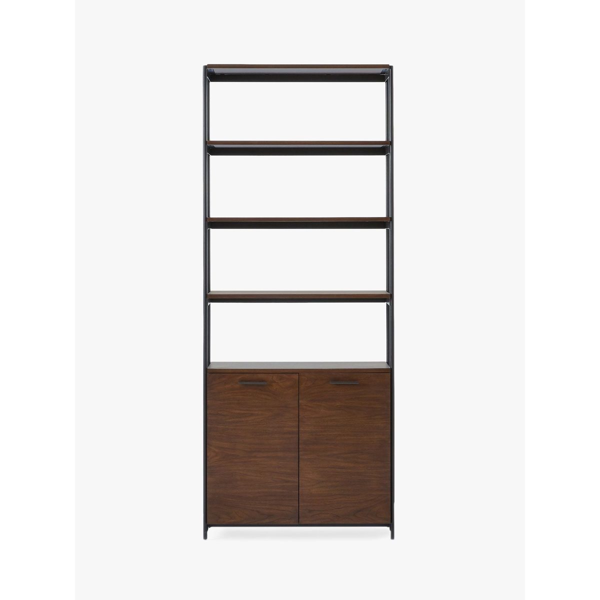 The Wide Foundry Bookcase from west elm is designed with both cabinet storage and shelving. Made from kiln-dried, dark walnut veneer and engineered wood, it's accented with metal hardware in a rustic antique bronze finish. Its streamlined, sturdy frame features four shelves, while the cabinet section opens to reveal two adjustable internal shelves for optimal organisation. The legs are designed with adjustable levelers so in order to adapt to varying floor levels. We recommend fitting this bookcase using the anti-tip hardware provided.