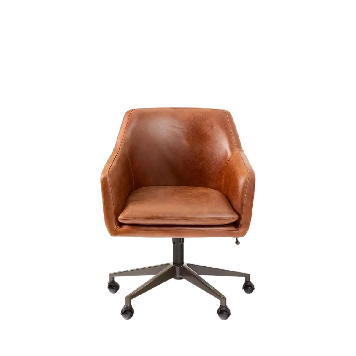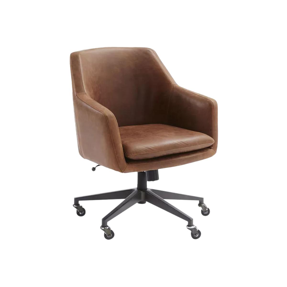 I love this office chair for its sleek, minimalist design and versatile brown leather that adds warmth to any workspace. It works particularly well in modern or industrial interiors, but can also complement more traditional schemes when paired with textured fabrics and metallic accents. Practical styling tips include placing it with a wooden desk and embracing neutral or earthy tones around the room to create a cohesive look. Its swivel base and casters make it highly functional for everyday use, while the leather finish ensures durability and easy maintenance. Overall, it's a classic yet contemporary choice for a comfortable, stylish office setup.
