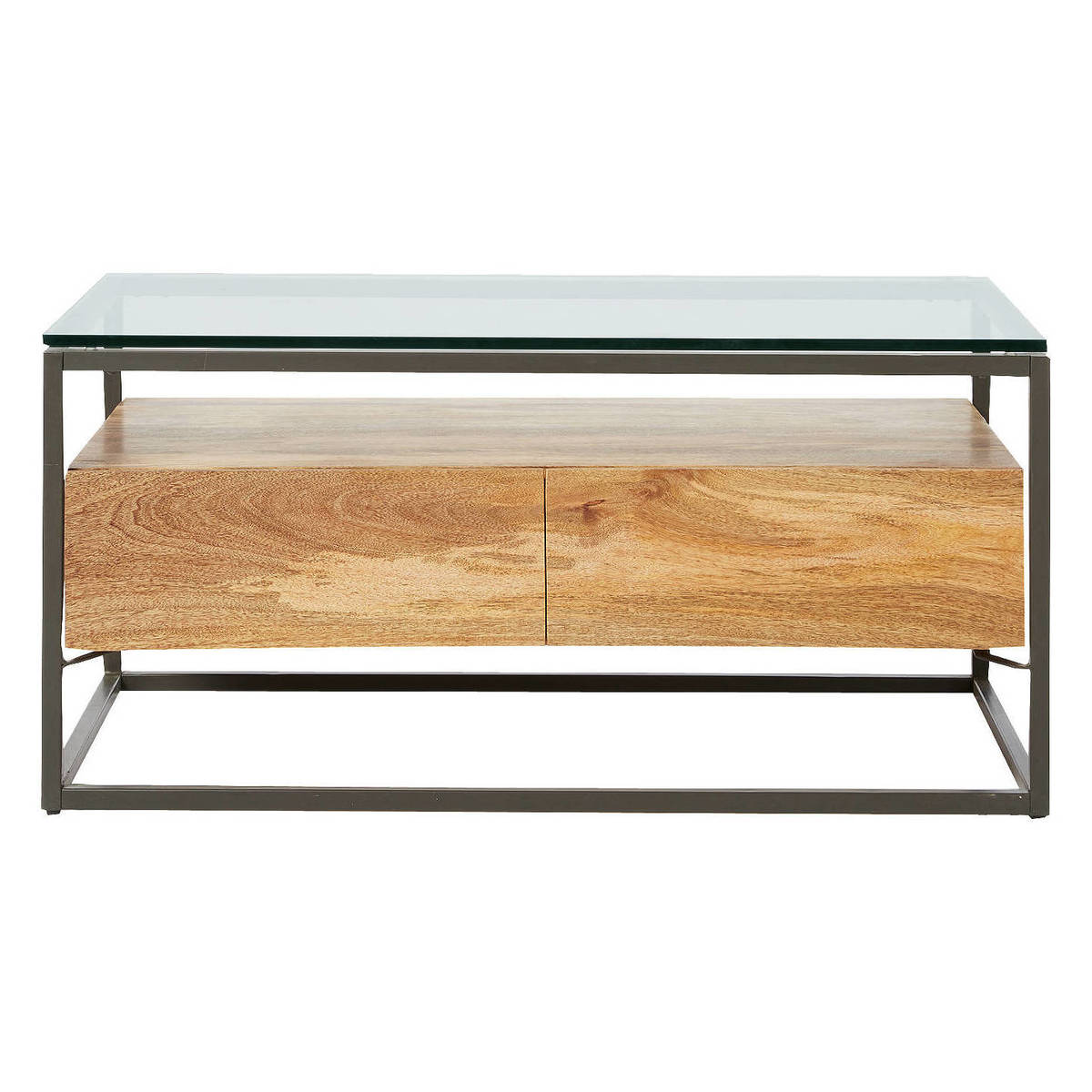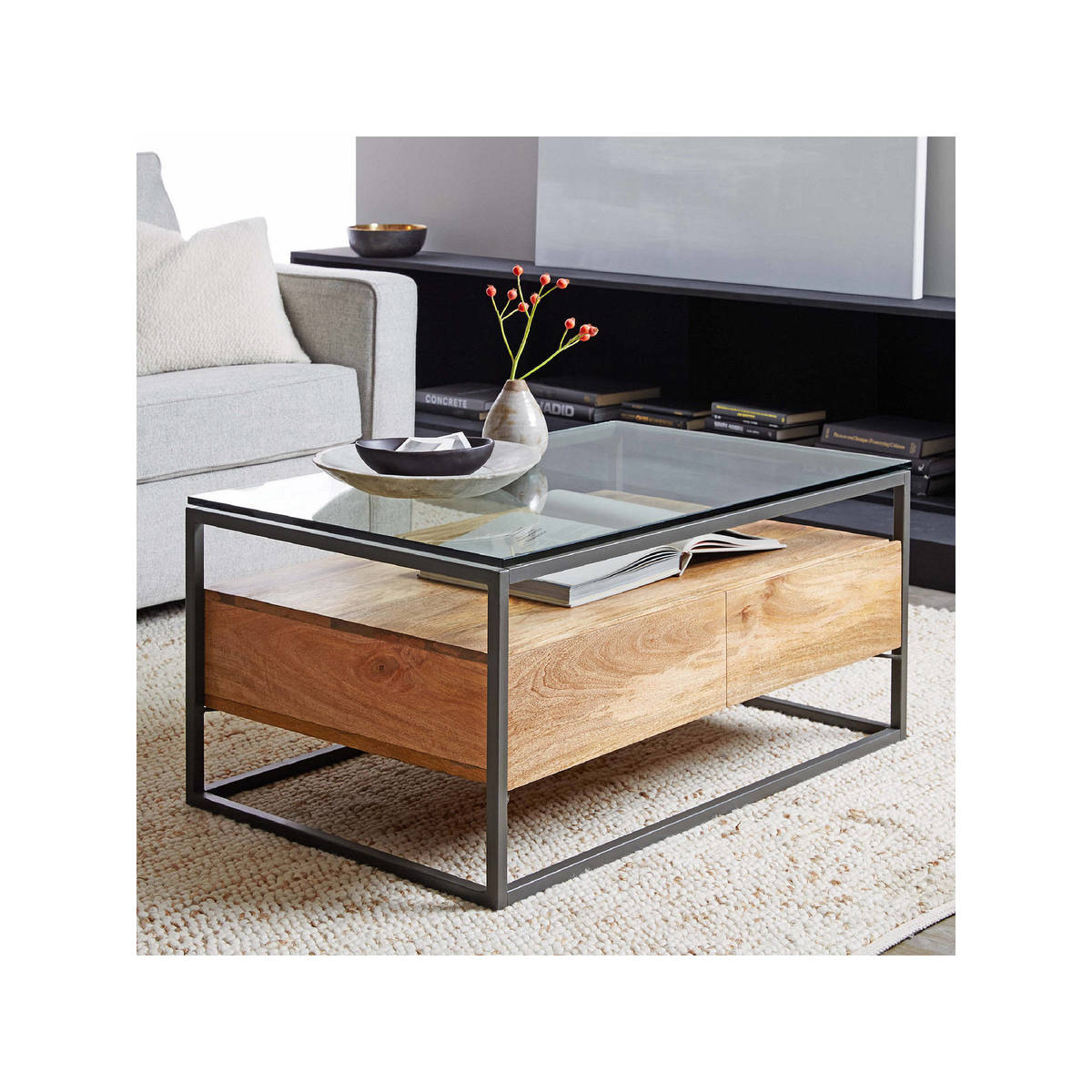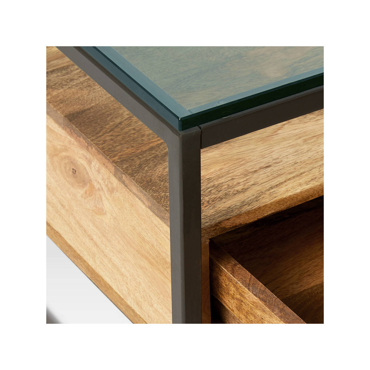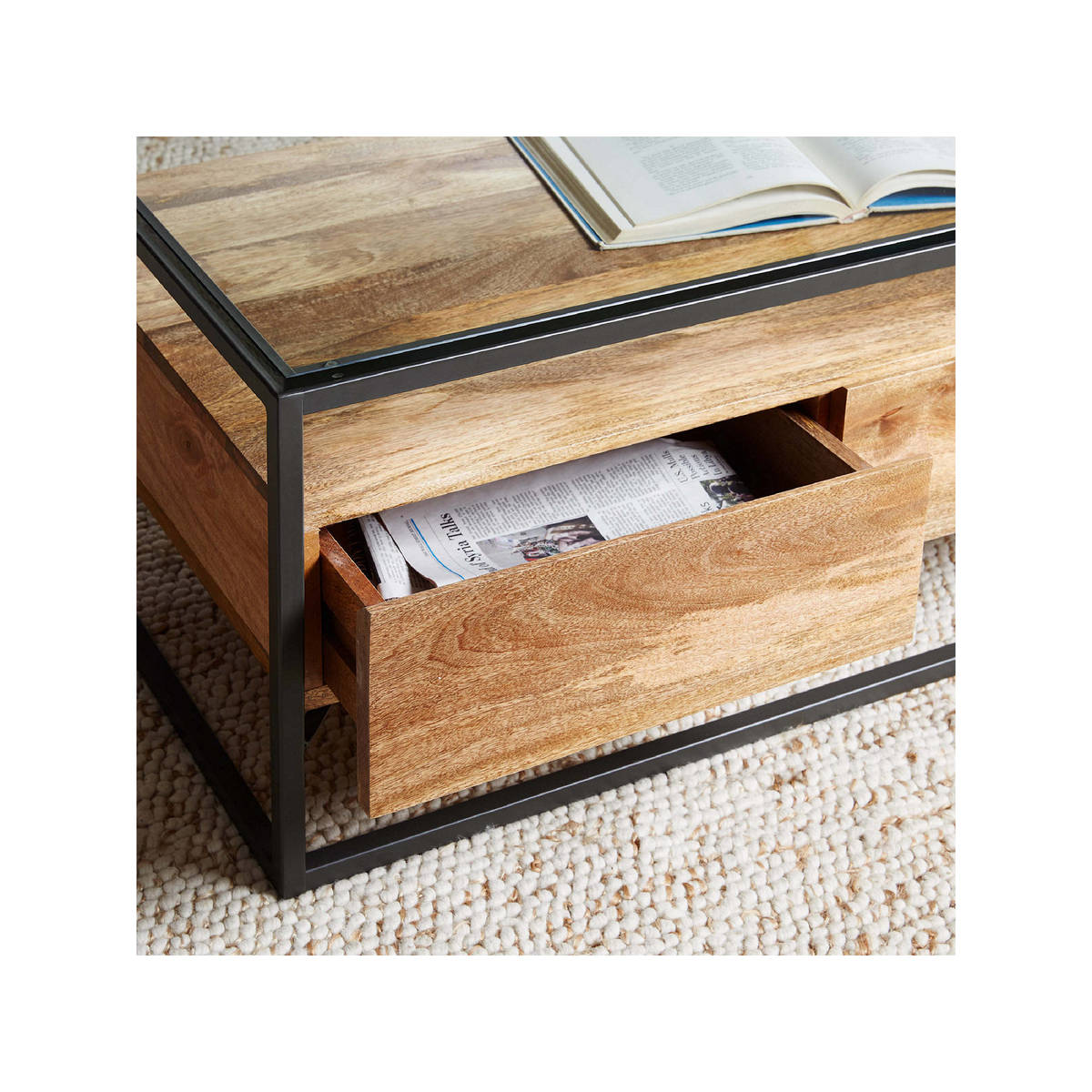 Stylish storage with a sustainable edge. This coffee table from west elm fuses the industrial with the rustic, made from solid mango wood with a blackened steel frame. Its boxy-shape incorporates a glass surface top and two spacious drawers, helping you to keep your living room tidy and clutter free. Made in a Fairtrade Certified™ facility Responsibly made to leave a positive impact on Fairtrade workers and their communities. Worth knowing The solid mango wood used has been sustainably sourced from trees that no longer produce fruit. Natural solid wood is known to expand and contract with changes in temperature, so variations and colouring in the wood grain is to be expected. Want to see it first? You may want to see and get a feel for the furniture in one of our shops before ordering. We'll be able to tell you where the range you'd like to view is on display.