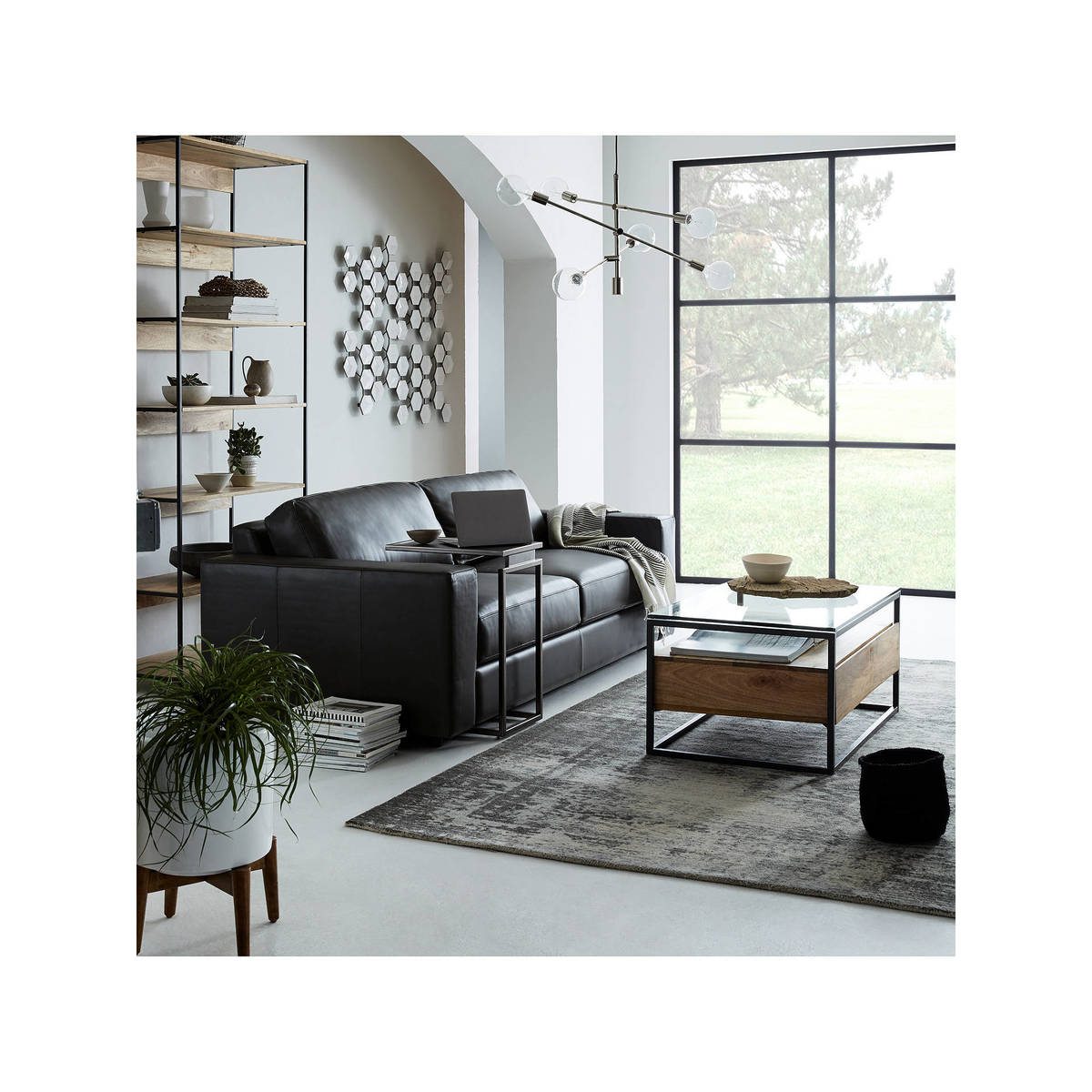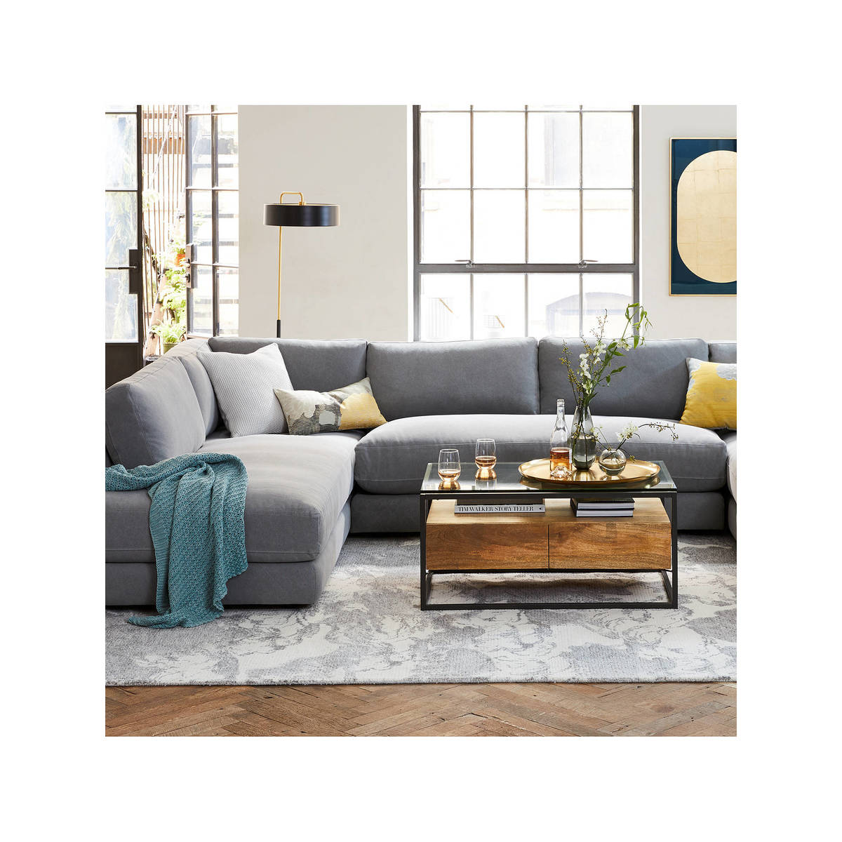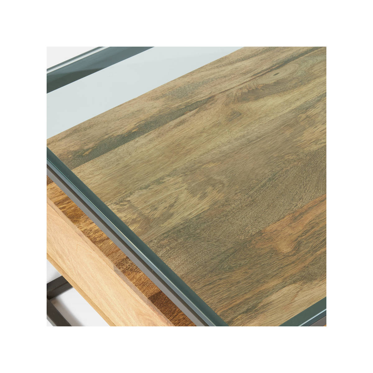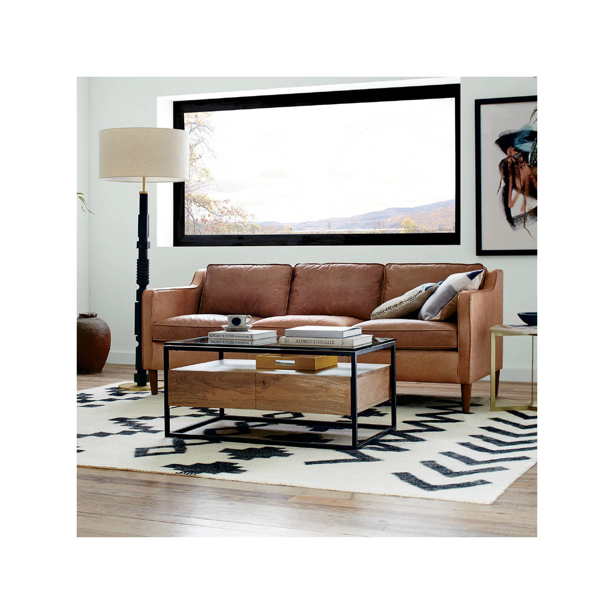 Stylish storage with a sustainable edge. This coffee table from west elm fuses the industrial with the rustic, made from solid mango wood with a blackened steel frame. Its boxy-shape incorporates a glass surface top and two spacious drawers, helping you to keep your living room tidy and clutter free. Made in a Fairtrade Certified™ facility Responsibly made to leave a positive impact on Fairtrade workers and their communities. Worth knowing The solid mango wood used has been sustainably sourced from trees that no longer produce fruit. Natural solid wood is known to expand and contract with changes in temperature, so variations and colouring in the wood grain is to be expected. Want to see it first? You may want to see and get a feel for the furniture in one of our shops before ordering. We'll be able to tell you where the range you'd like to view is on display.