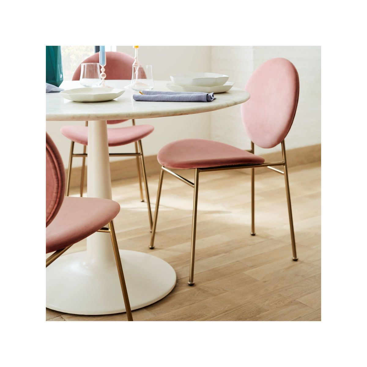 I love this pink dining chair for its playful yet sophisticated aesthetic. The soft colour makes it a versatile piece that can brighten up neutral interiors or add a pop of colour to more vibrant schemes. It works particularly well in contemporary or eclectic dining spaces, where its unique shape and hue can act as a statement. For styling tips, consider pairing it with natural wood or marble tables to balance the softness of the upholstery. Practical ideas include using a matching set for a cohesive look or mixing with bold accent colours and textures for a more eclectic, personalised vibe. Its slim profile also means it can fit comfortably into smaller dining areas without feeling too bulky.