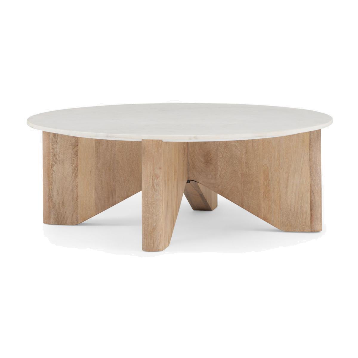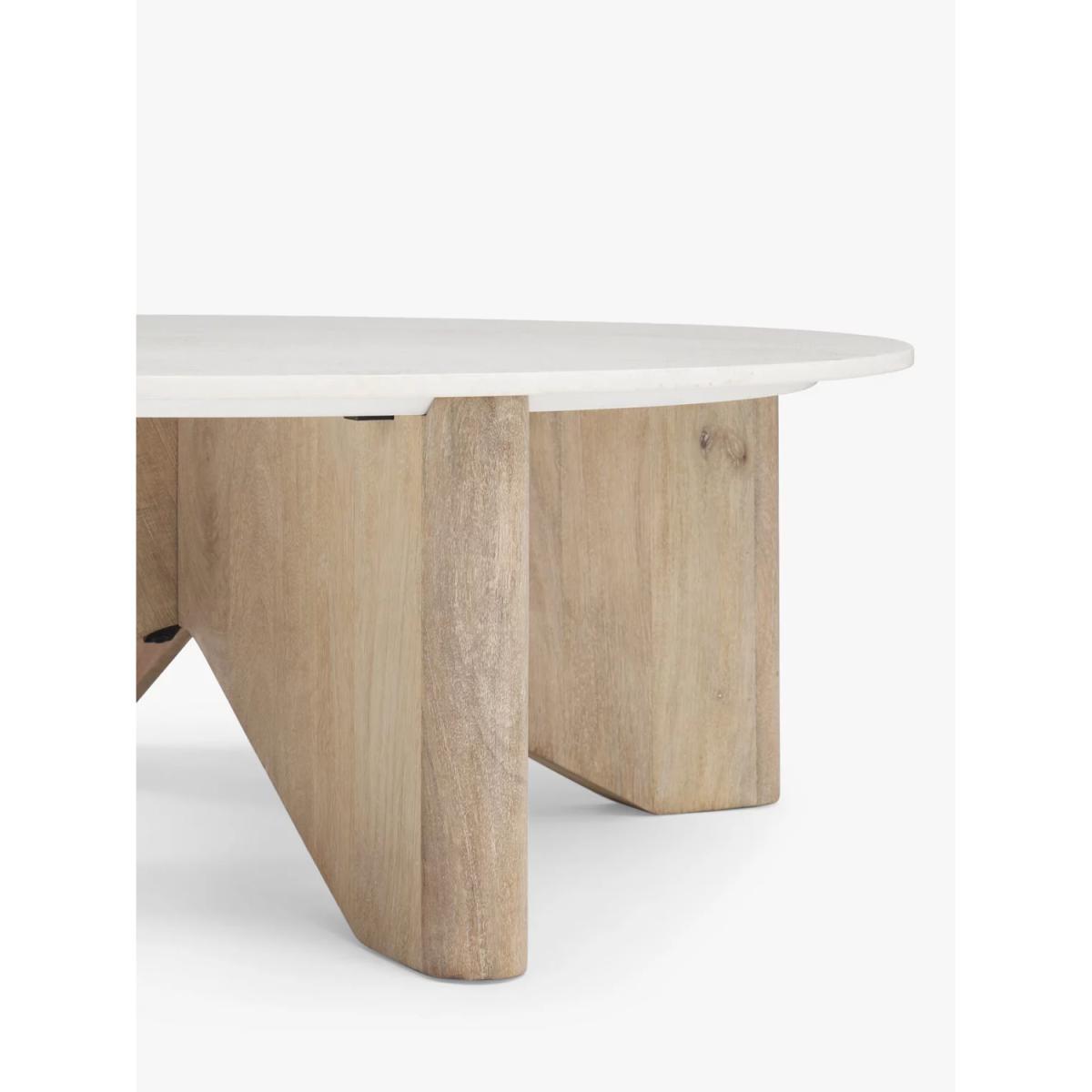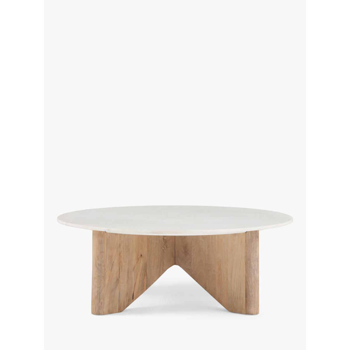 A beautiful centrepiece for your living room, this coffee table exudes laid-back sophistication. The chunky base is made from responsibly-sourced mango wood, sourced from trees that no longer produce fruit, and its light finish keeps the table looking natural and rustic. The light and luxurious round marble top offers the perfect complement. For a table that will help your space feel calm, refined and cosy, this table is contract-grade: manufactured to meet the demands of both commercial and residential use. The base features adjustable levels to adapt to varying floor levels. Want to see it first? You may want to see and get a feel for the furniture in one of our shops before ordering. We'll be able to tell you where the range you'd like to view is on display.