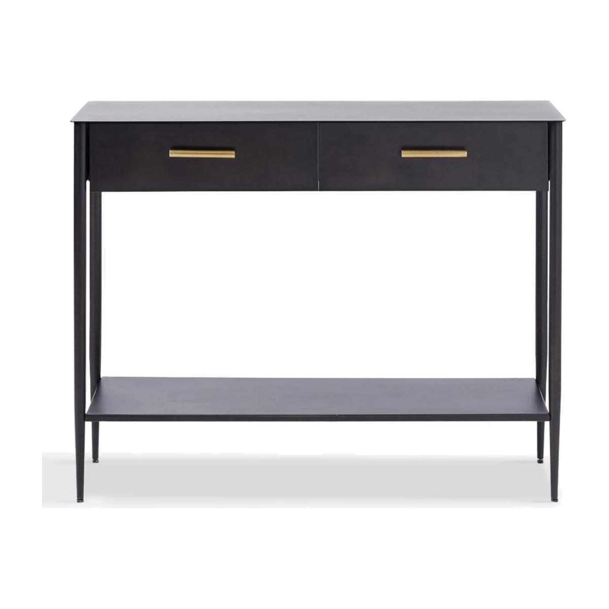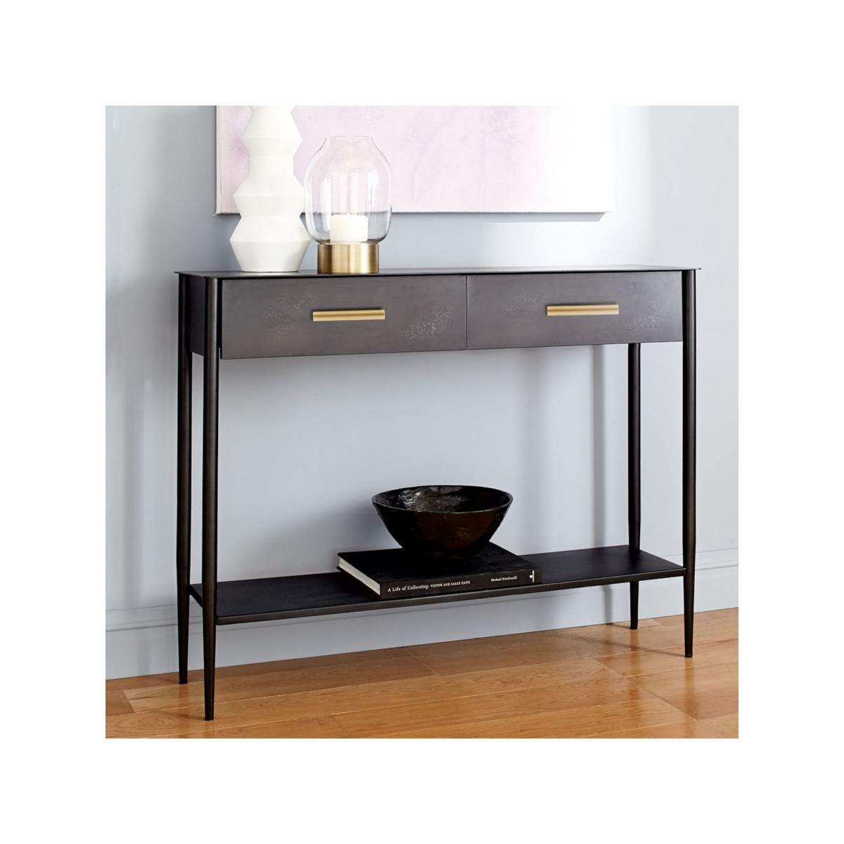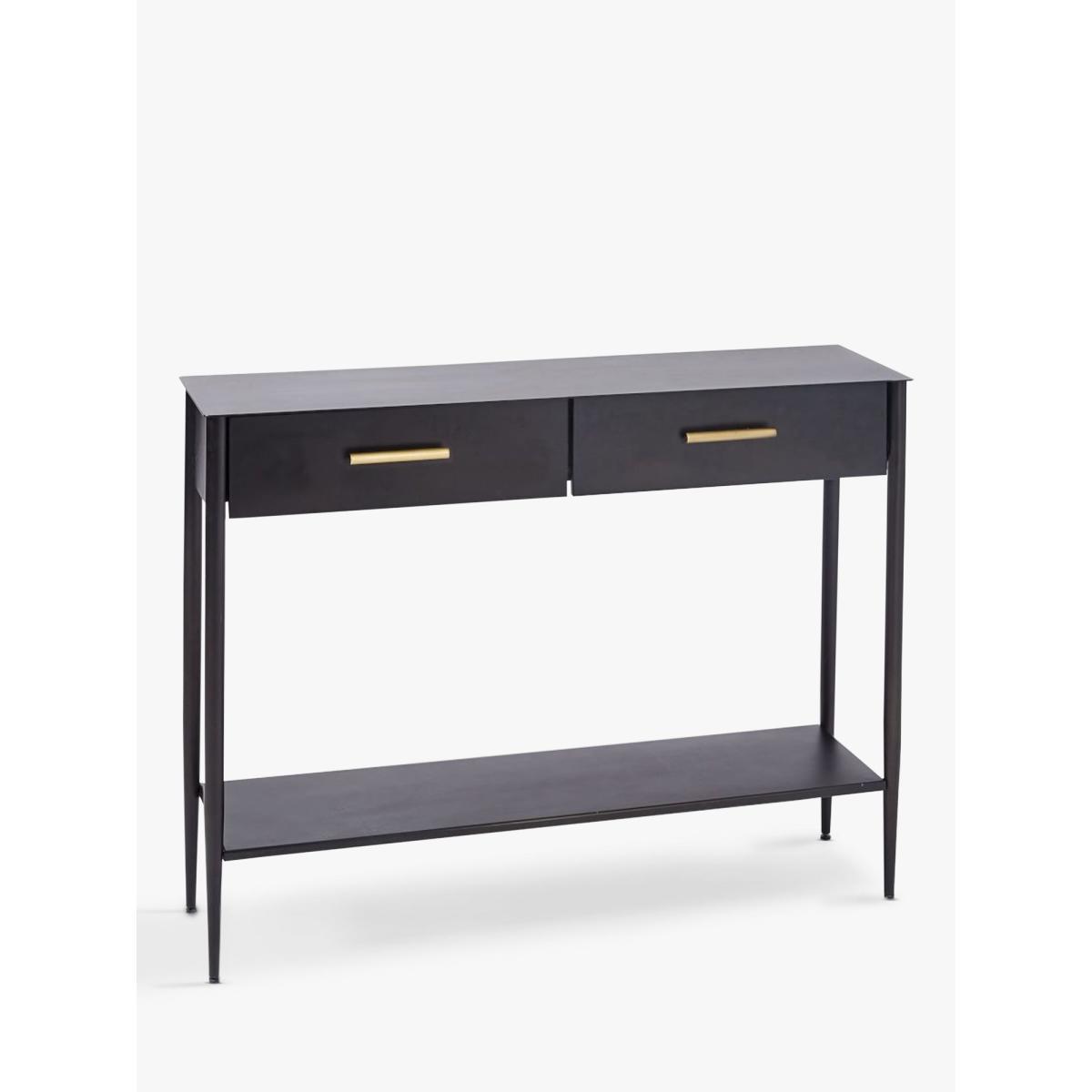 West elm's Metalwork collection has a cool, industrial edge and offers furniture made from hot-rolled steel and finished with brass-effect metal. This console table is brilliant in hallways or living spaces and has two handy storage drawers and a lower shelf. Its sleek, simple, clean-lined design blends modern-industrial styles, making it easy to style in your own space. You might see natural variations in the tone and texture of the table due to its finish, but this ensures each one is unique. Want to see it first? You may want to see and get a feel for the furniture in one of our shops before ordering. We'll be able to tell you where the range you'd like to view is on display.