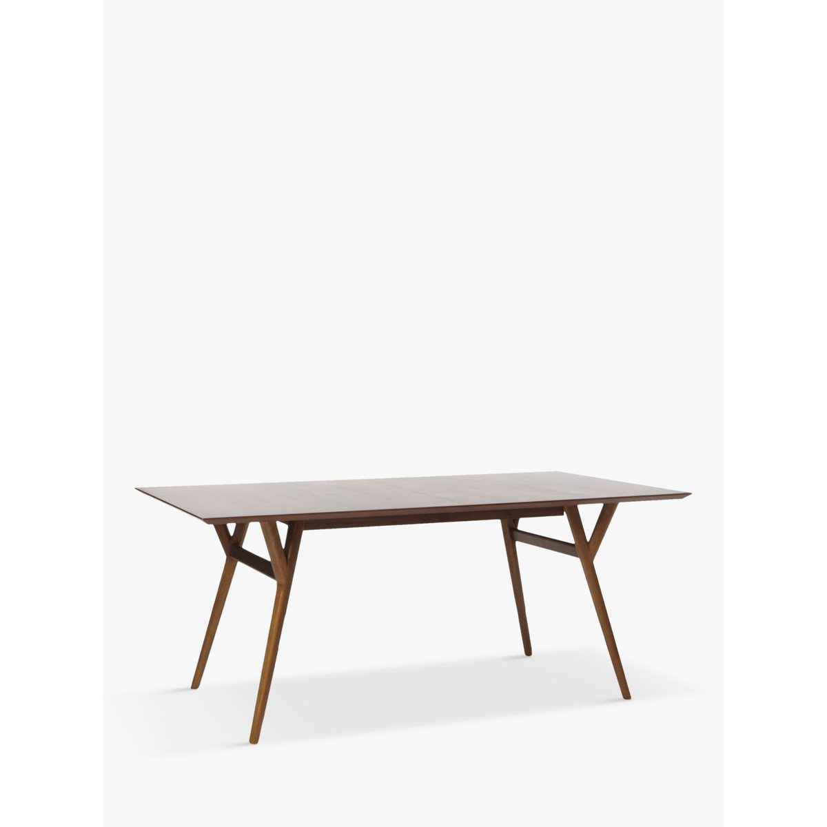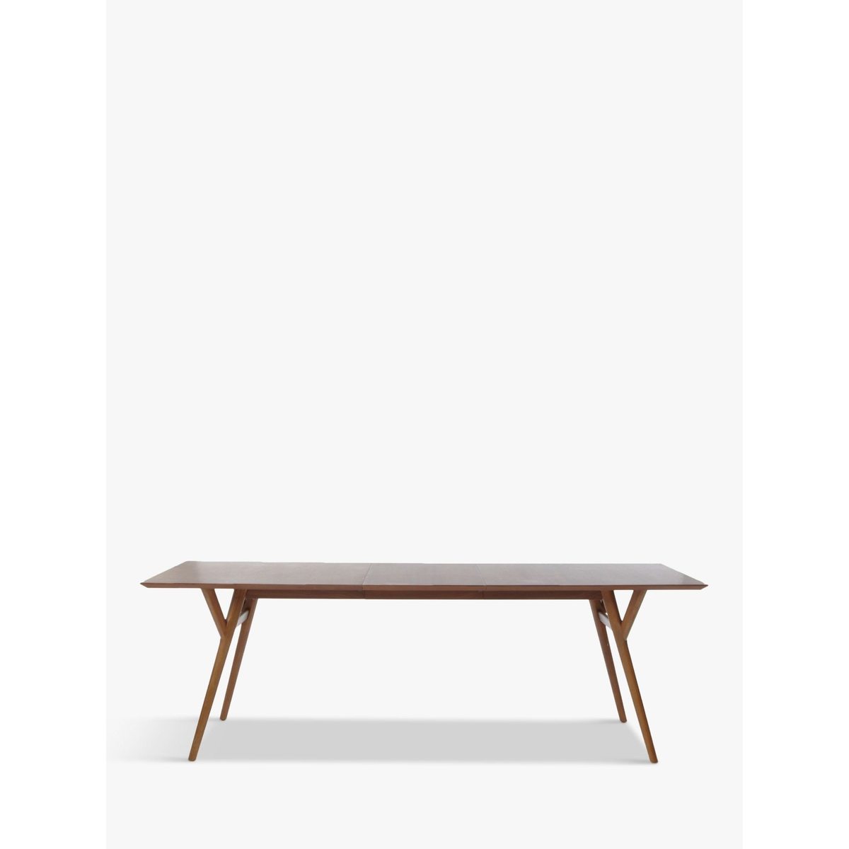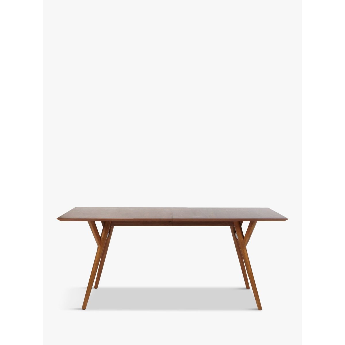 With its pared back design and clean lines, the Mid-Century dining table will take you back to a bygone era with its bevelled edges and warm walnut veneer surface. Expanding to fit up to eight diners, it is made from a durable and hardy solid eucalyptus wood, and features an extension leaf which can be stored away when not in use. Please note: not all our ranges are on display in our shops. For more information, please speak to a furniture Partner in store, or call 03452 661805 and we can tell you where the range you'd like to view is on display.