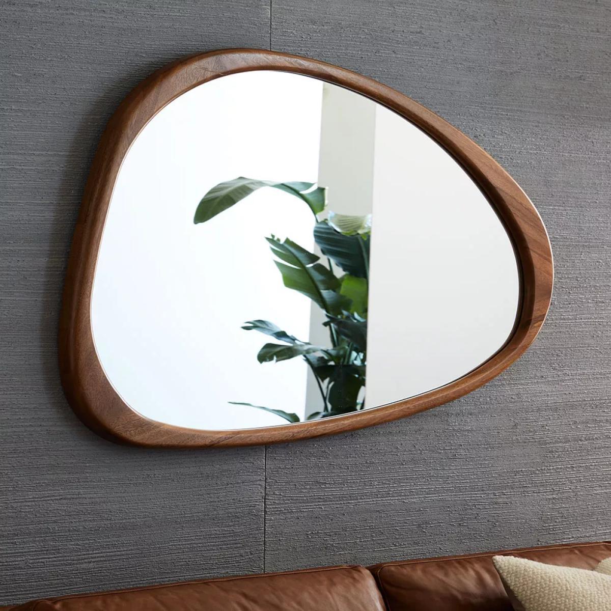 I love this one for its distinctive asymmetrical shape which lends a modern yet timeless feel. It works particularly well in mid-century inspired interiors or contemporary spaces that embrace clean lines with a touch of warmth. The wooden frame adds natural texture, making it versatile for both cosy living rooms and hallway displays. Practical styling tips include pairing it with minimal accessories or layering with other natural materials like rattan or soft textiles to create a balanced look. When hanging, consider placing it above a console or sideboard to serve as a focal point, or use it in an entryway to add a welcoming touch while maximising mirror functionality.