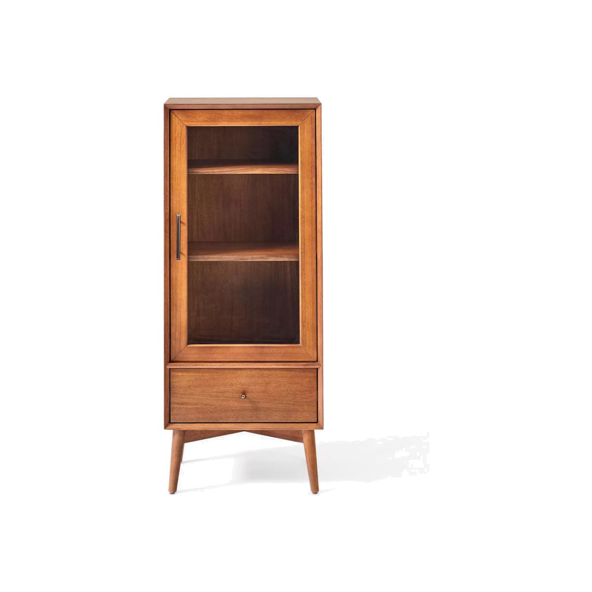 With a distinctly Mid-Century design, this storage cabinet is made from sturdy wood in a water-based finish. The panelled-glass door lightens the frame and inside there are two adjustable shelves to keep toiletries and spare towels within easy reach. There's also a useful storage drawer. Want to see it first? You may want to see and get a feel for the furniture before ordering. Pop into one of our shops to see the full range of colours and fabrics on offer. We'll be able to tell you where the range you'd like to view is on display.