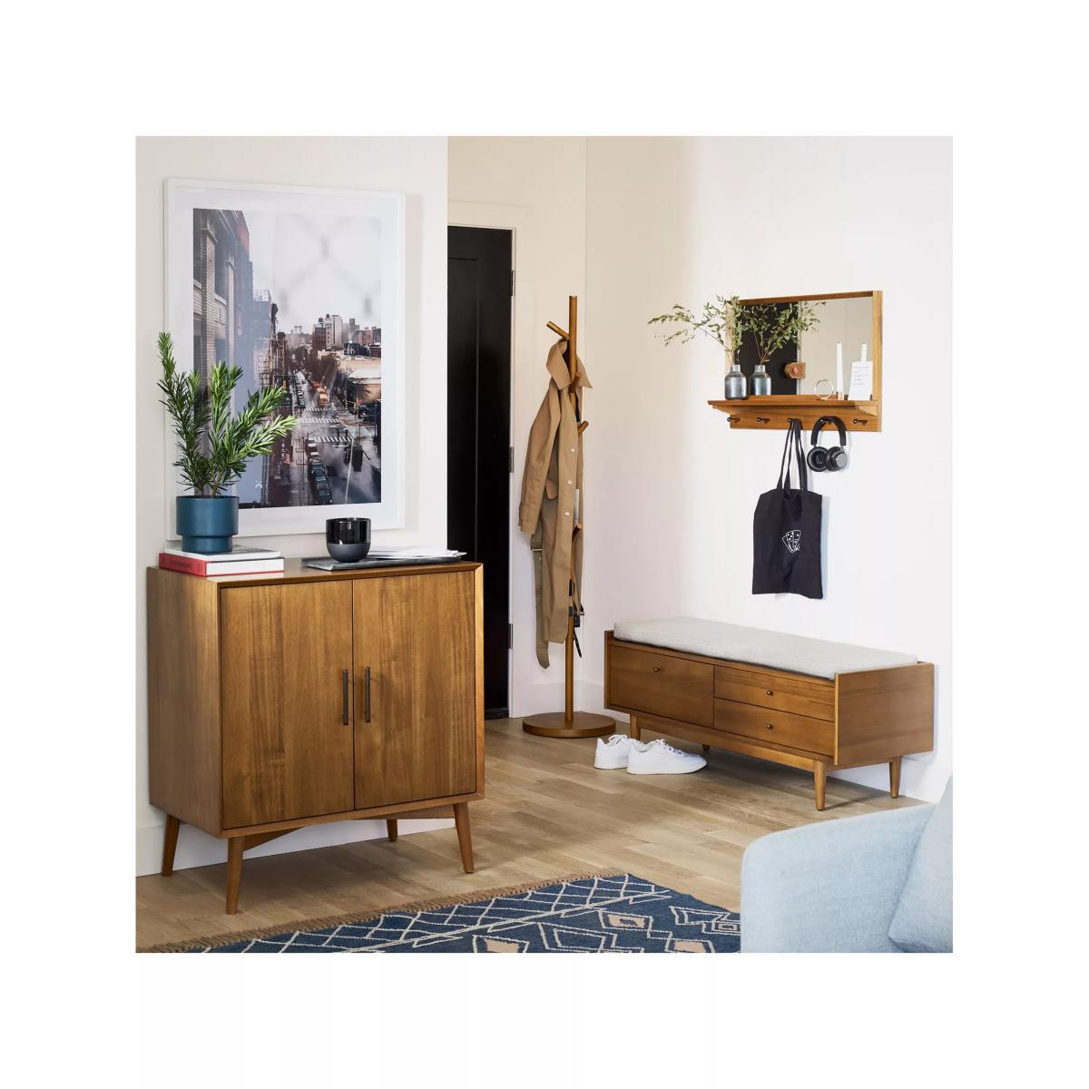 The slender shape of west elm's Mid-Century coat rack lends contemporary design to functional appeal. Perfect for fitting into any space, its crafted from solid wood in an acorn finish, while its hooks boast an antique-brass tip that offers a fine extra layer of detailing. Please note: not all our ranges are on display in our shops.