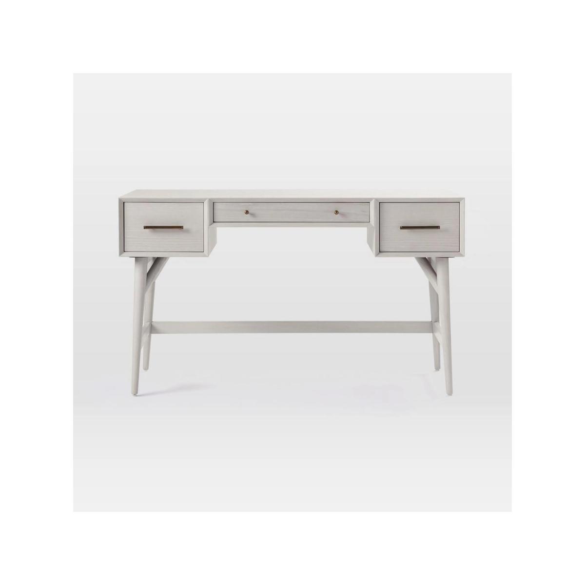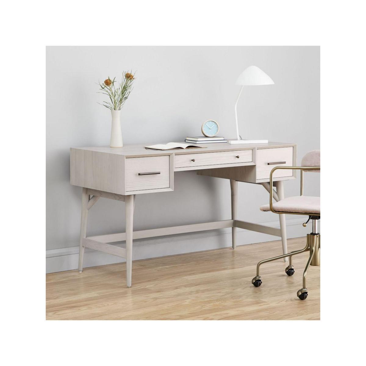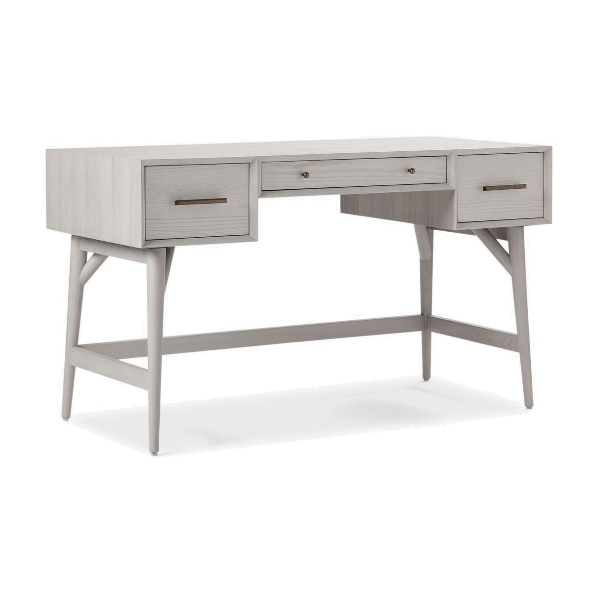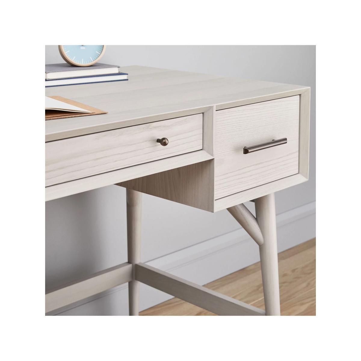 I love this desk for its clean, mid-century aesthetic that brings timeless style to both home offices and living spaces. It works particularly well in interiors with Scandi or retro-modern themes, offering a calm, understated look that complements natural materials like wood, linen, or wicker. To style it effectively, consider adding organisational elements such as minimal stationery trays or decorative accessories that don’t clutter the surface. Practical touches like a sleek desk lamp or a small plant can create a welcoming and productive workspace. Its neutral colour makes it versatile for pairing with coloured or patterned upholstery, making it a flexible piece that can anchor a variety of room styles.