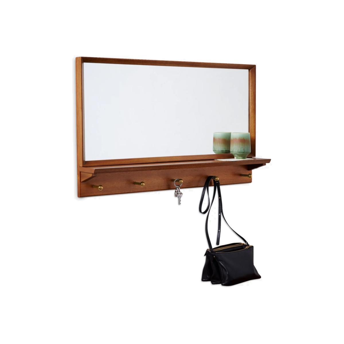 I love this entryway mirror for its clean, mid-century design and warm pecan finish, which makes it versatile for both modern and vintage-inspired interiors. It works particularly well in small or functional spaces like hallways, where a mirror can help maximise light and space. Practical styling tips include using the lower shelf for essentials like keys or mail, and hanging a small basket or tray for organisation. The hook and ledge design make it easy to keep daily items close at hand while maintaining a tidy look. Its timeless wood tone can complement neutral palettes or add warmth to more colourful schemes. Overall, it’s a practical, stylish piece that balances form and function effortlessly.