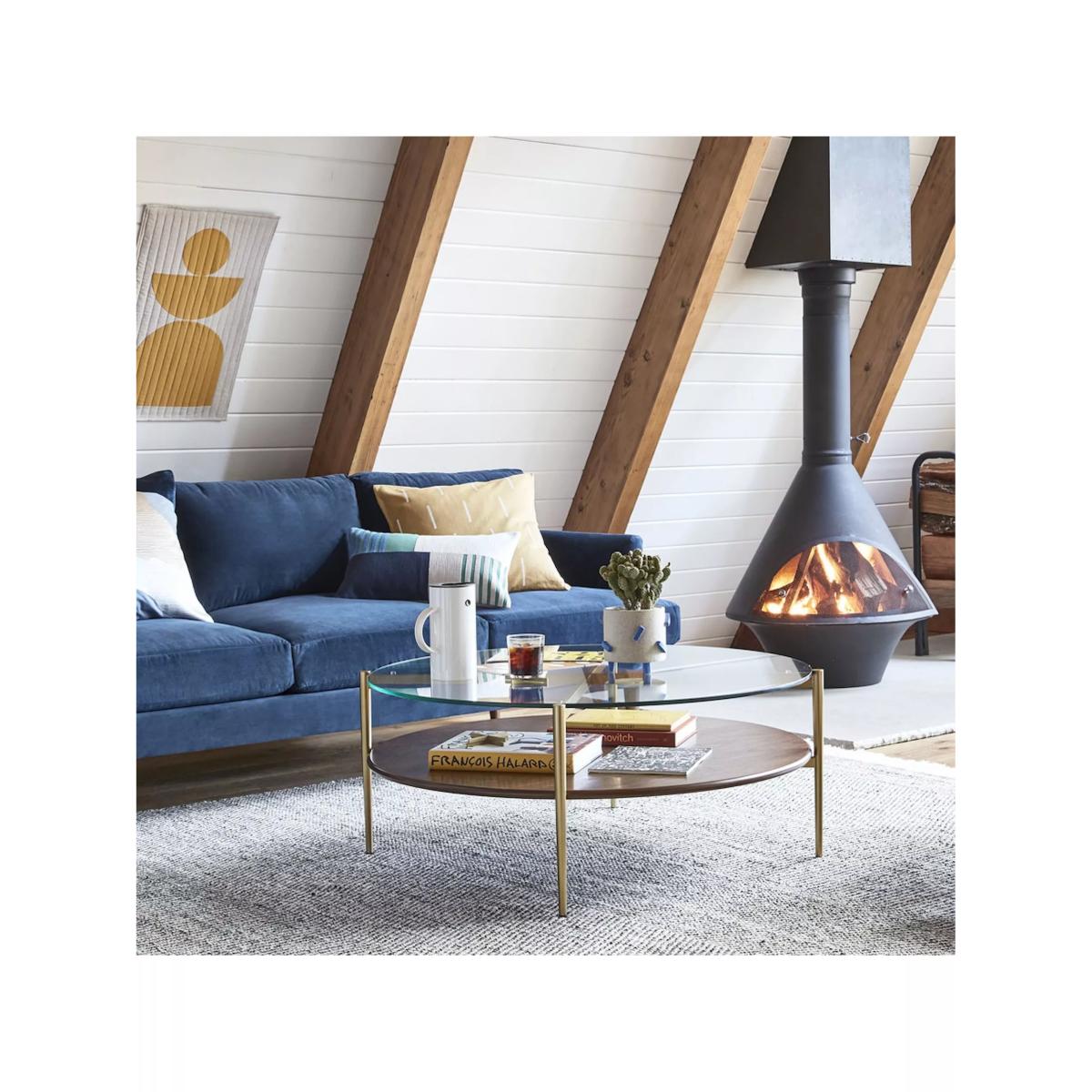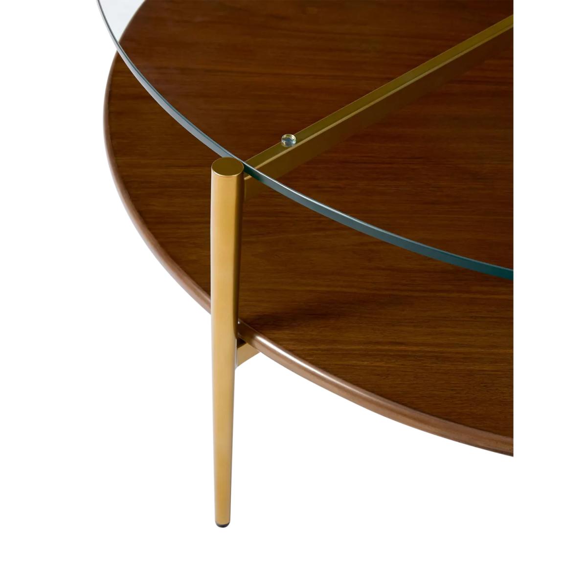 I’m really fond of this mid-century round coffee table for its blend of warm walnut, slim antique-brass legs and a clear glass top - it reads as both light and luxe. It suits modern, Scandinavian or retro-inspired living rooms, especially when paired with a low-pile rug and a simple sofa in neutral tones. Styling wise, use the glass surface for a sculptural candle or a couple of art-books arranged on a small tray, then balance it by placing a ceramic bowl or a stack of magazines on the lower wooden shelf. The open design keeps sightlines clear, so the table feels airy even when you’ve got drinks or display pieces on it.