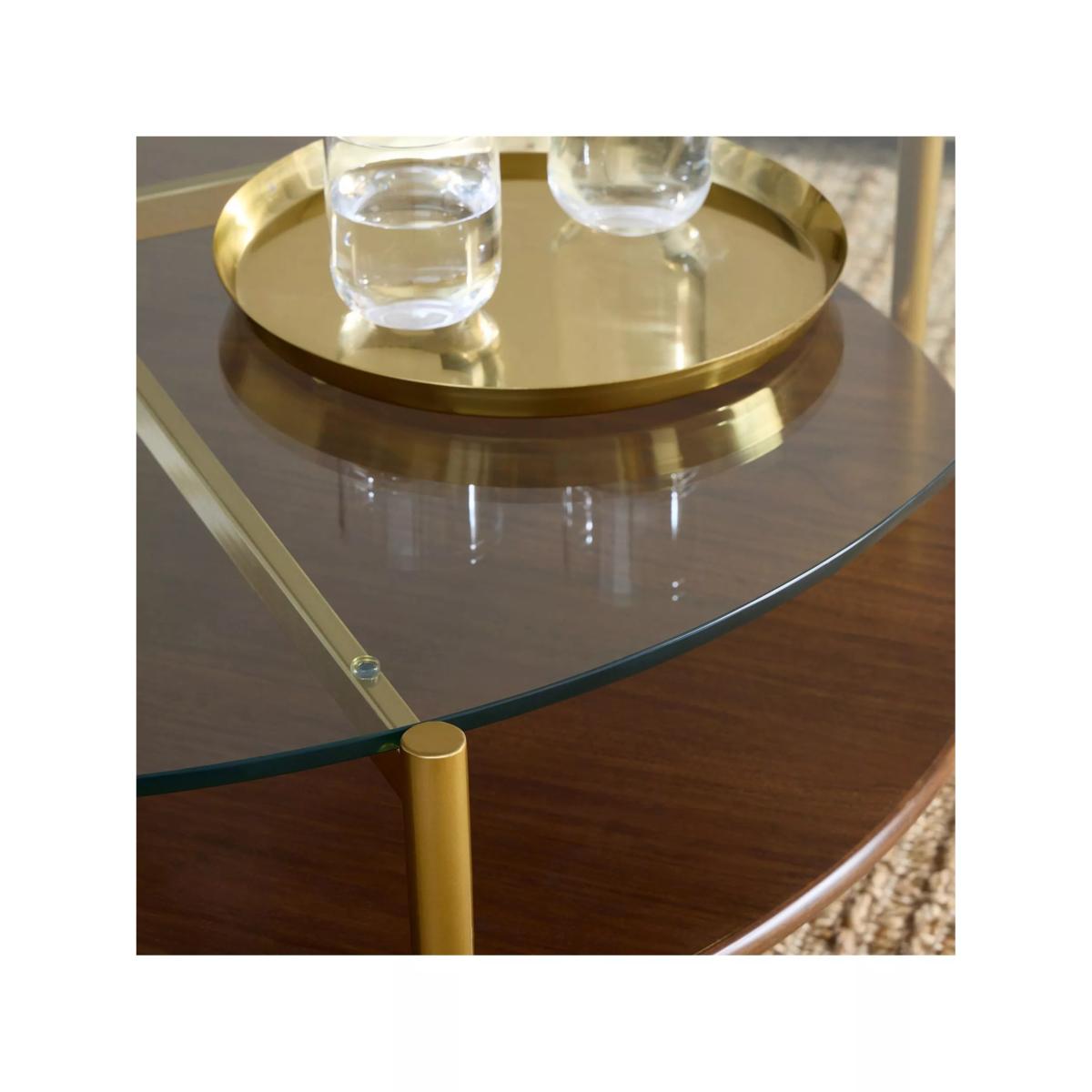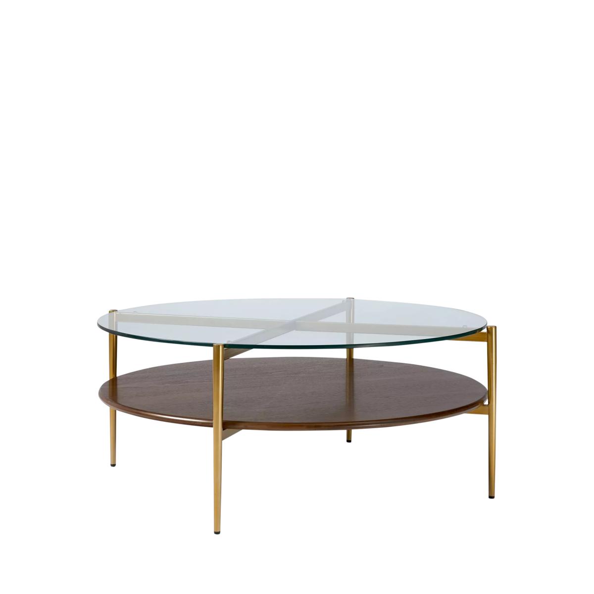 Two-tiered Art Display Coffee Table doubles down on mid-century style and storage space with its clean lines, walnut finish and airy glass top. An open shelf offers room for baskets and your favourite reads. Tempered glass top Walnut veneer over an engineered wood bottom shelf Metal frame in an Antique Brass