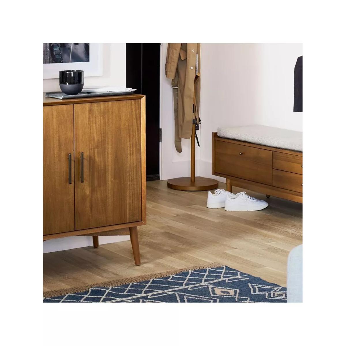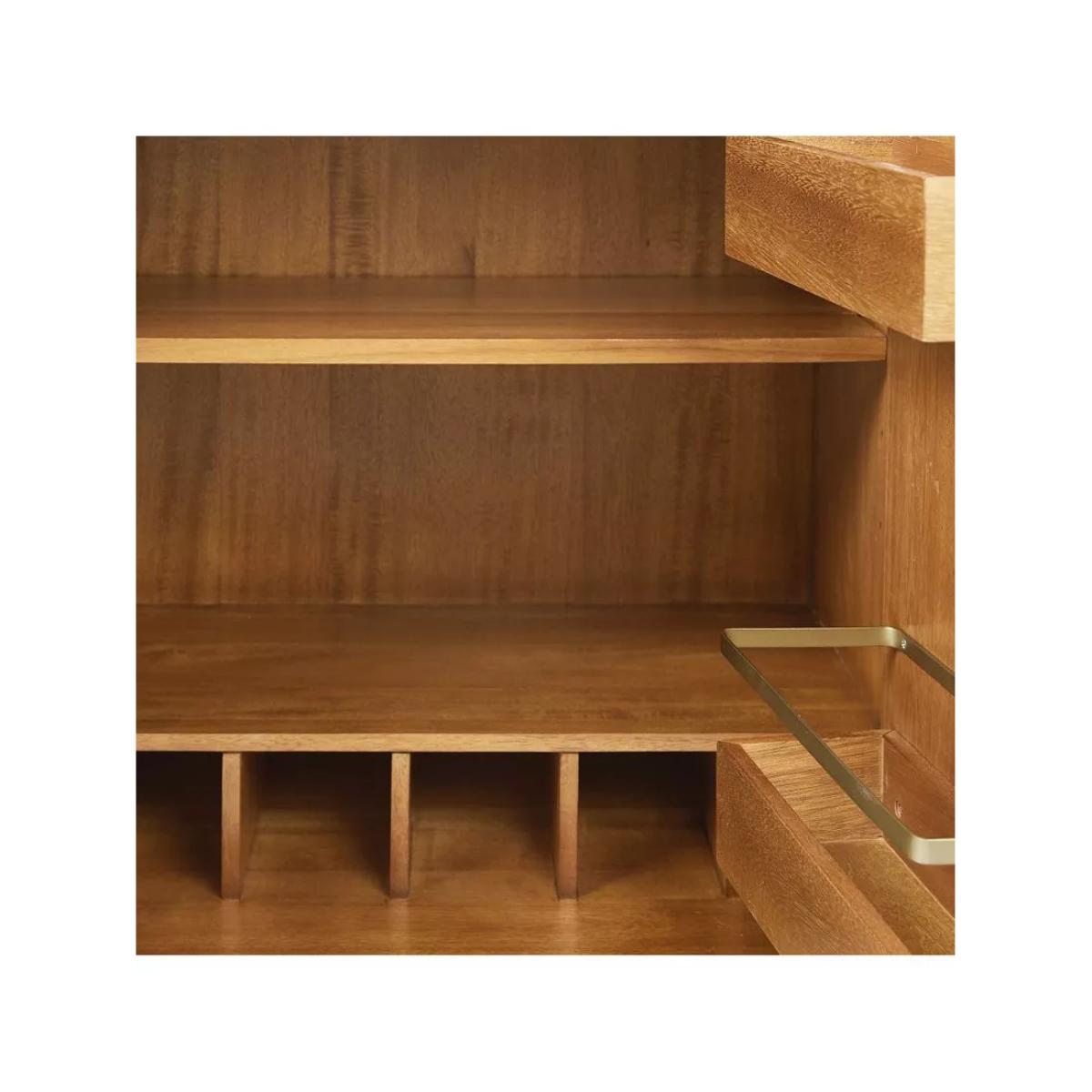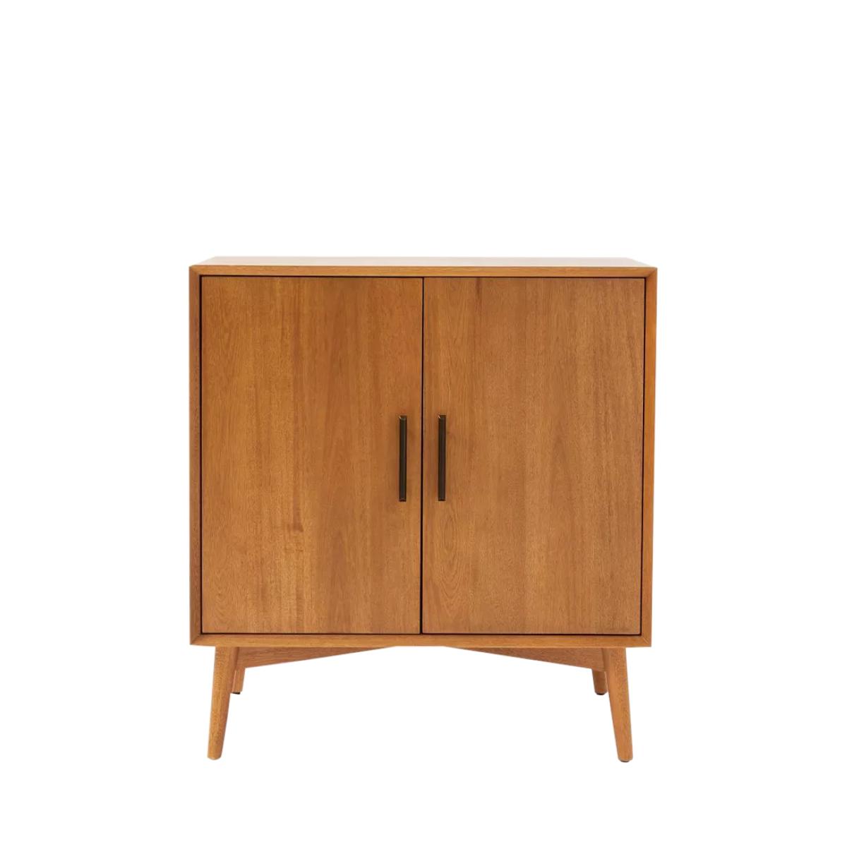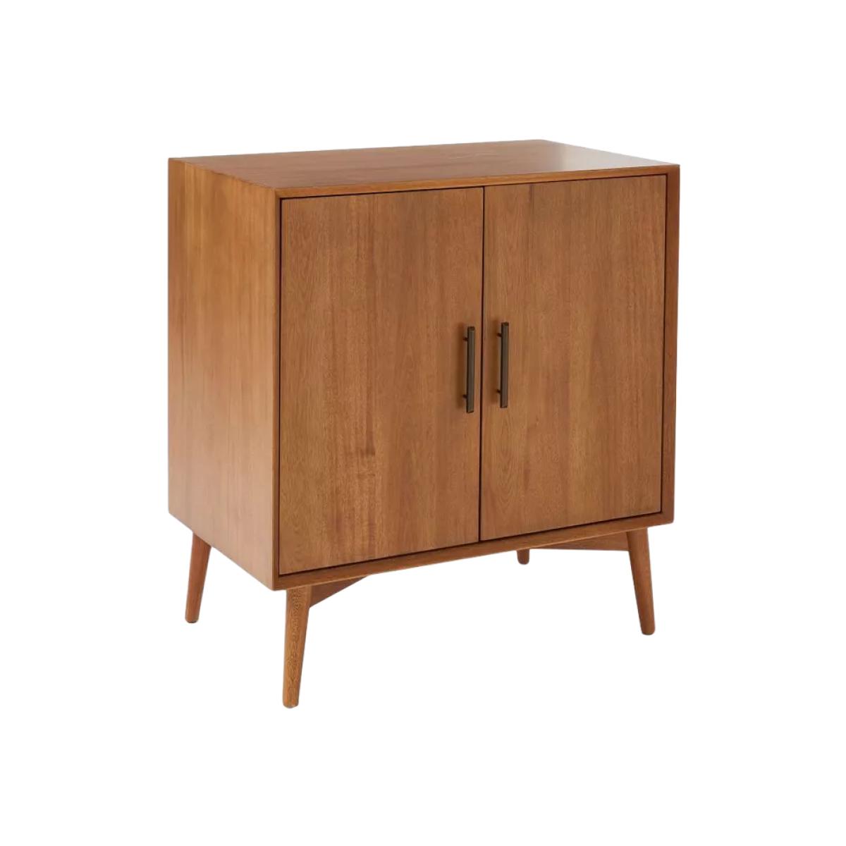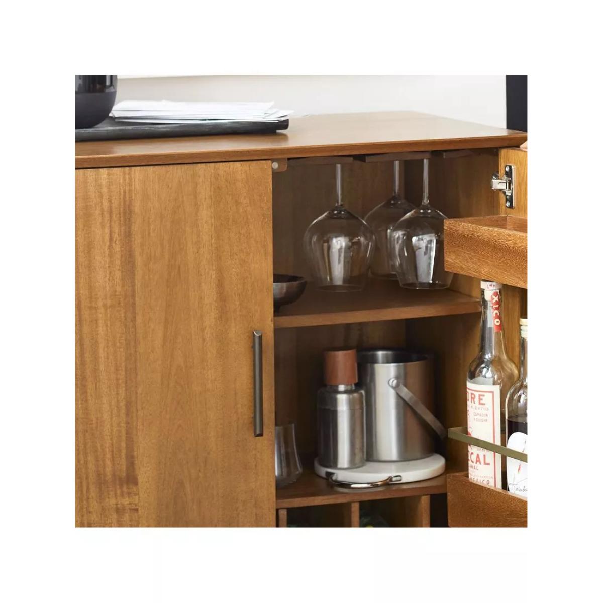 Inspired by iconic '50s and '60s furniture design with its tapered legs, angular base and bevelled front edges. Handsome storage for cocktail and barware essentials, in classic, retro style. Sizeable cabinet holds everything from glassware and mixers to accessories to serveware Two cubbies inside each door and storage for wine glasses and bottles Wine rack holds seven bottles Natural variations in wood colour and grain make each piece one of a kind Kiln-dried solid eucalyptus wood and engineered wood with an Acacia wood veneer Metal hardware in an Oil-Rubbed Bronze finish Made with FSC®-certified wood from responsibly managed forests All wood is kiln-dried for added durability Made in a Fair Trade Certified™ factory, empowering workers who made it GREENGUARD Gold Certified. This low-emitting product has been screened for over 10,000 chemicals and VOCs By choosing this product you are supporting responsible management of the world's forests. The Forest Stewardship Council® (FSC®) is a global, not-for-profit organisation that helps take care of forests and the people and wildlife that call them home. To learn more, visit www.fsc.org.