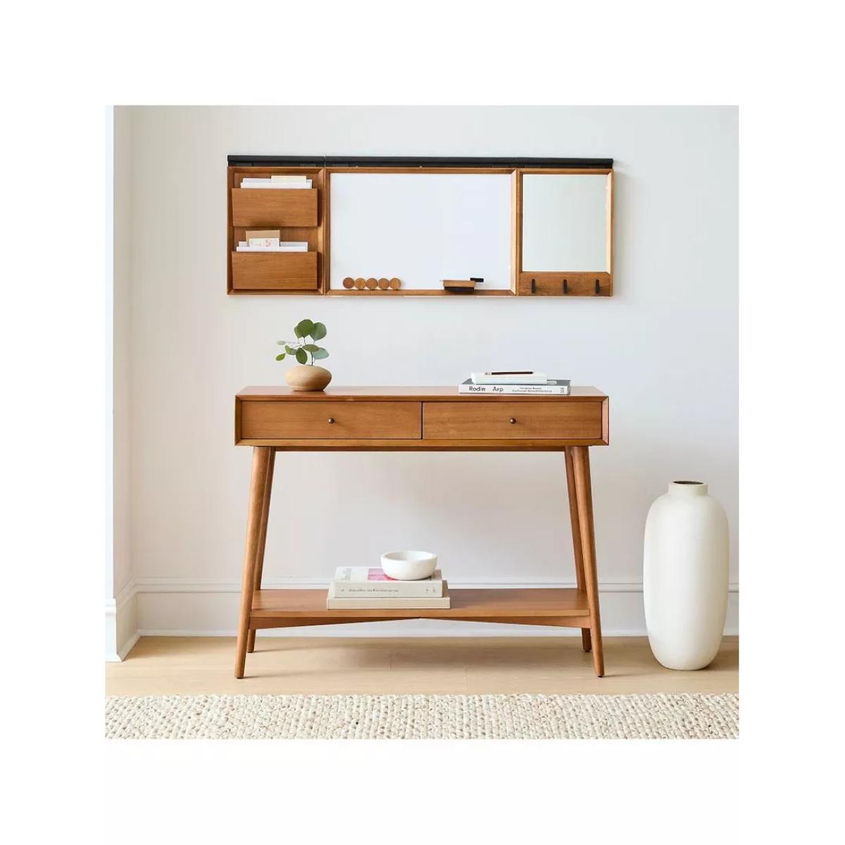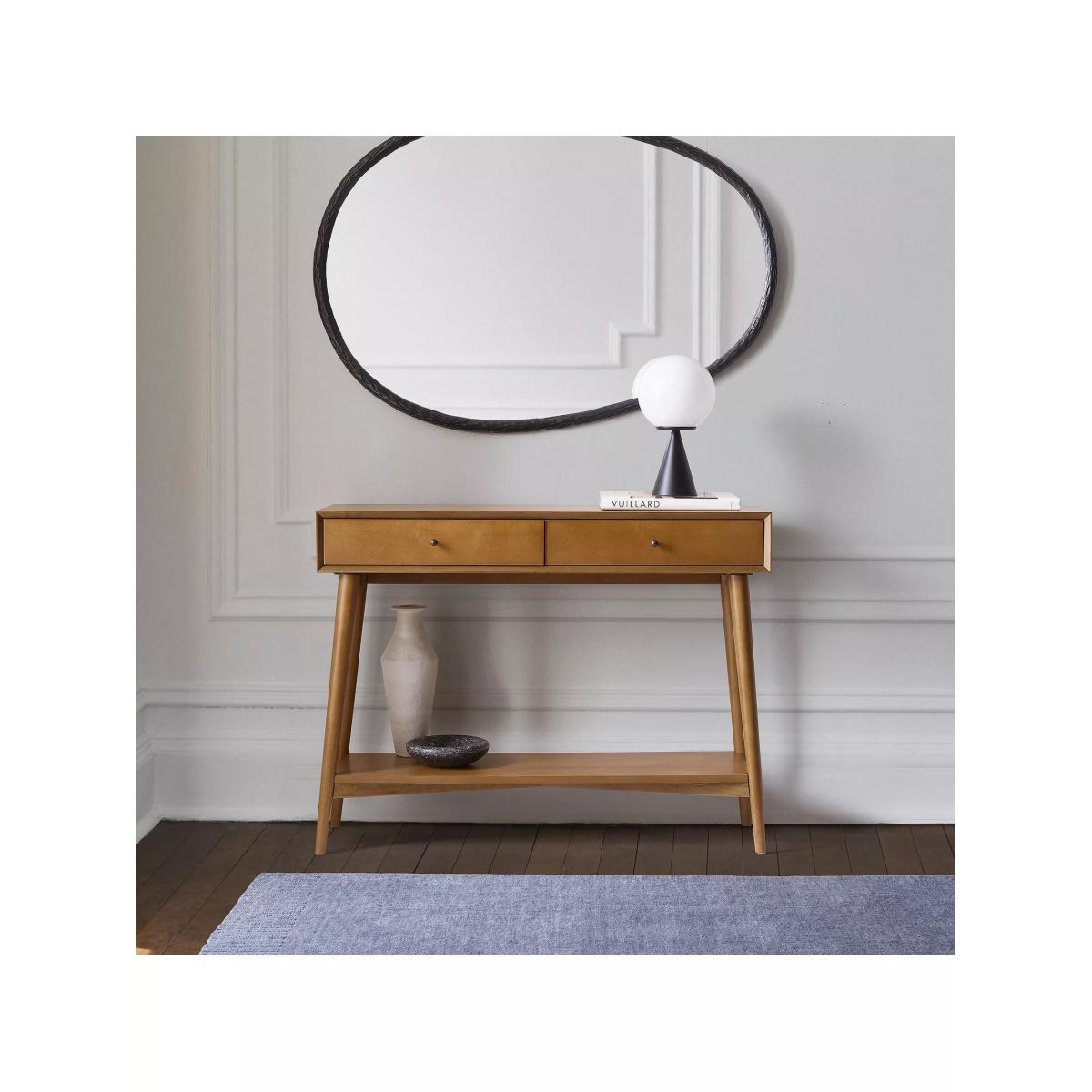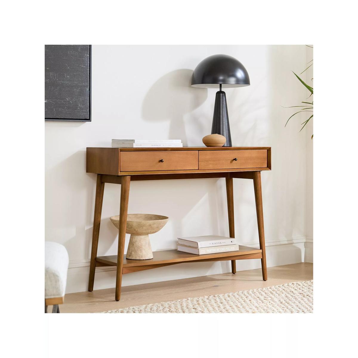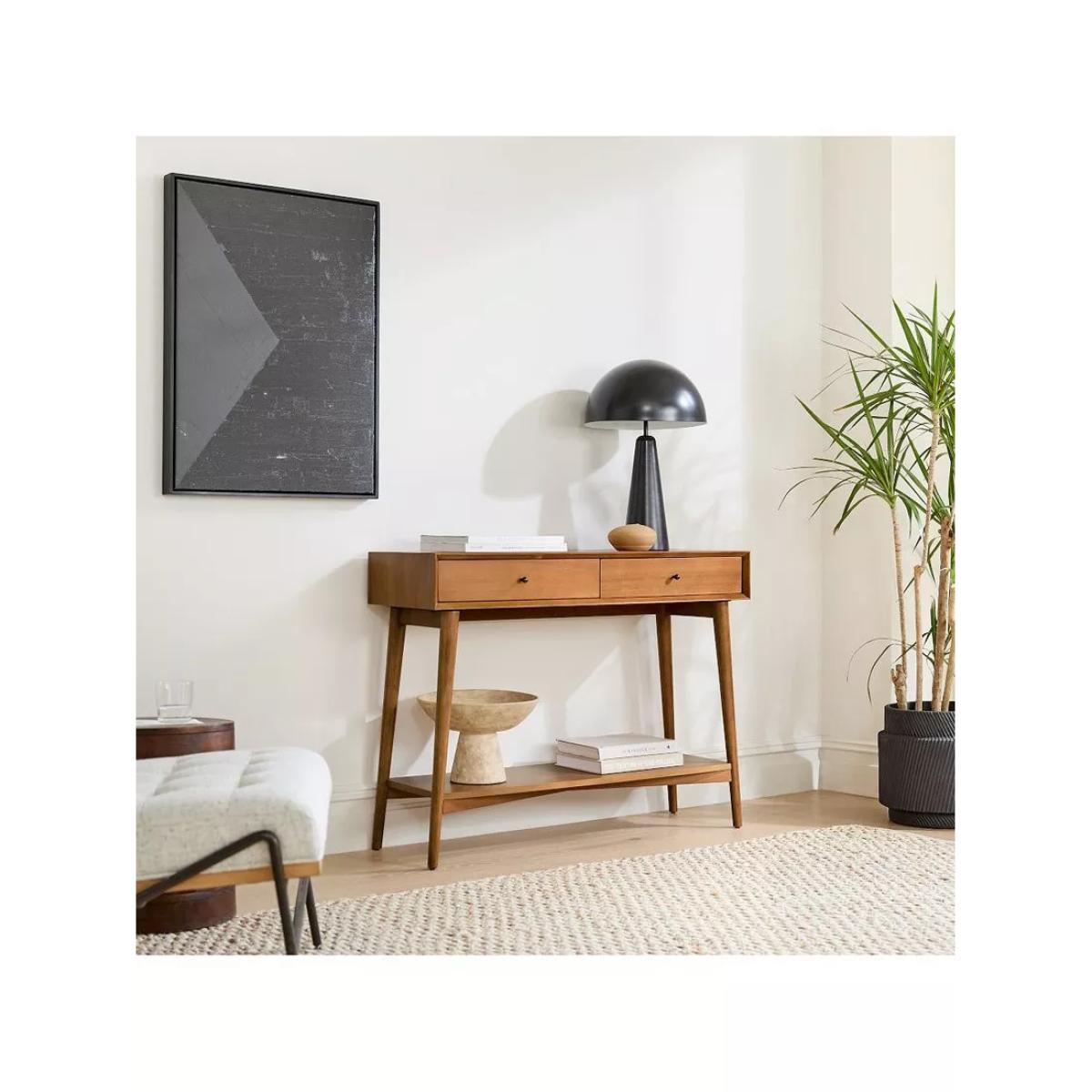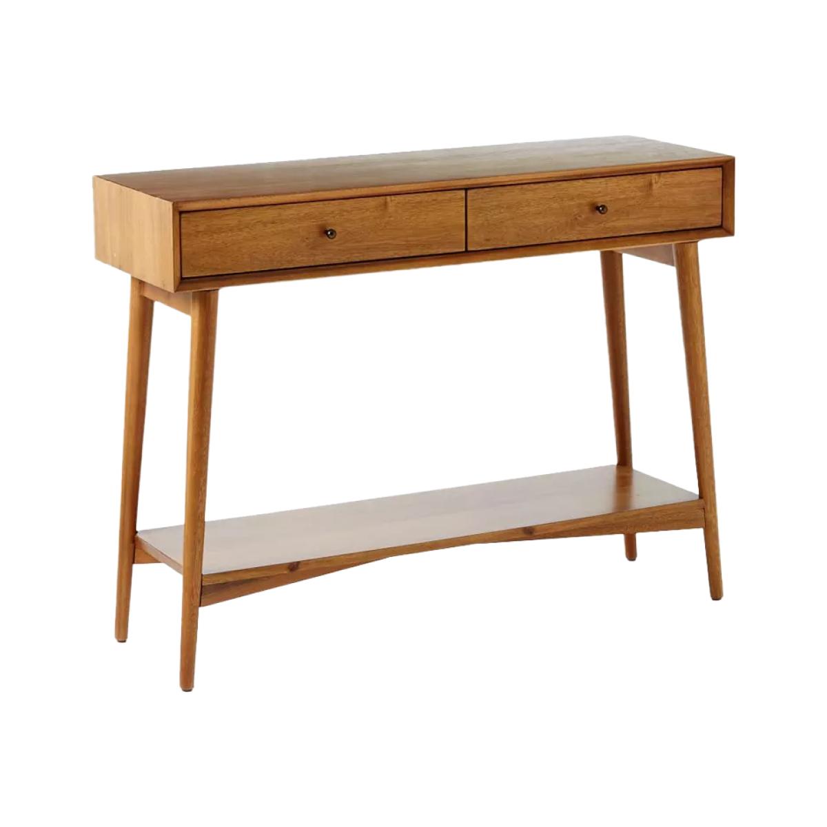 Inspired by iconic '50s and '60s furniture design with its tapered legs, angular base and bevelled front edges. Fitted with drawers and an open shelf, it keeps your entryway or living room stylishly organised. Two drawers open smoothly on solid wood glides Natural variations in wood colour and grain make each piece one of a kind Kiln-dried solid eucalyptus wood and engineered wood with an Acacia wood veneer Metal hardware in an Oil-Rubbed Bronze finish. All finishes are water-based Made with FSC®-certified wood from responsibly managed forests All wood is kiln-dried for added durability Made in a Fair Trade Certified™ factory, empowering workers who made it By choosing this product you are supporting responsible management of the world's forests. The Forest Stewardship Council® (FSC®) is a global, not-for-profit organisation that helps take care of forests and the people and wildlife that call them home. To learn more, visit www.fsc.org.