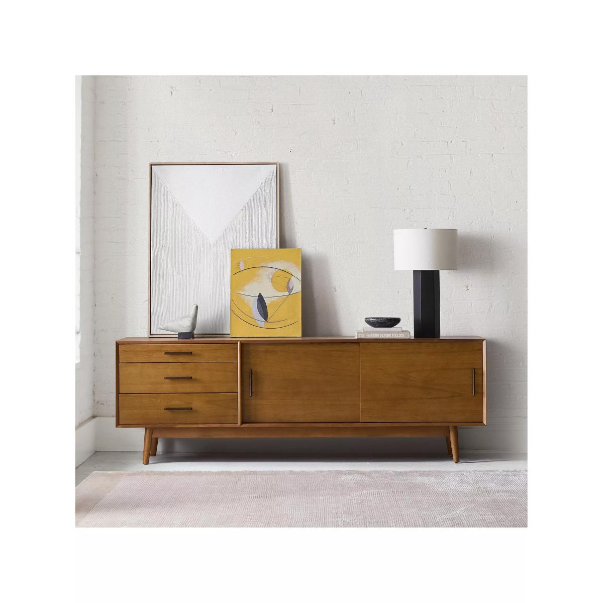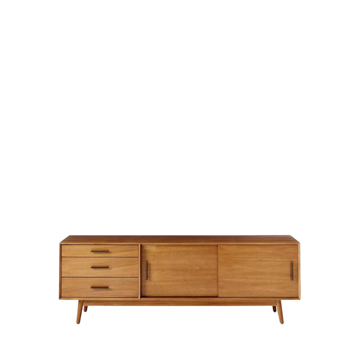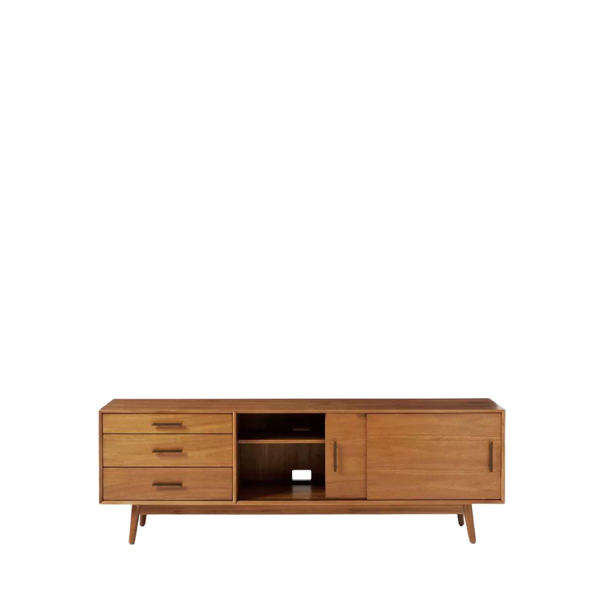Inspired by iconic '50s and '60s furniture design with its tapered legs and bevelled front edges. Fitted with drawers and a spacious cabinet, no matter which room you place this versatile piece in, it's a chic storage solution. Three drawers open smoothly on metal glides Adjustable shelves Accommodates a flat-screen TV up to 203cm with a maximum weight of 61kg Cut-out opening at back for cord management Natural variations in wood colour and grain make each piece one of a kind Solid eucalyptus wood and engineered wood with an Acacia wood veneer Metal hardware in an Oil-Rubbed Bronze finish. All finishes are water-based Made with FSC®-certified wood from responsibly managed forests All wood is kiln-dried for added durability Made in a Fair Trade Certified™ factory, empowering workers who made it GREENGUARD Gold Certified. This low-emitting product has been screened for over 10,000 chemicals and VOCs By choosing this product you are supporting responsible management of the world's forests. The Forest Stewardship Council® (FSC®) is a global, not-for-profit organisation that helps take care of forests and the people and wildlife that call them home. To learn more, visit www.fsc.org.