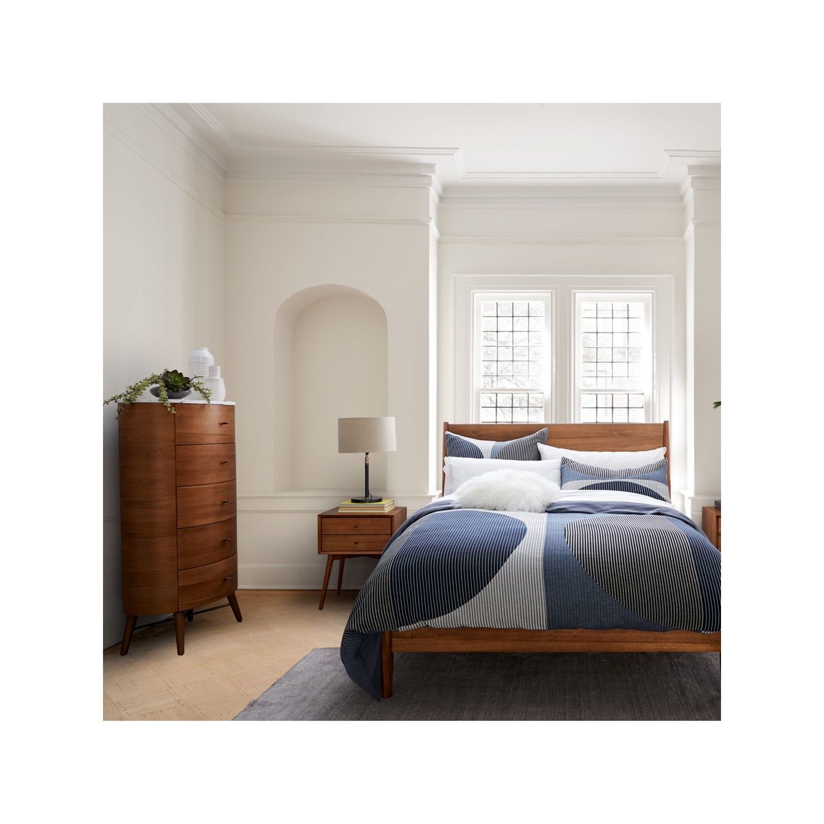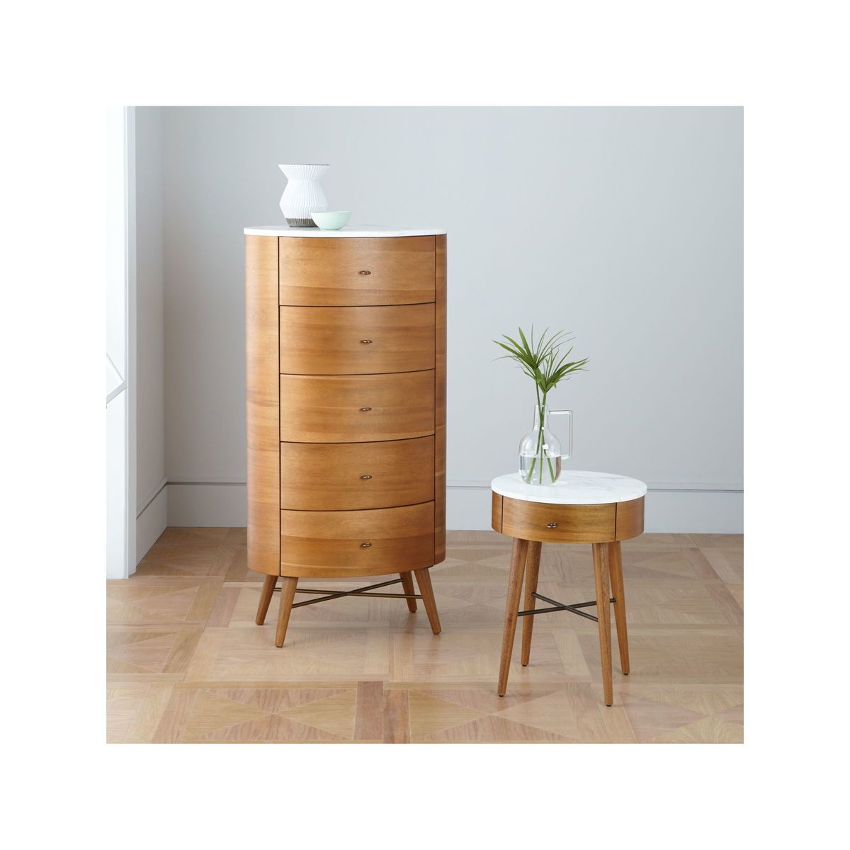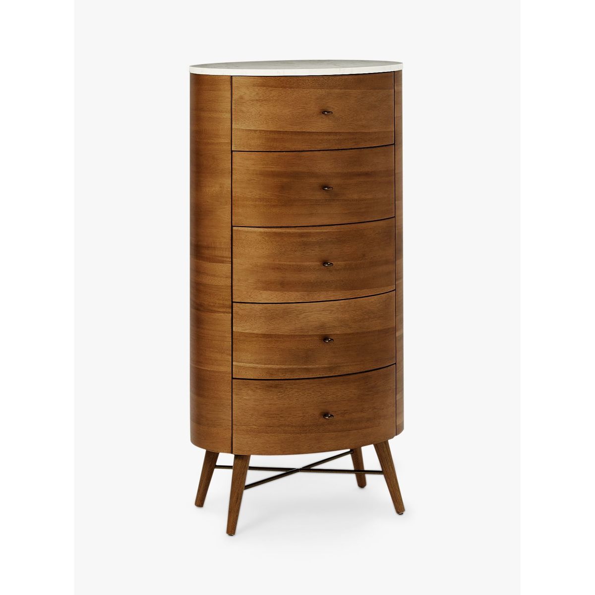 Invest in a statement storage piece with west elm's Penelope chest of drawers. Taking mid-century design influences, this rounded piece is designed with a solid wood frame and natural marble top. Offering generous storage thanks to 5 drawers, its retro profile is accented with antique-bronze finished hardware that lends warmth and tactility to the design.