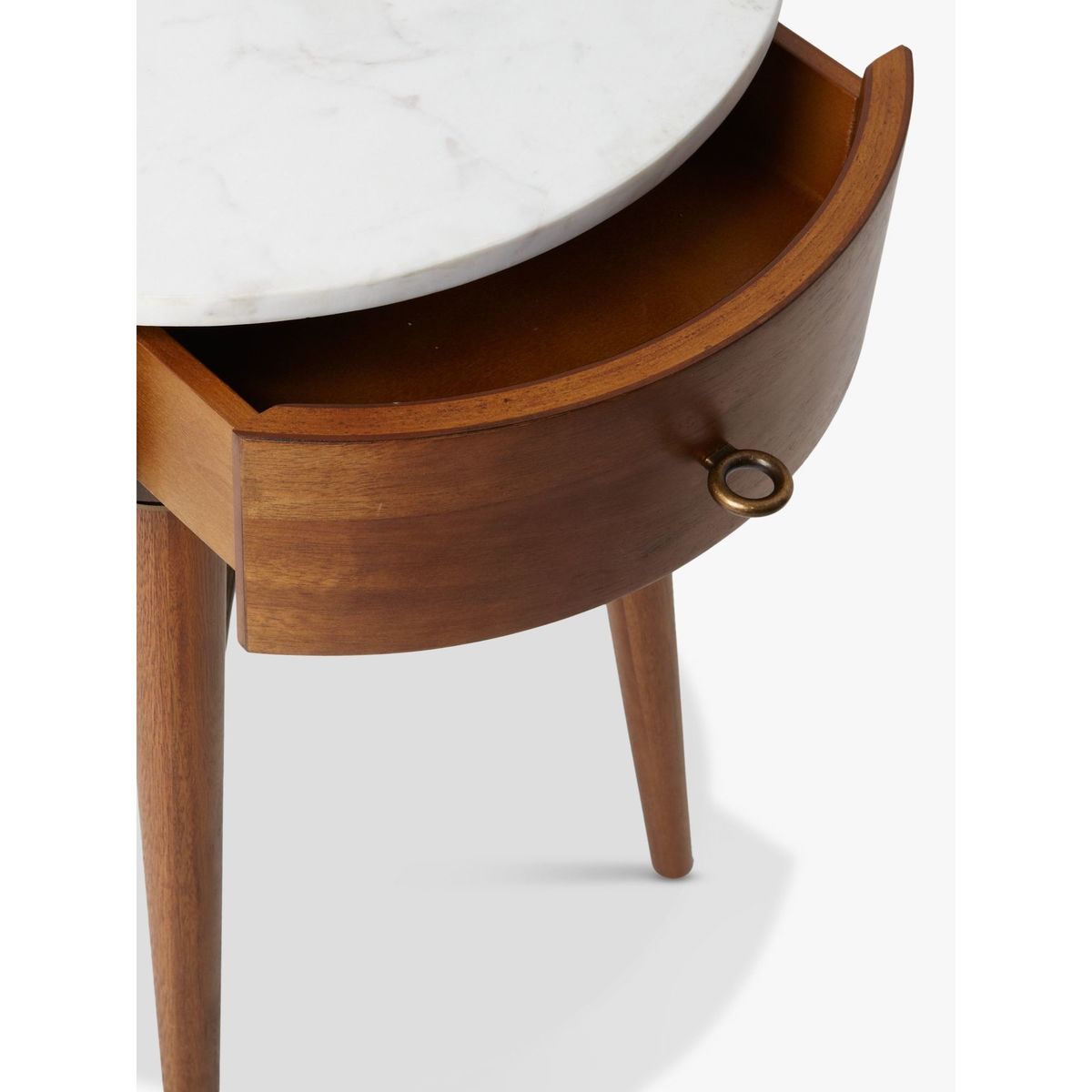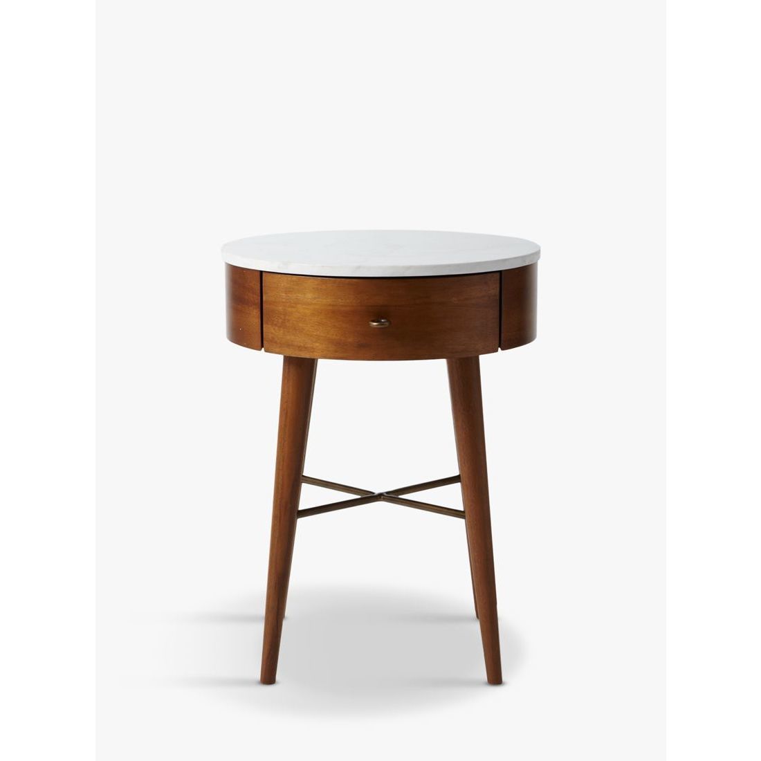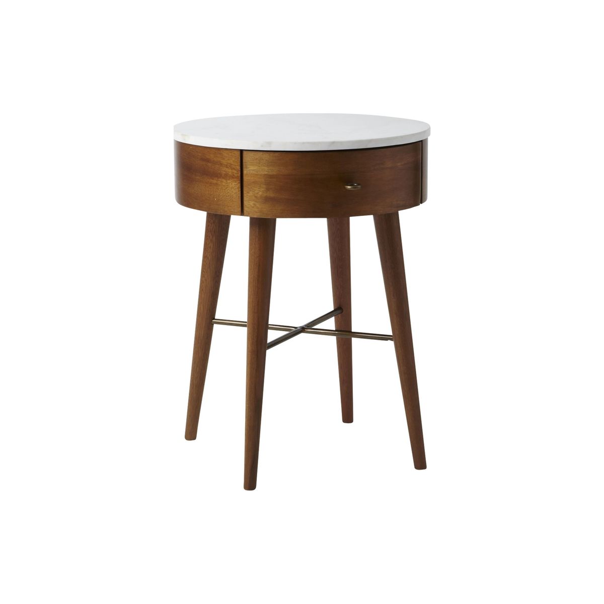 Invest in statement elegance with west elm's mid-century inspired Penelope bedside table. Well-rounded, its smooth shape sits on sleek tapered legs and houses a single spacious drawer, ideal for stashing your sleep space essentials. The solid marble top gives the design cool contrast, while providing a stylish spot to stack books and magazines close at hand. Finally, antique bronze finished hardware adds warmth and additional tactility to a piece that oozes ageless appeal.