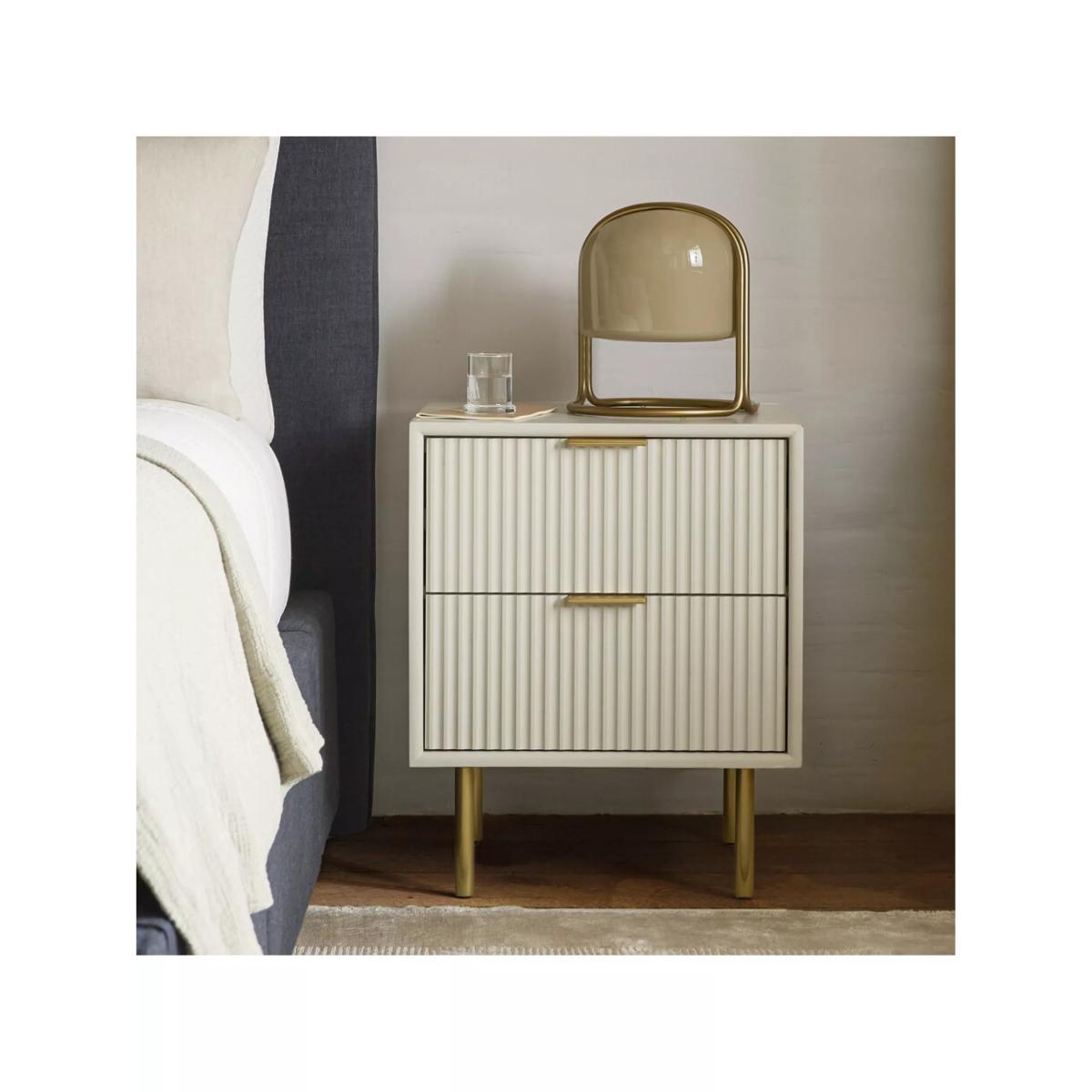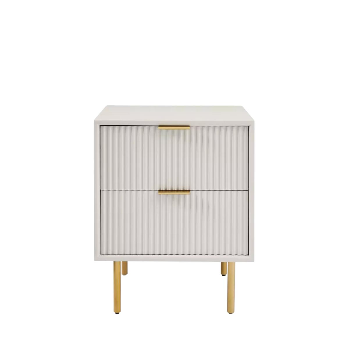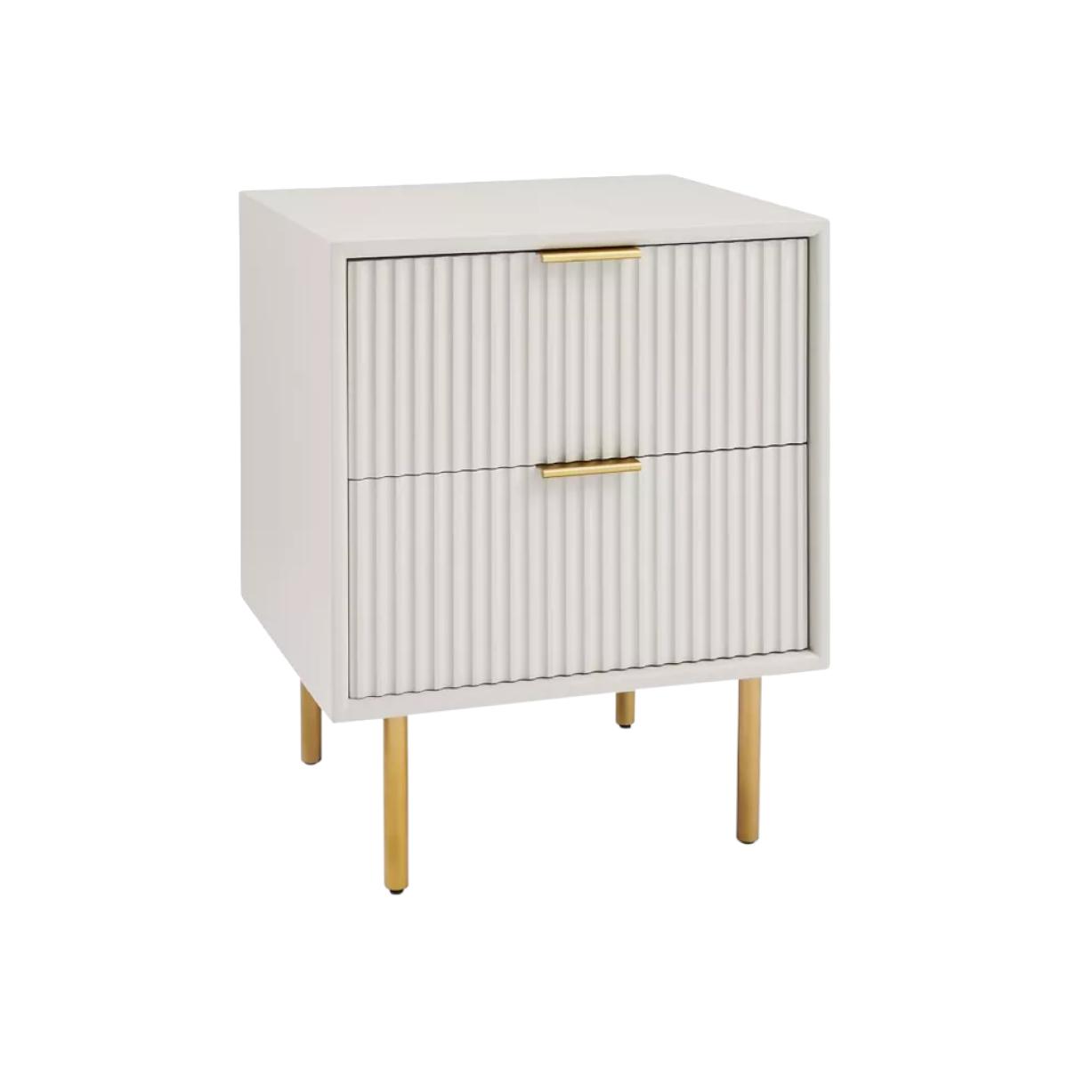 Bright and glamorous, the Quinn Bedside Table stands out with its fluted design and slim metal hardware evoking classic Art Deco design. Streamlined shape with mixed materials with a contrast of smooth lacquer, modern metal and fluted wood Fine fluting: the drawer fronts are made of fluted wood for added dimension Solid mahogany wood Engineered wood drawer fronts and engineered wood sides in a water-based finish Metal hardware in Antique Brass finish Two drawers open smoothly on metal glides. All wood is kiln-dried for added durability