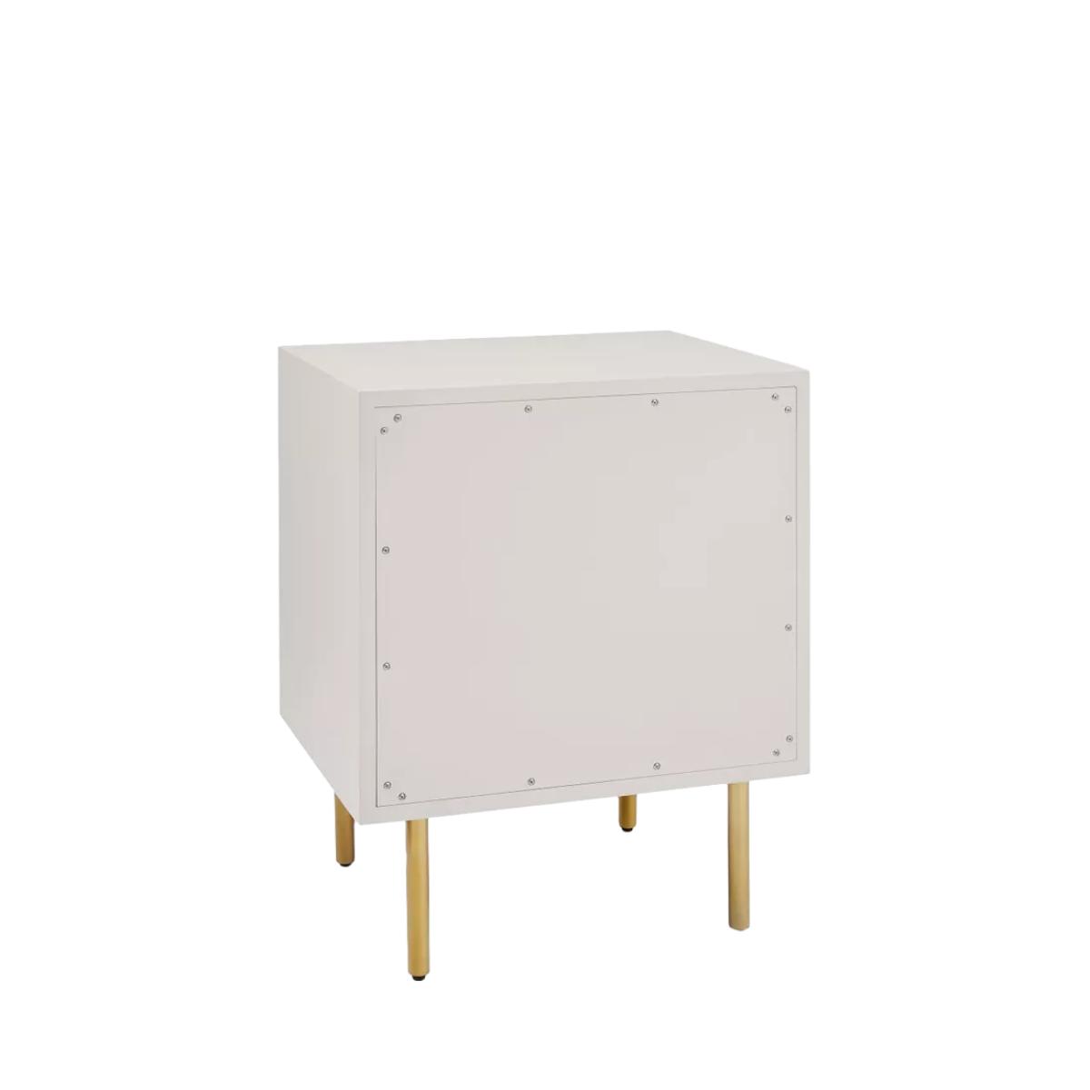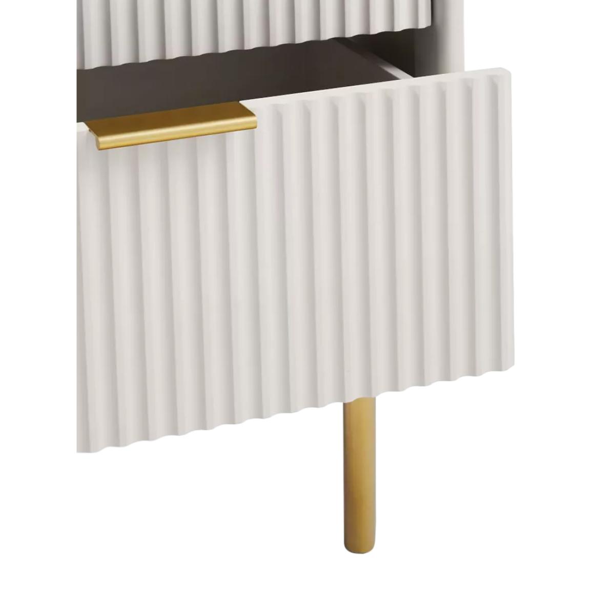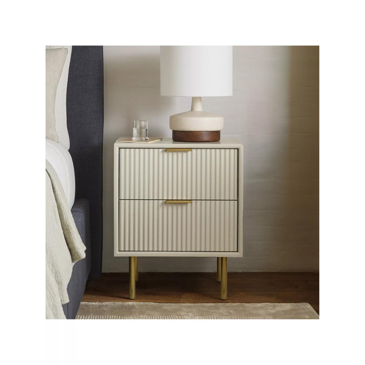 Bright and glamorous, the Quinn Bedside Table stands out with its fluted design and slim metal hardware evoking classic Art Deco design. Streamlined shape with mixed materials with a contrast of smooth lacquer, modern metal and fluted wood Fine fluting: the drawer fronts are made of fluted wood for added dimension Solid mahogany wood Engineered wood drawer fronts and engineered wood sides in a water-based finish Metal hardware in Antique Brass finish Two drawers open smoothly on metal glides. All wood is kiln-dried for added durability