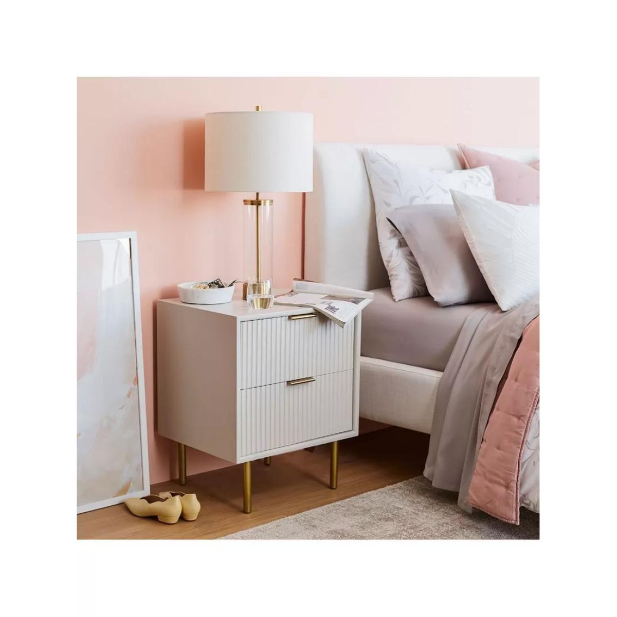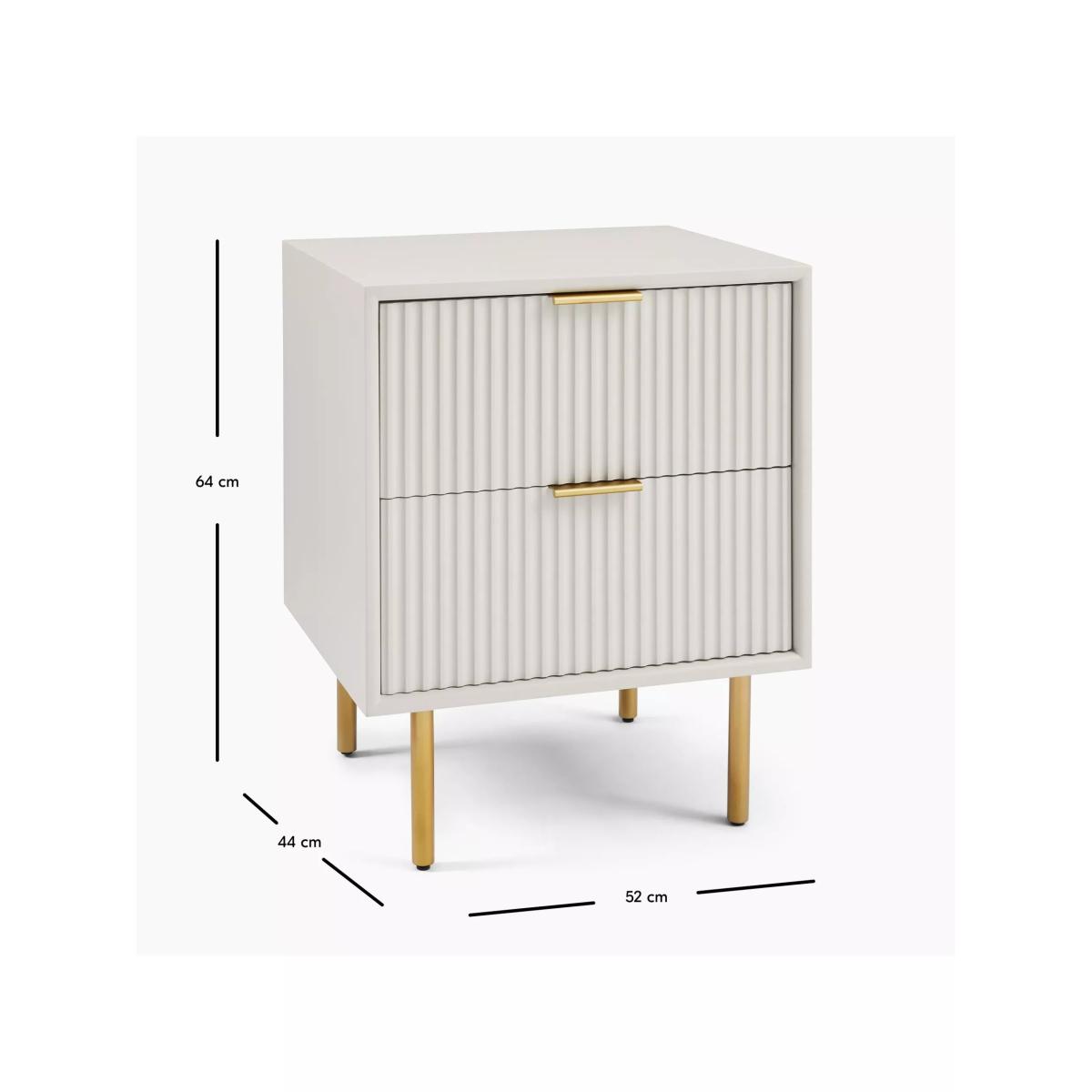 I’m a fan of the Quinn bedside for its clean lines, fluted drawer fronts and slender brass legs - it brings a subtle touch of texture and warmth without dominating the scheme. It’s equally at home in Scandi-inspired, mid-century or modern minimalist bedrooms, and the two soft-close drawers keep bedtime essentials neatly stowed. To style, top it with a slim table lamp and a small stack of books, then introduce a ceramic vase or a trailing plant for a hint of organic colour. Its compact footprint works well in smaller rooms, while the brass details can be echoed in picture frames or light-fittings to tie the look together.