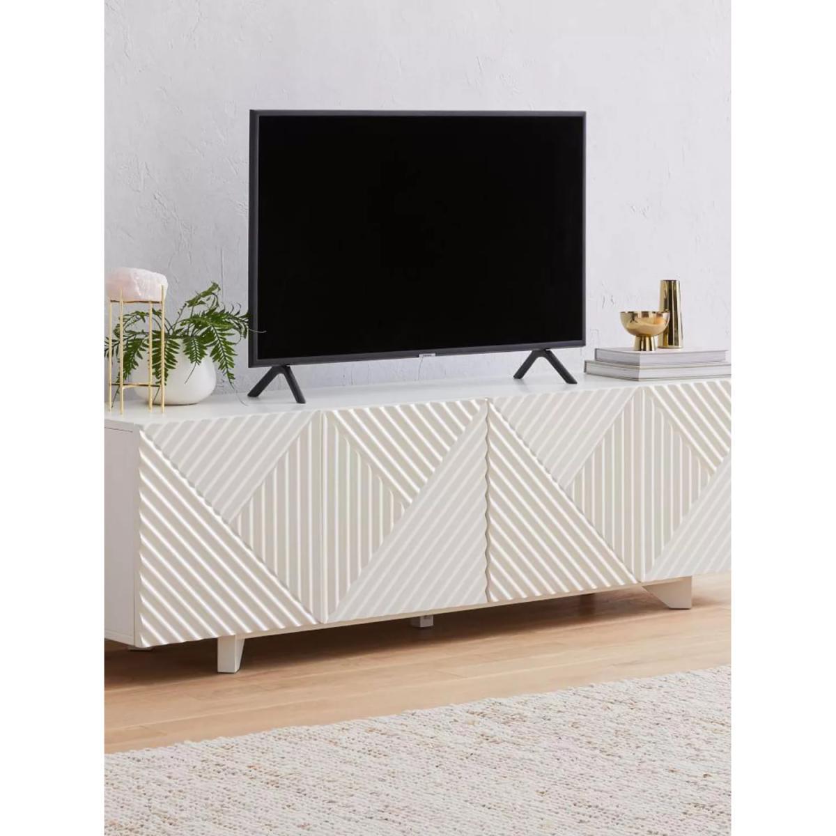 Created in collaboration with Melbourne-based designer Rosanna Ceravolo, this TV stand sideboard features a distinctive, geometric design on the door fronts that adds texture and subtle depth. It's made from solid and engineered wood with spacious cabinet sections and shelving, so there's plenty of space for your media consoles. Plus, holes at the back mean you can neatly feed through cables. Great for adding character to your space and designed with a crisp, painted finish.