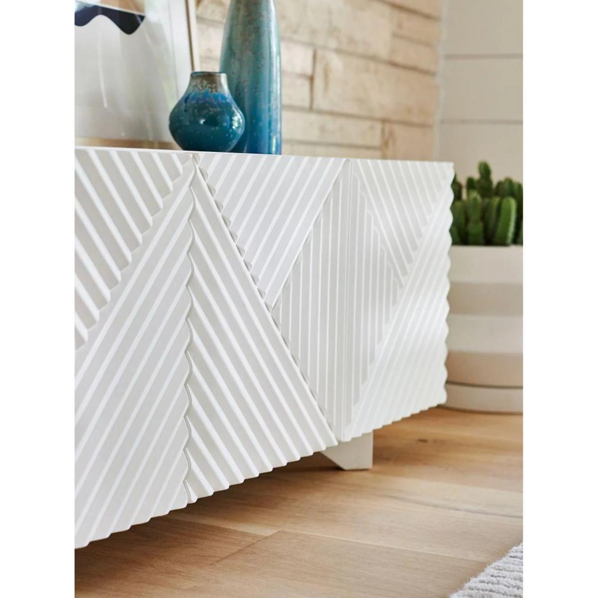 The West Elm Rosanna Ceravolo TV Stand Sideboard offers a sleek and contemporary look with its textured geometric pattern and clean white finish, making it a versatile piece for modern interiors. I love how it brings a touch of visual interest without overpowering the space, and it works particularly well in Scandinavian, mid-century, or eclectic styles. Practical styling tips include placing decorative objects like ceramics or small plants on top, while using the inside compartments for media storage or organiser baskets to keep clutter at bay. Its size for TVs up to 68 inches makes it a functional staging piece that can anchor your living area while maintaining a fresh, minimal aesthetic.