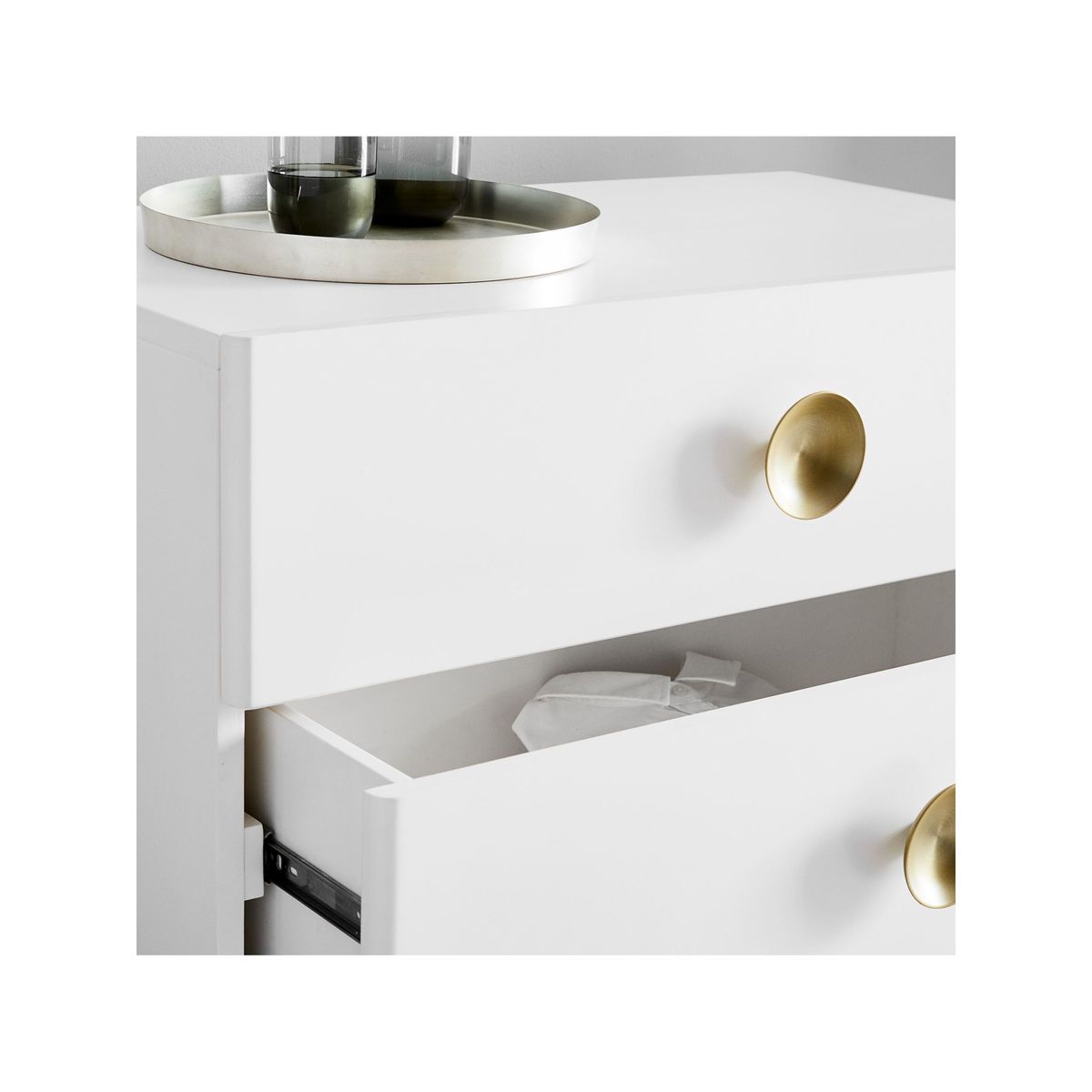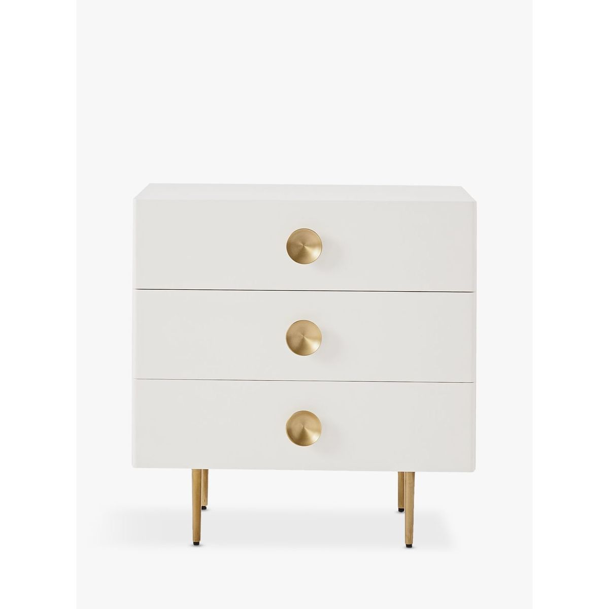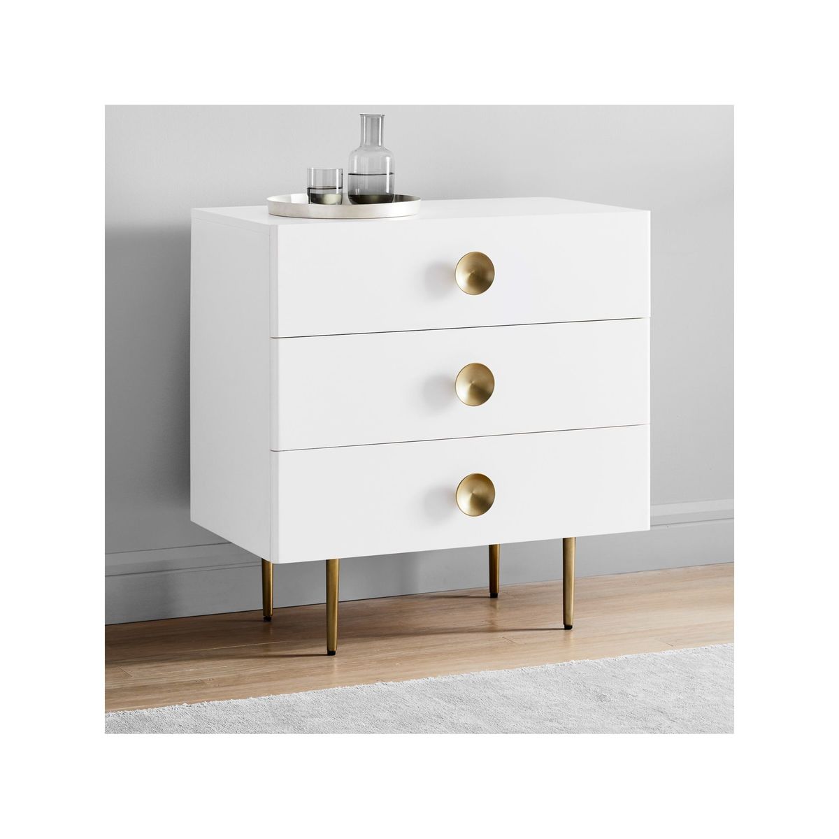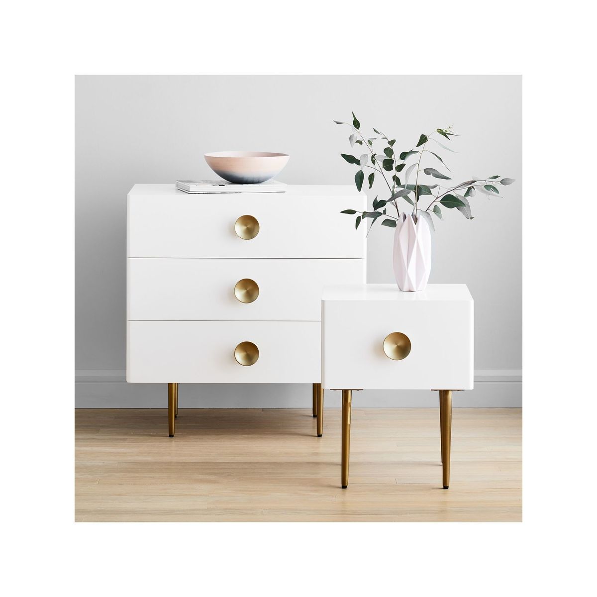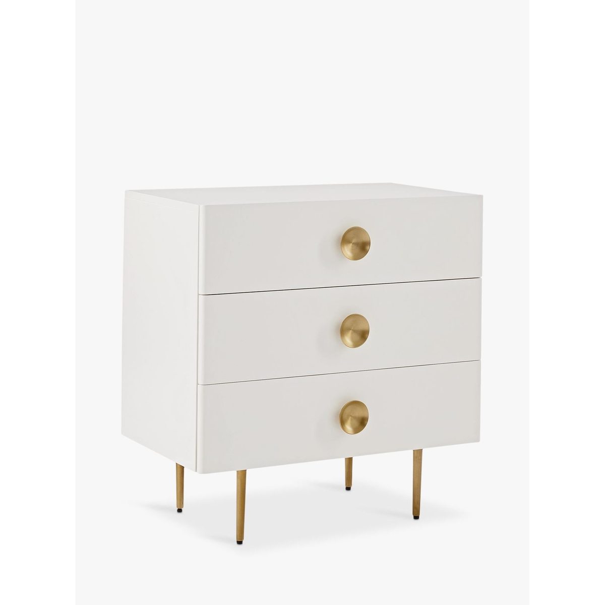 The Satellite chest of drawers from west elm has a distinctive, modern design that incorporates three spacious drawers and tapered legs. Made from engineered wood in a smooth lacquered finish, it features a cast metal disc handle on each drawer that lends a striking contrast against its pared-back profile.