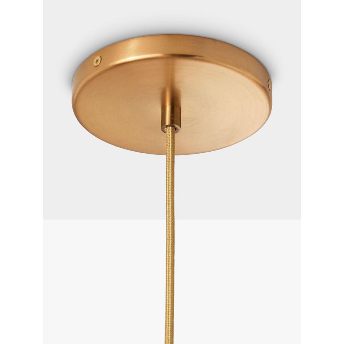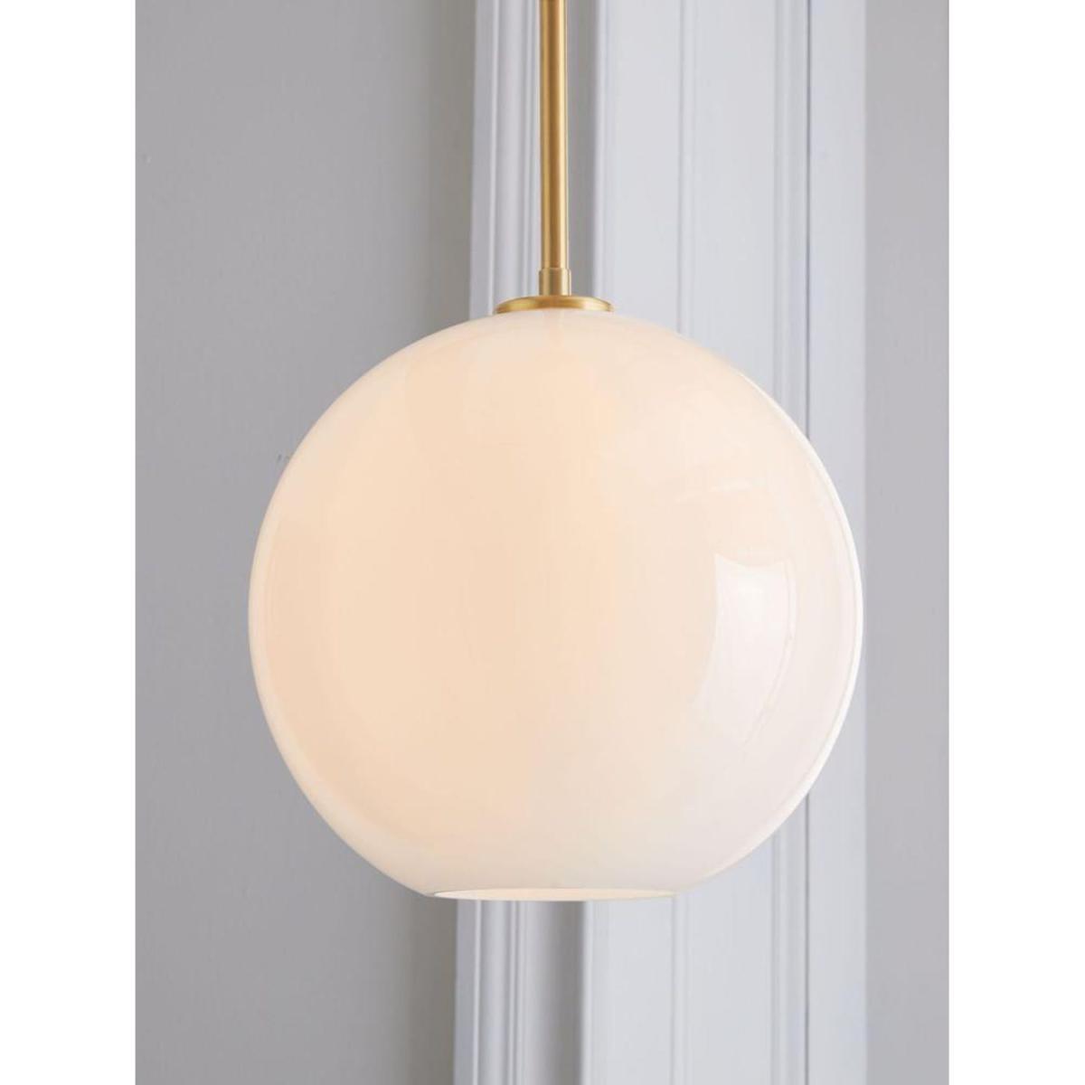 A simple, milk glass pendant suspended from a height adjustable, antique-brass finished canopy. Ideal for creating a warm glow of light in your space.