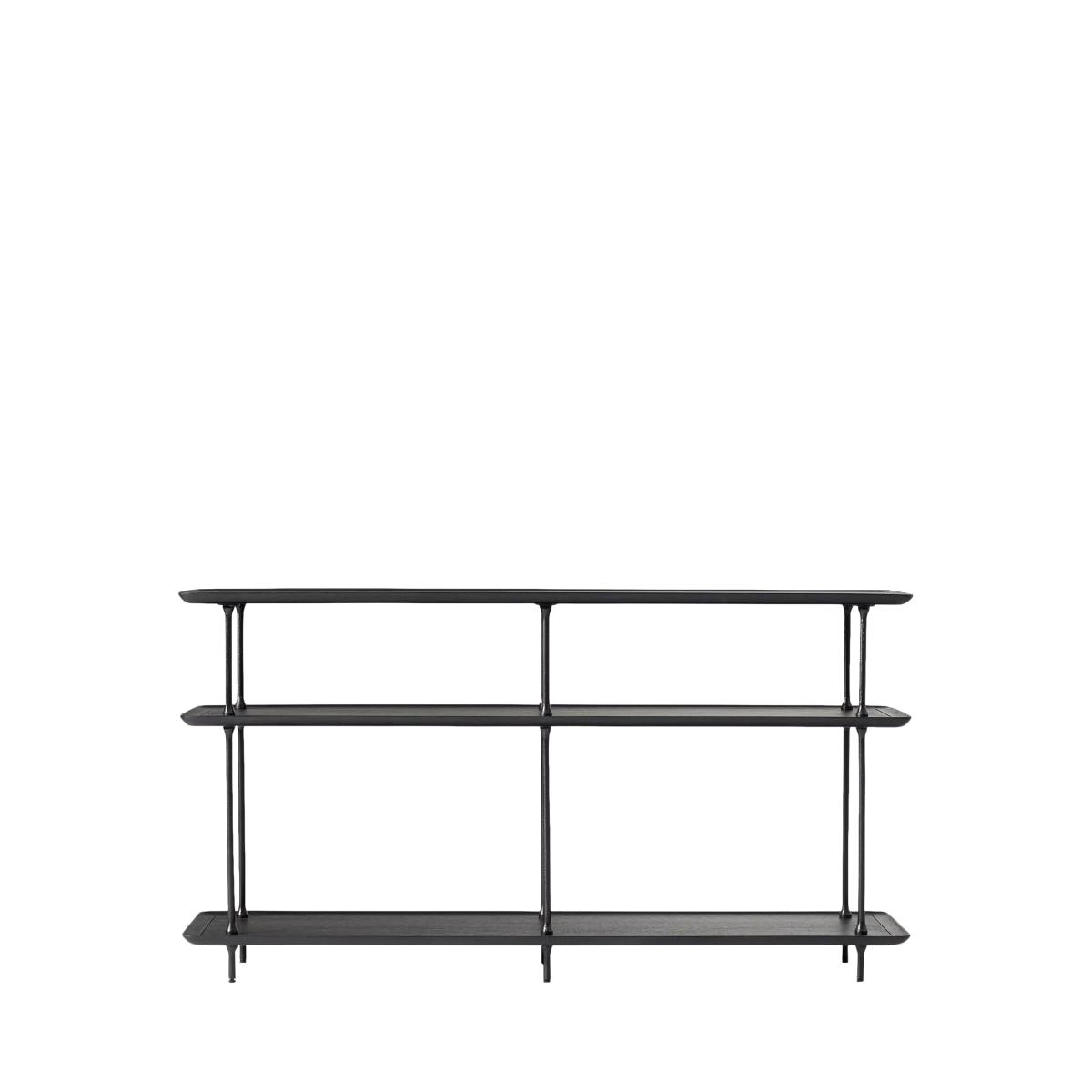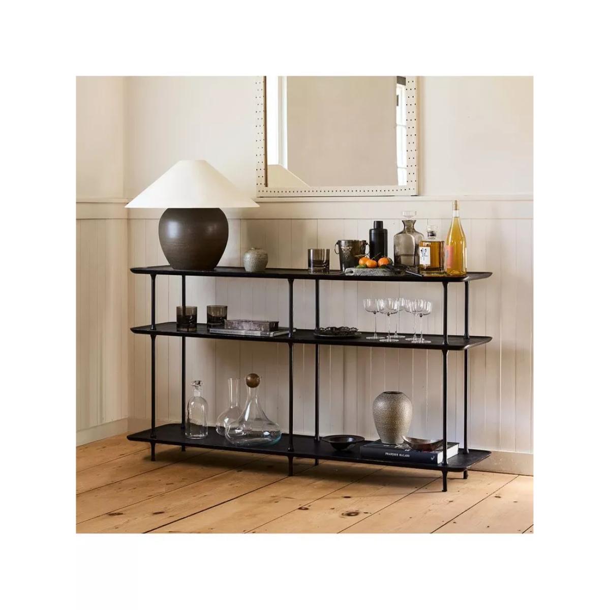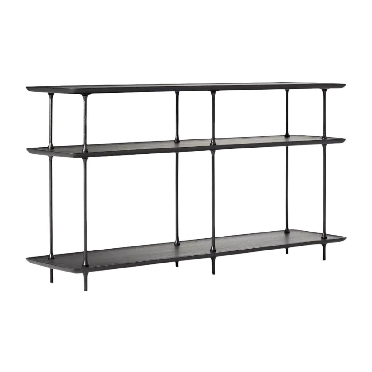 Heavily textured metal meets sculptural lines on the Sintra console table. Three shelves showcase glassware, ornaments and books. Make an impression: the sleek frame and open shelves look just right in an entryway or dining room Bold and broad: organic materials and a large-scale silhouette add presence to your space Handcrafted in a Fair Trade Certified™ factory, empowering workers who made it Three fixed solid and engineered wood shelves covered in a Black finish Metal legs covered in a Dark Bronze finish Hand-hammered design