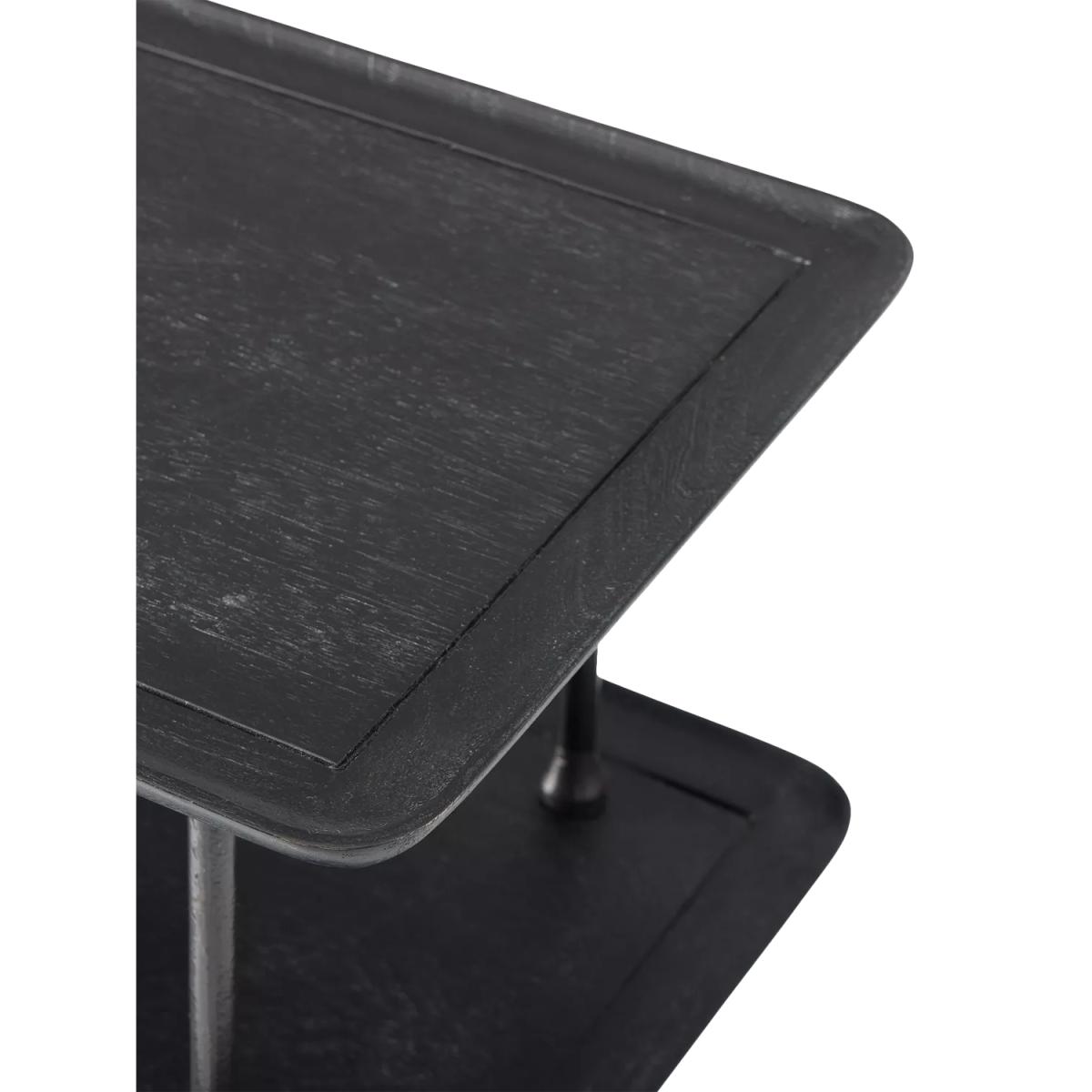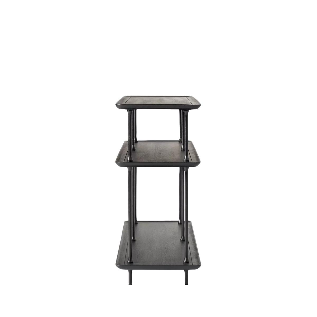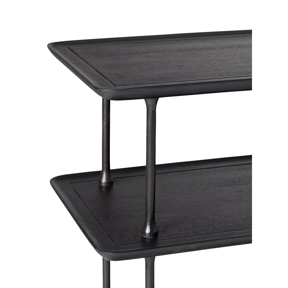 Heavily textured metal meets sculptural lines on the Sintra console table. Three shelves showcase glassware, ornaments and books. Make an impression: the sleek frame and open shelves look just right in an entryway or dining room Bold and broad: organic materials and a large-scale silhouette add presence to your space Handcrafted in a Fair Trade Certified™ factory, empowering workers who made it Three fixed solid and engineered wood shelves covered in a Black finish Metal legs covered in a Dark Bronze finish Hand-hammered design
