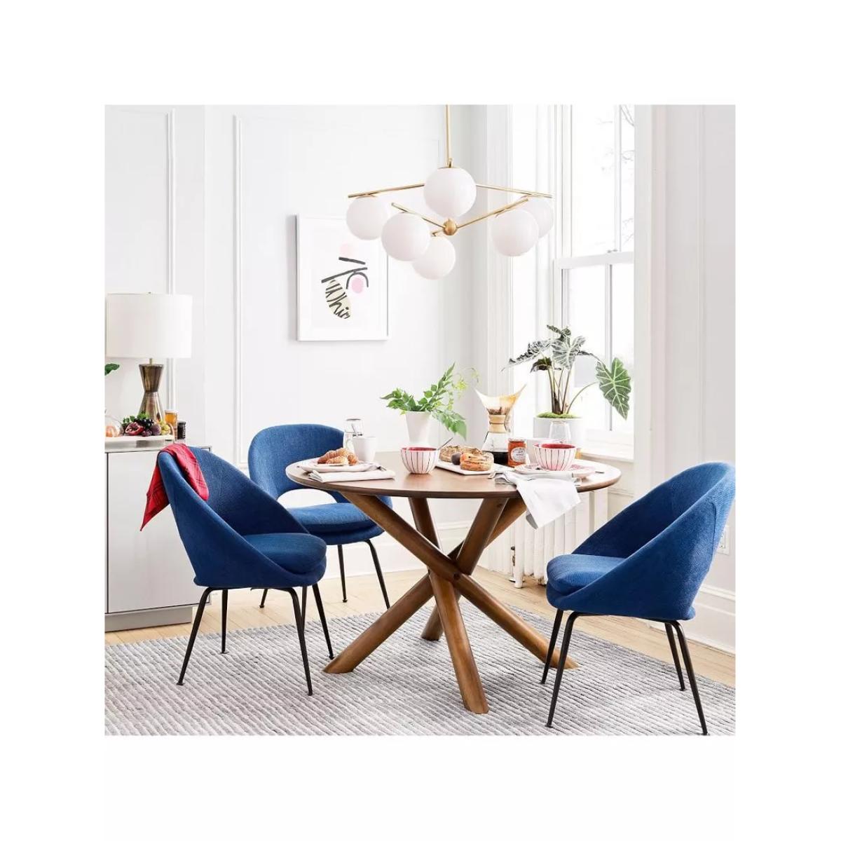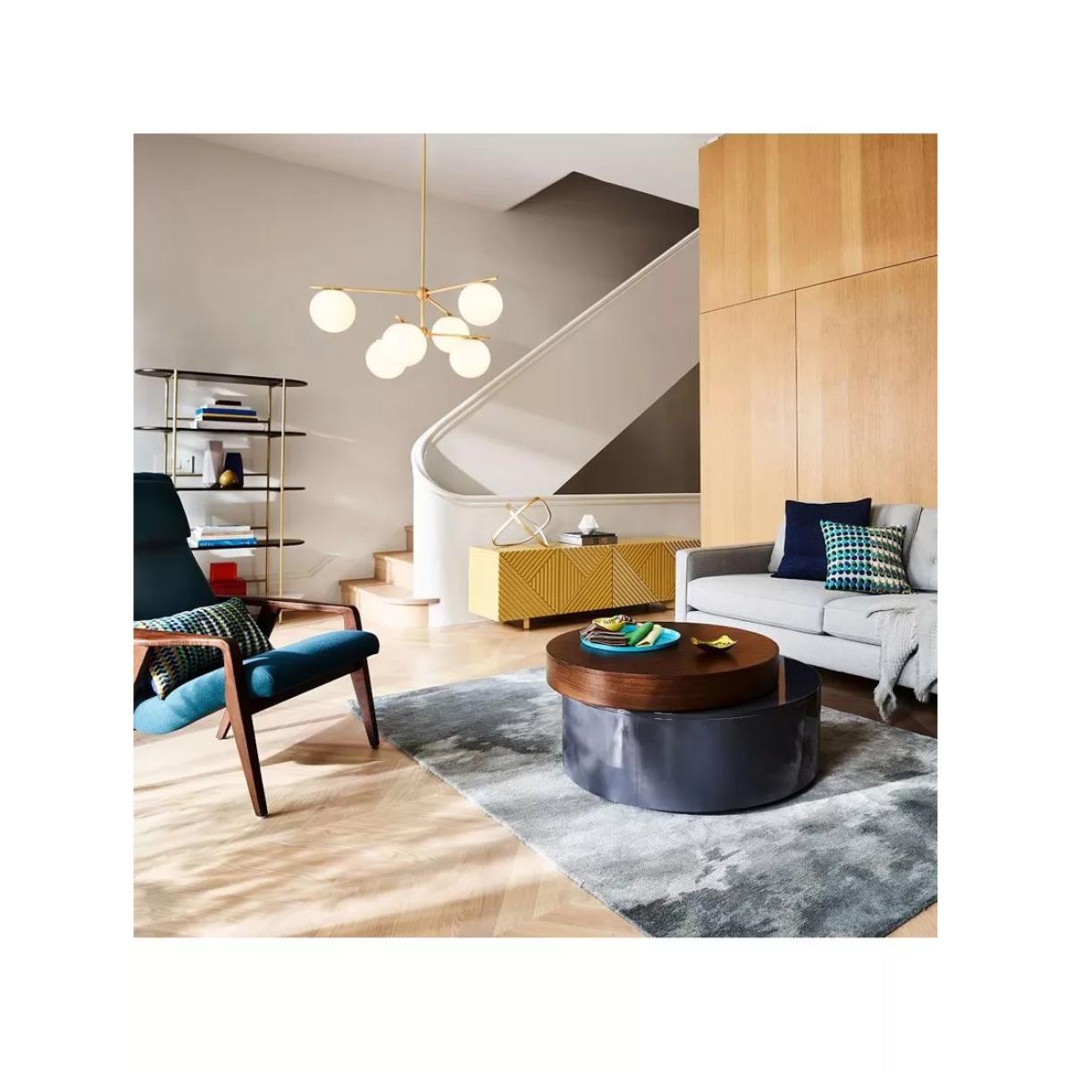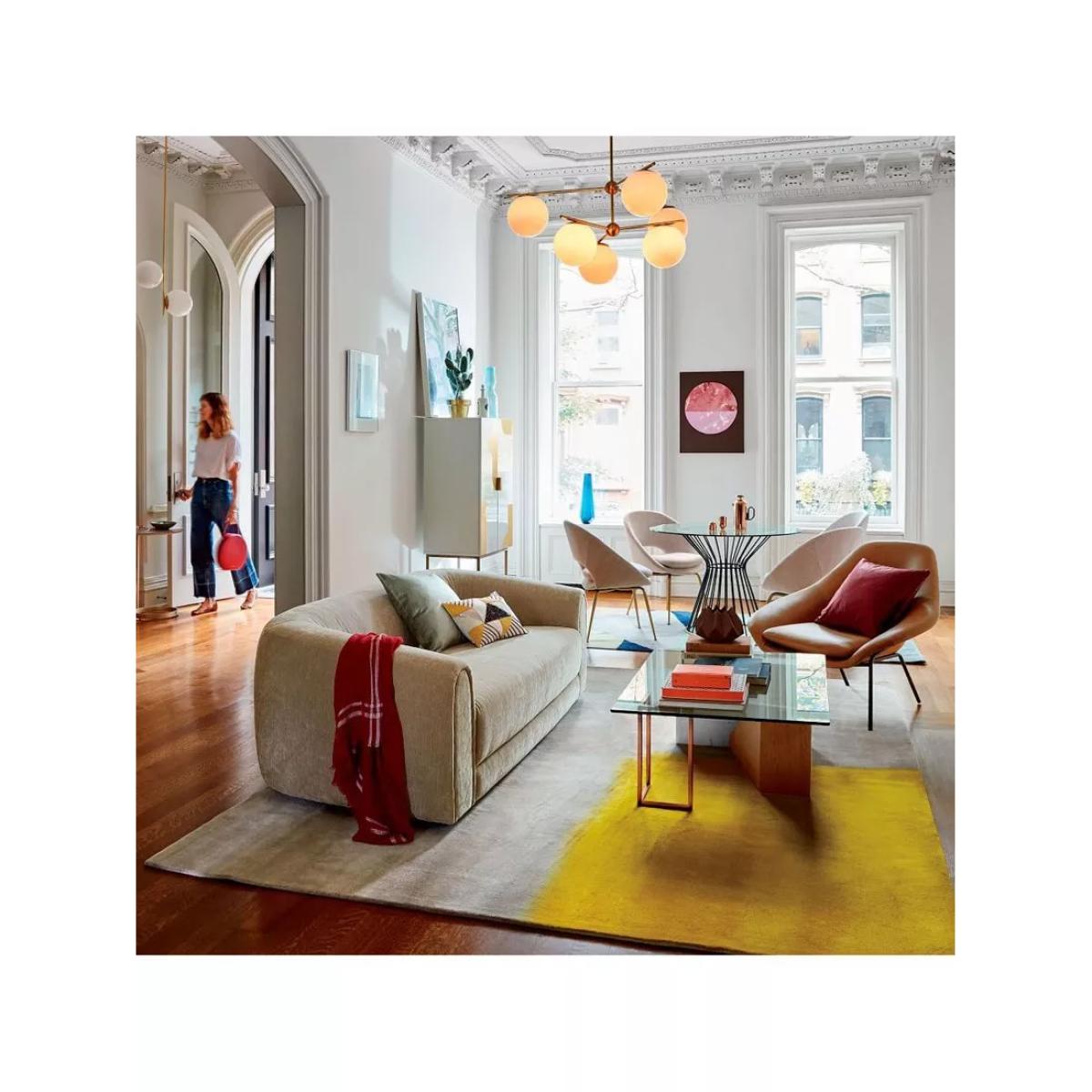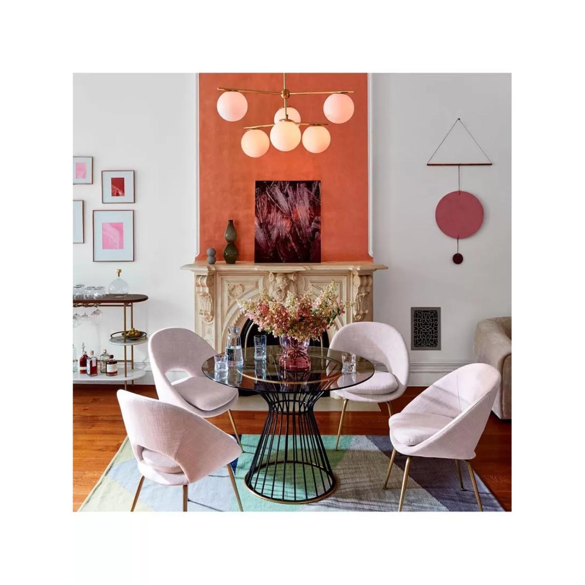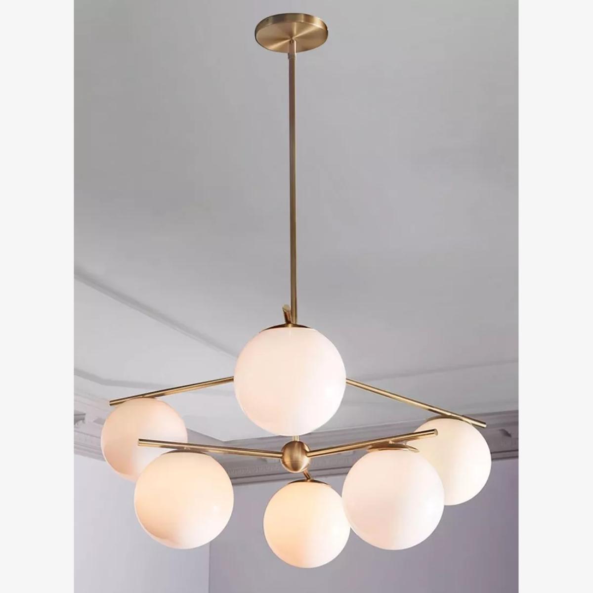 This chandelier is a stylish choice that offers a modern yet elegant aesthetic, making it versatile for a variety of interiors. I love its combination of clean white globes with the subtle gold finish, which adds a touch of sophistication without overpowering the space. It works especially well in contemporary or minimalist settings, but can also complement retro-inspired decor or even eclectic interiors with its playful form. For practical styling, consider positioning it over dining areas or living zones where the ambient glow can enhance the space, and pair it with simple, understated fixtures and furniture to let the light fixture stand out. Its eye-catching design will serve as a visual focal point while providing functional lighting.