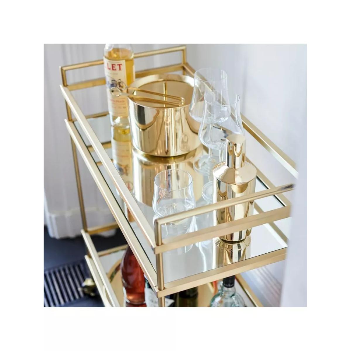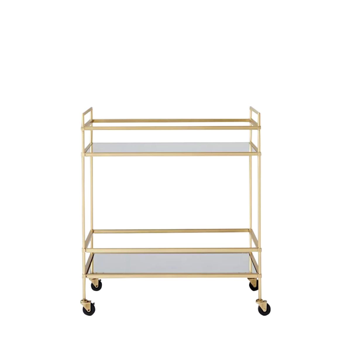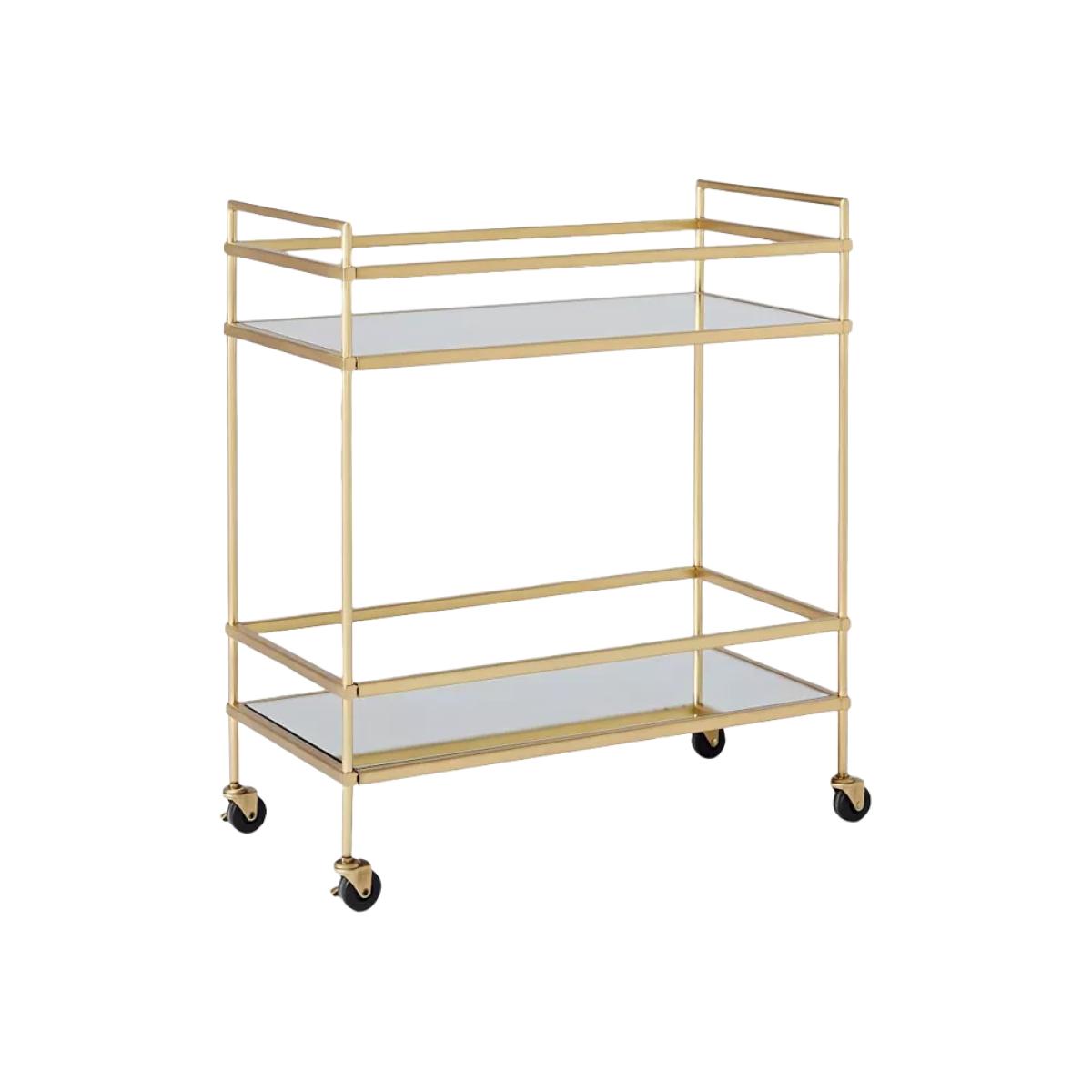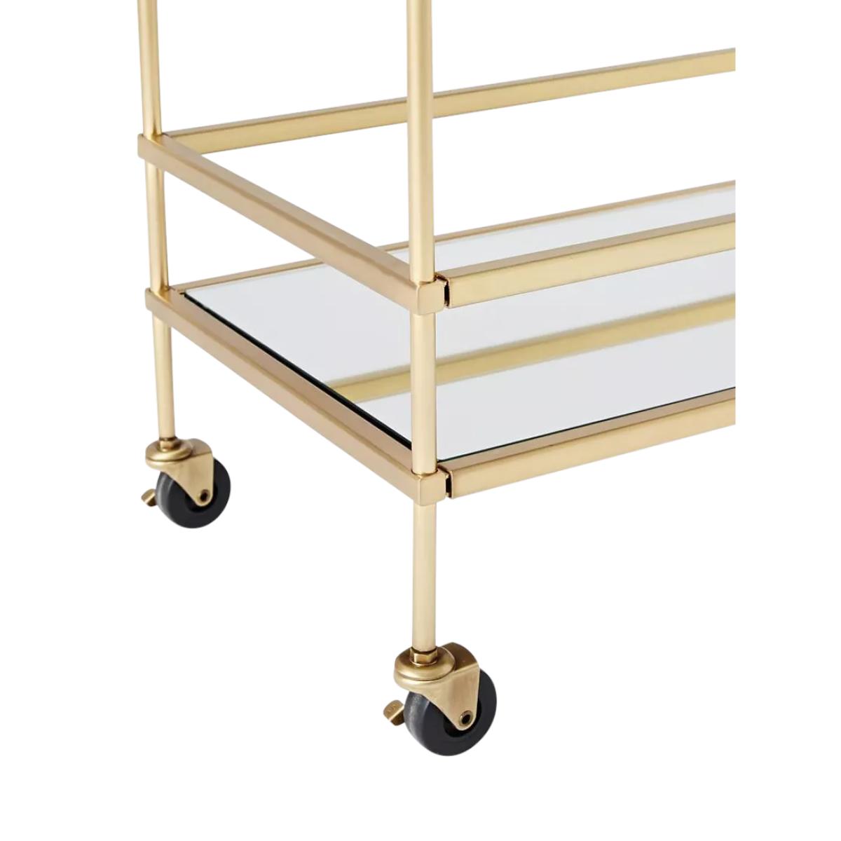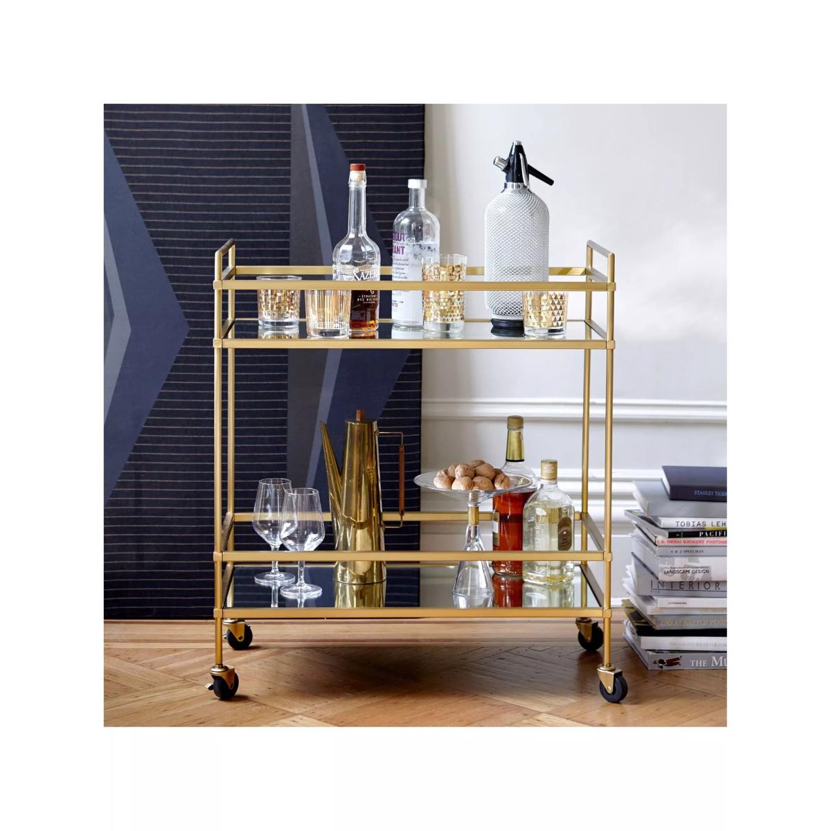 Bar cart that takes its cues from Deco design and adds a touch of glam to your entertaining space. Two open shelves display spirits, mixers and barware Set on four wheels so you can easily move it from room to room Mirrored shelves: two spacious mirrored shelves reflect light up, creating an airy yet elegant look Metal frame Two locking caster wheels at the back side and two non-locking casters at the front