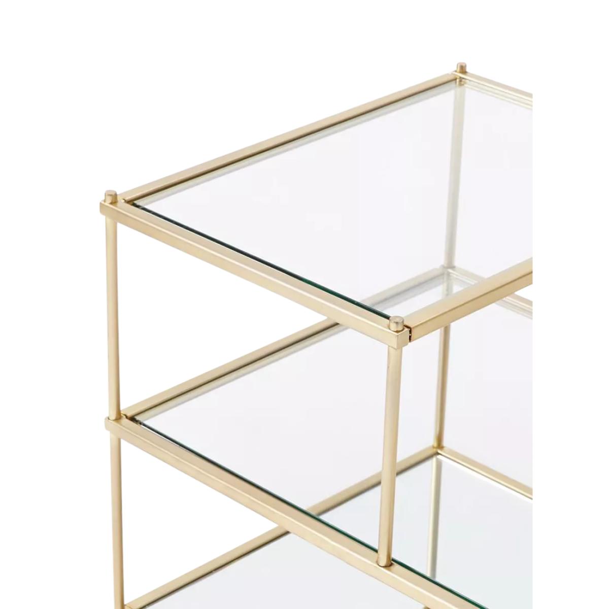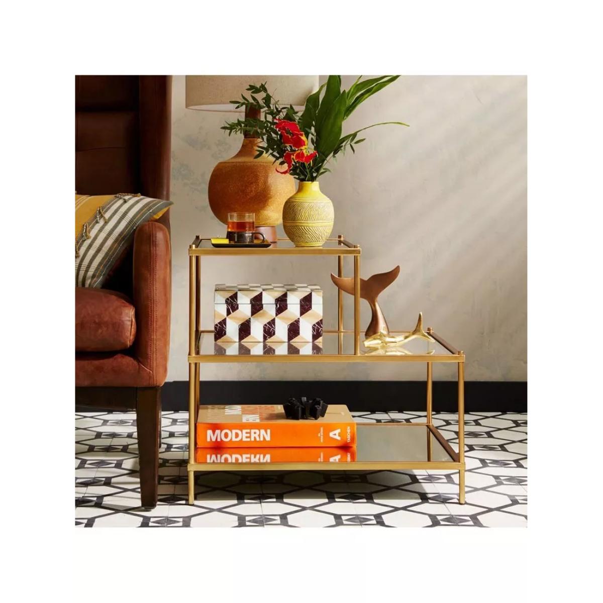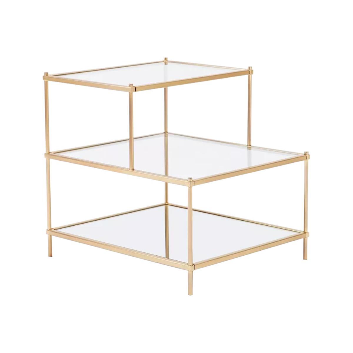 Inspired by mid-century design, the Terrace Side Table has tiered glass shelves that appear to float above a mirrored glass base. With its refined silhouette, it's perfect for placing on either end of a sofa or beside a bed. Has an Antique Brass finish on the metal frame, a mirror bottom shelf and a clear, tempered glass shelf and top.