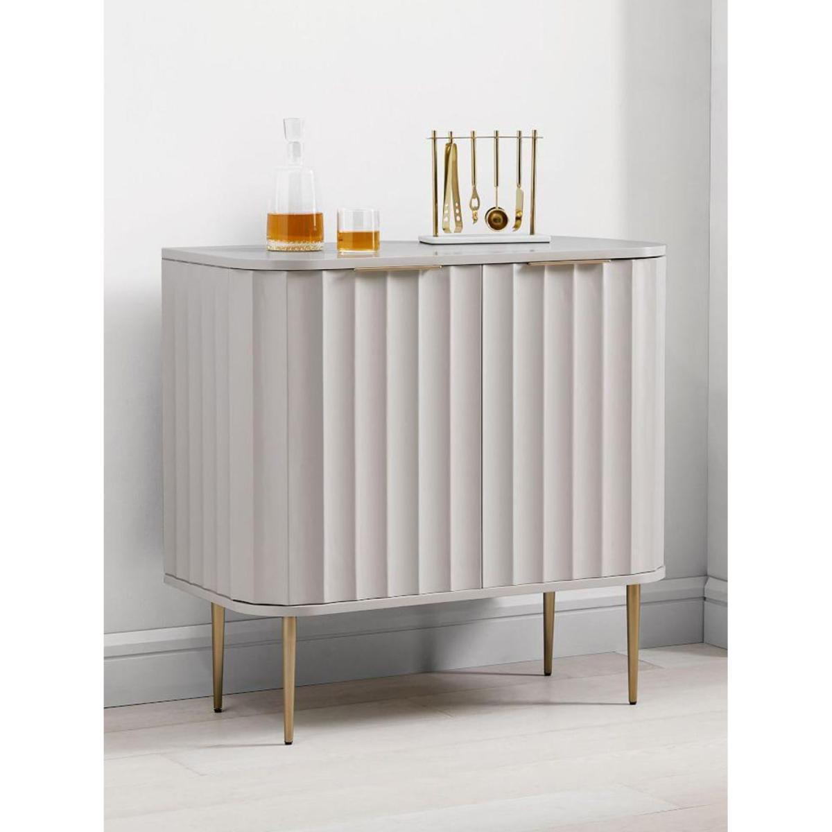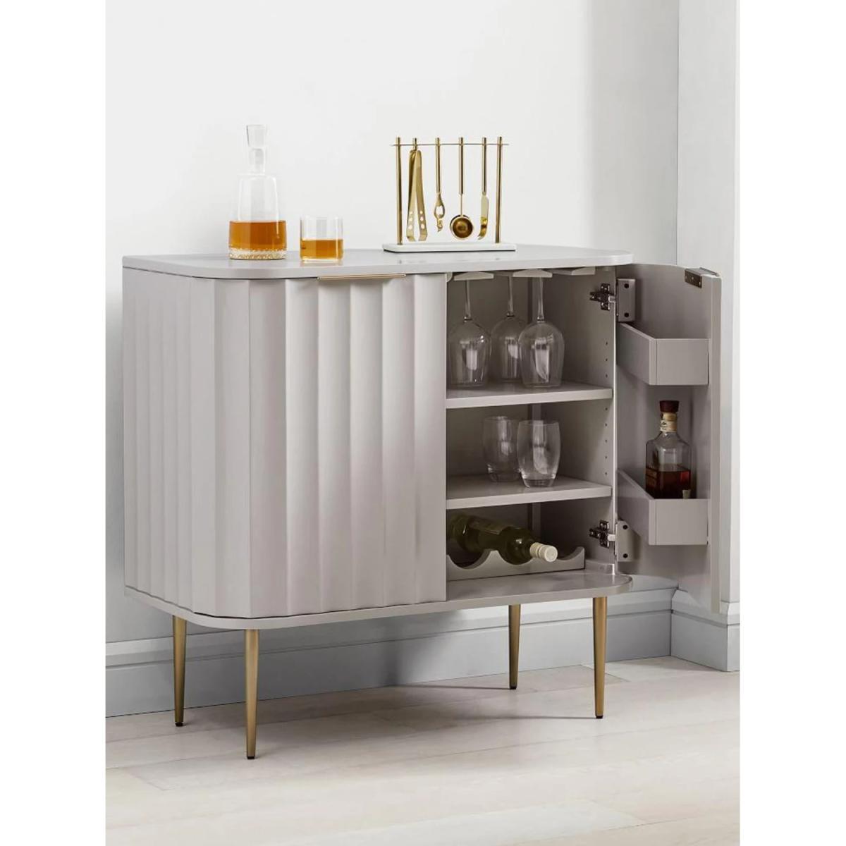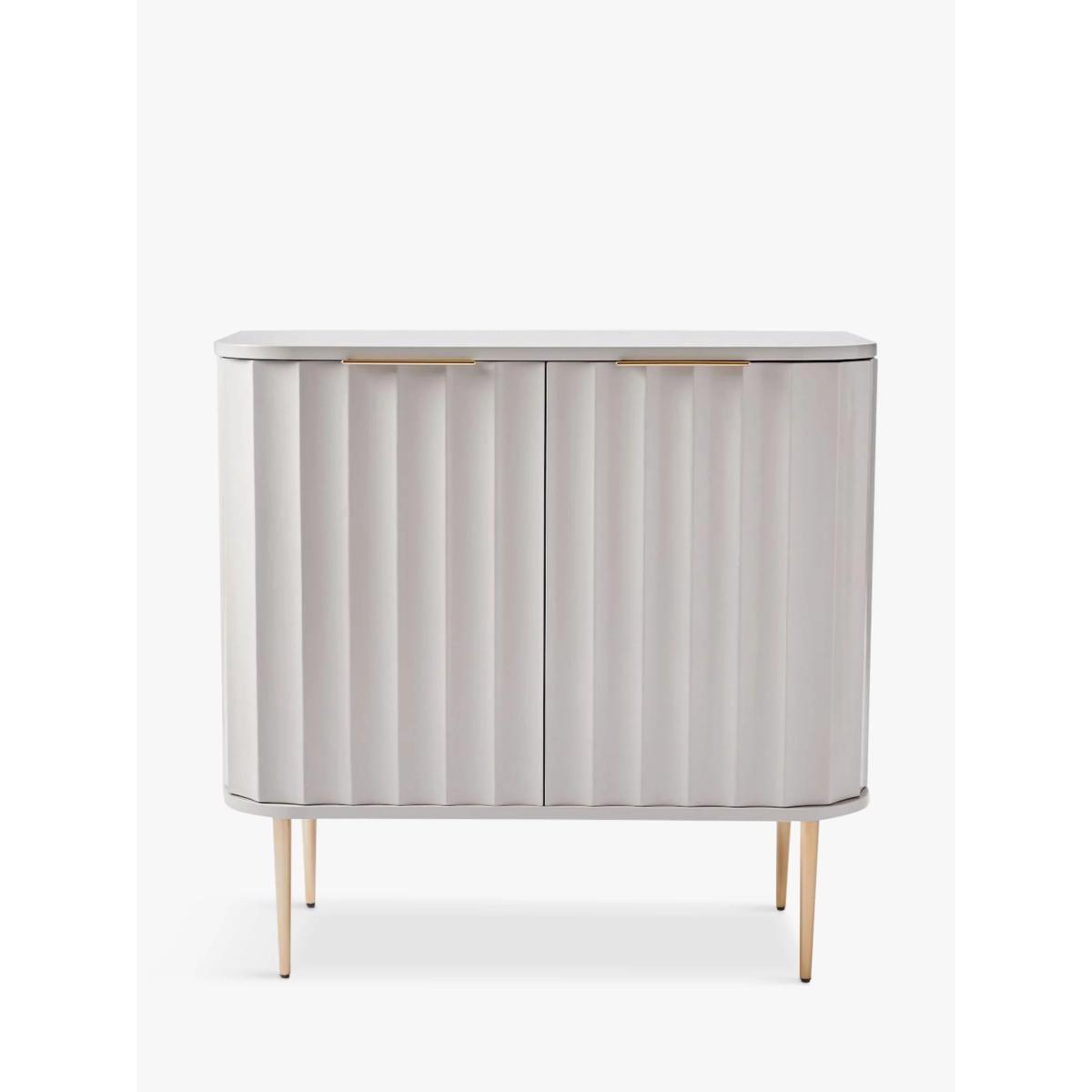 Honouring retro style thanks to its curved frame, tactile grooved details and sleek, bronze-finished hardware, this compact sideboard doubles up as a bar cabinet. It's made from engineered wood, with solid poplar wood used to create the racks for storing glasses and bottles. Inside, there's two adjustable shelves, a built-in wine rack that holds eight bottles and a built-in wine glass rack that holds 18 standard-sized glasses. It's painted and covered in a water-based finish. By choosing this product you are supporting responsible management of the world’s forests. The Forest Stewardship Council® (FSC®) is a global, not-for-profit organisation that helps take care of forests and the people and wildlife that call them home. To learn more, visit. Want to see it first? You may want to see and get a feel for the furniture in one of our shops before ordering. We'll be able to tell you where the range you'd like to view is on display.