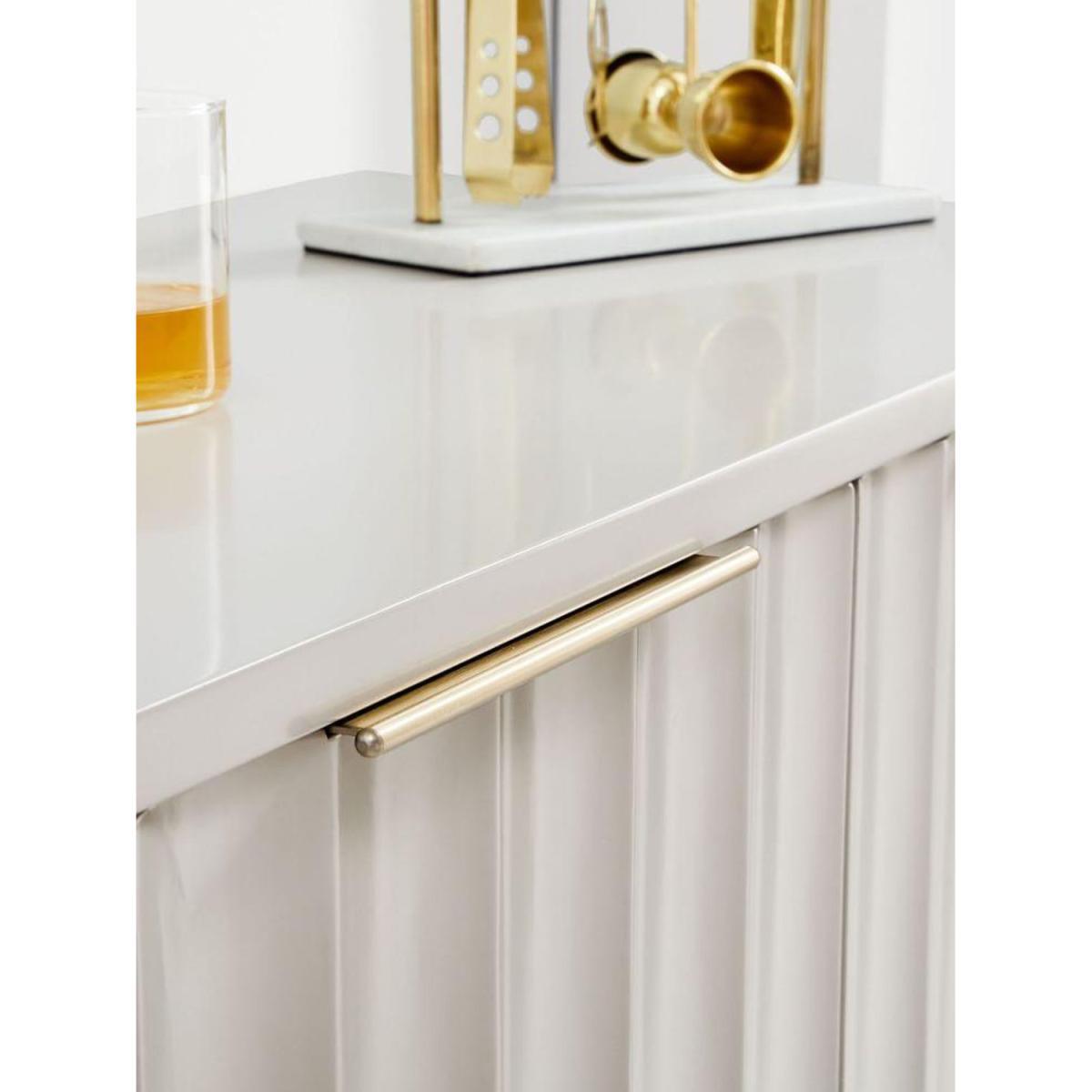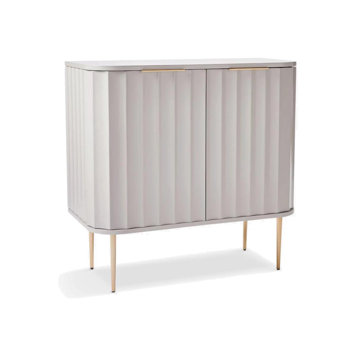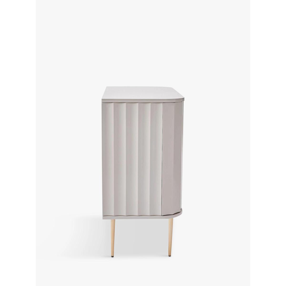 Honouring retro style thanks to its curved frame, tactile grooved details and sleek, bronze-finished hardware, this compact sideboard doubles up as a bar cabinet. It's made from engineered wood, with solid poplar wood used to create the racks for storing glasses and bottles. Inside, there's two adjustable shelves, a built-in wine rack that holds eight bottles and a built-in wine glass rack that holds 18 standard-sized glasses. It's painted and covered in a water-based finish. By choosing this product you are supporting responsible management of the world’s forests. The Forest Stewardship Council® (FSC®) is a global, not-for-profit organisation that helps take care of forests and the people and wildlife that call them home. To learn more, visit. Want to see it first? You may want to see and get a feel for the furniture in one of our shops before ordering. We'll be able to tell you where the range you'd like to view is on display.