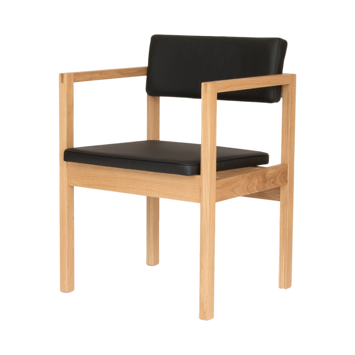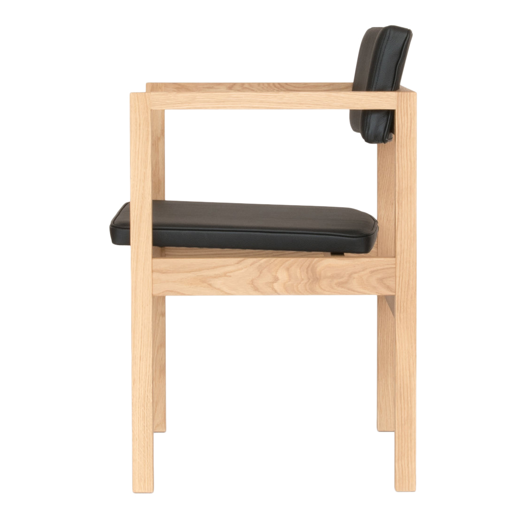 Named after the house that designer Robin Day moved to in 1999, the West Street Chair is accented with black leather and oak accents and was created with a focus on designing a chair with the simplest form possible. Based on a simple cube shape, the West Street Chair was designed by Day is a pared-down piece with clean lines and angles. Softened by its upholstery, the Robin Day West Street Chair has two black leather pads, one as a seat and the other an angled backrest. Showcasing a solid oak frame, the West Street Chair was designed by Robin Day exclusively for Case and is manufactured by them today to the same exacting standards as the original specifications.