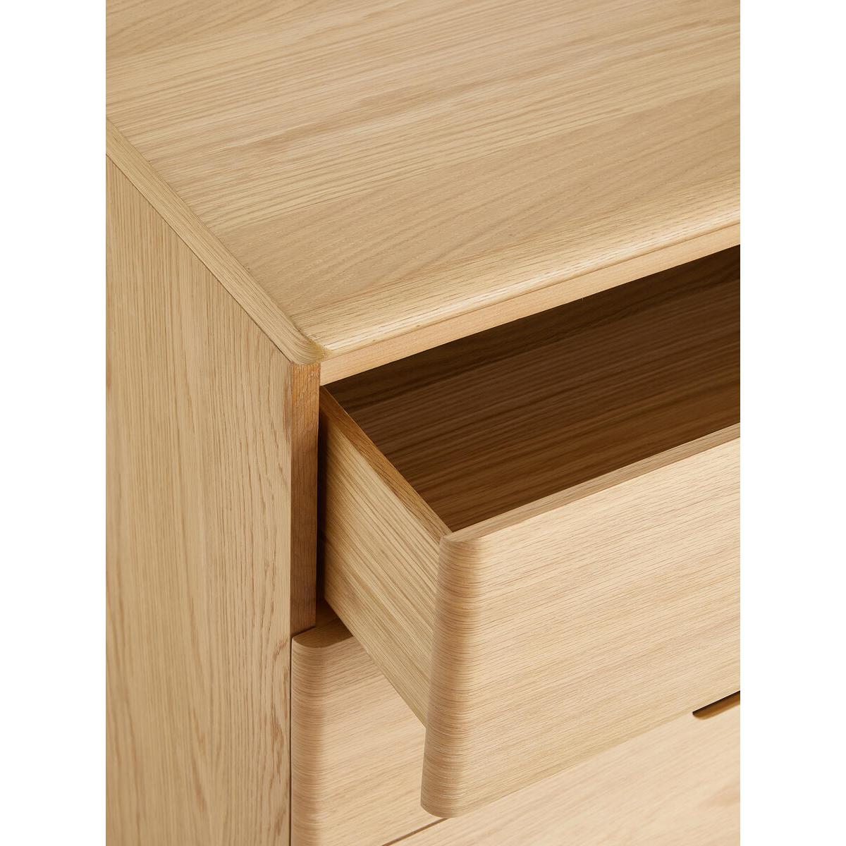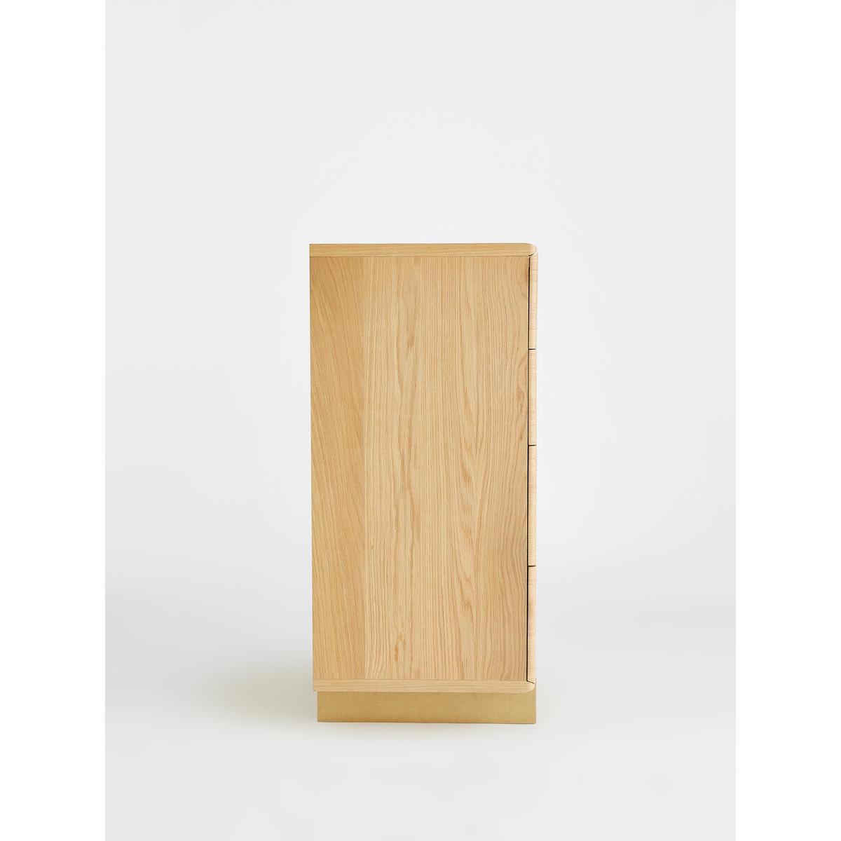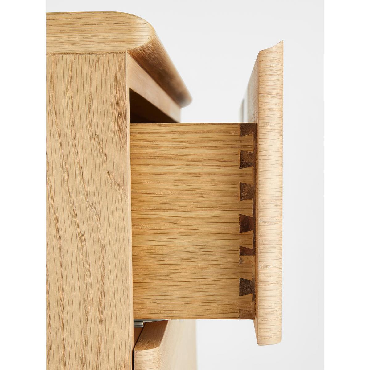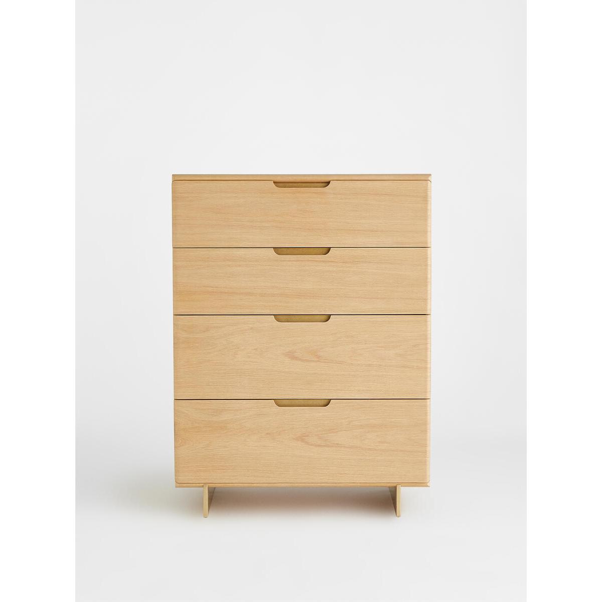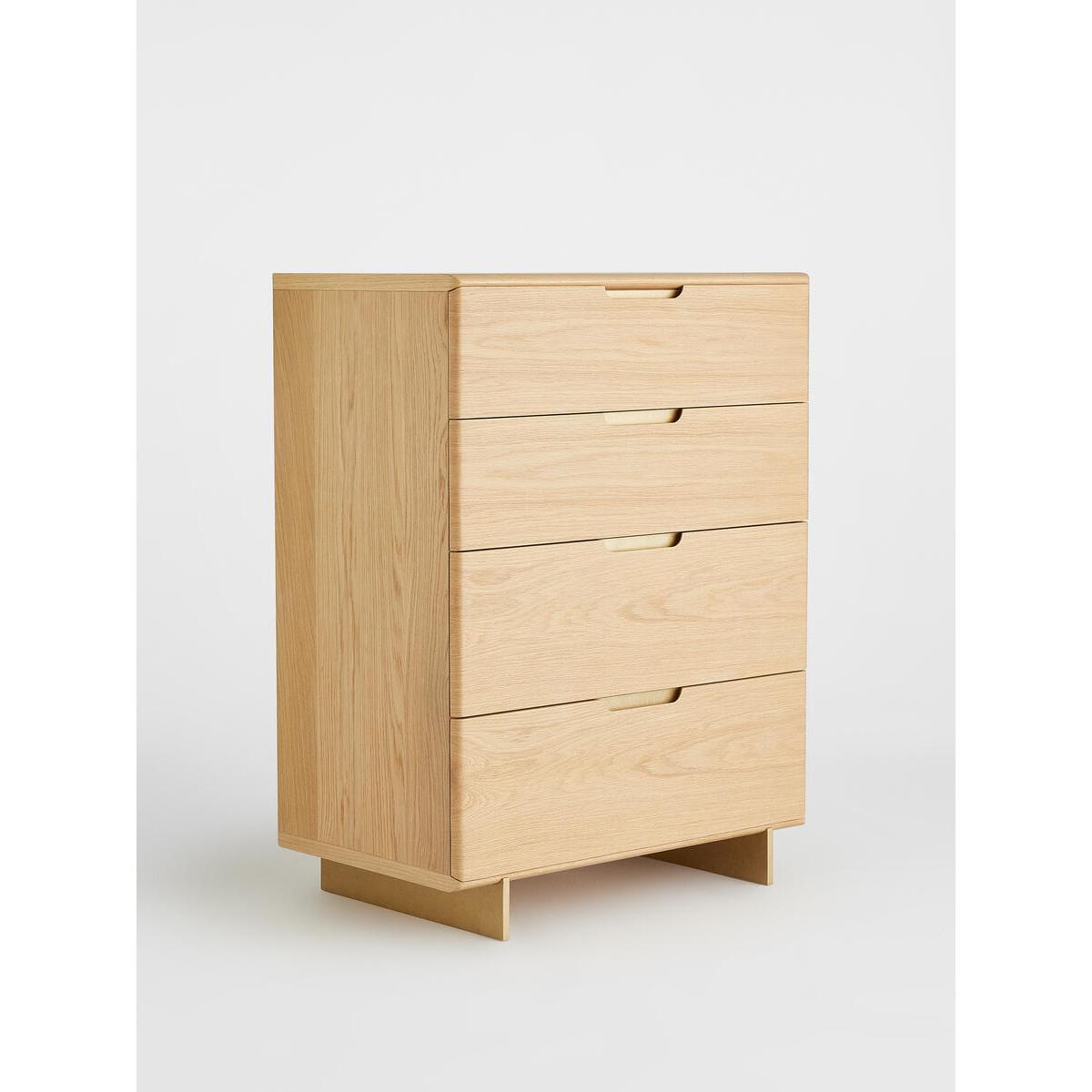 Taking cues from Soho House Barcelona, our Westbournefour-drawer chest is crafted from pale oak with a soft satinfinish. It features dovetail drawer boxes, curved corners and awaterfall edge to create a smooth effect. Antique brass-finishplates are fitted behind the handles, and brass ski legs are fixedunderneath. Pale solid oak and veneer chest of drawers. Four dovetail drawers. Waterfall edge and curved corners. Brass ski legs. Inspired by Soho House Barcelona.