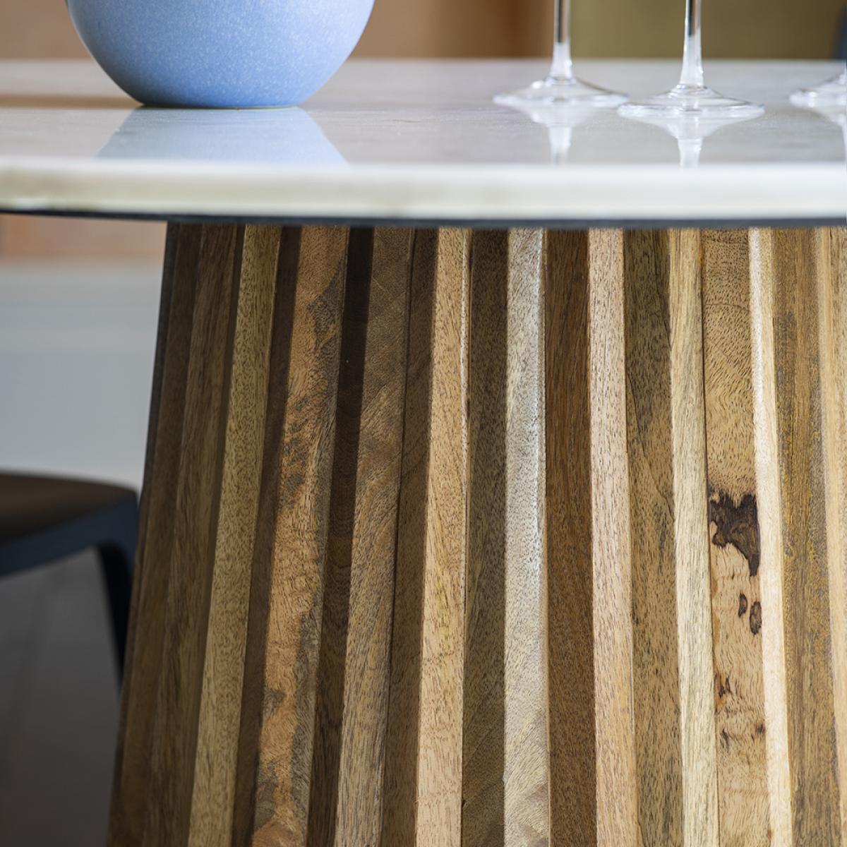 I’m a fan of the Westbourne table for its clean, round top and gently fluted oak pedestal - it brings warmth and a subtle sculptural touch without overwhelming the room. The light, marble-effect surface works especially well in modern Scandi or transitional interiors, where you want simplicity with just a hint of texture. Keep styling minimal to let its shape shine: a low ceramic vase with fresh greenery or a stack of coffee-table books at the centre is all you need. It also plays nicely with a mix of chair styles (think black-frame seats or woven rush) and sits well on a natural-fibre rug to soften tiled or wooden floors.