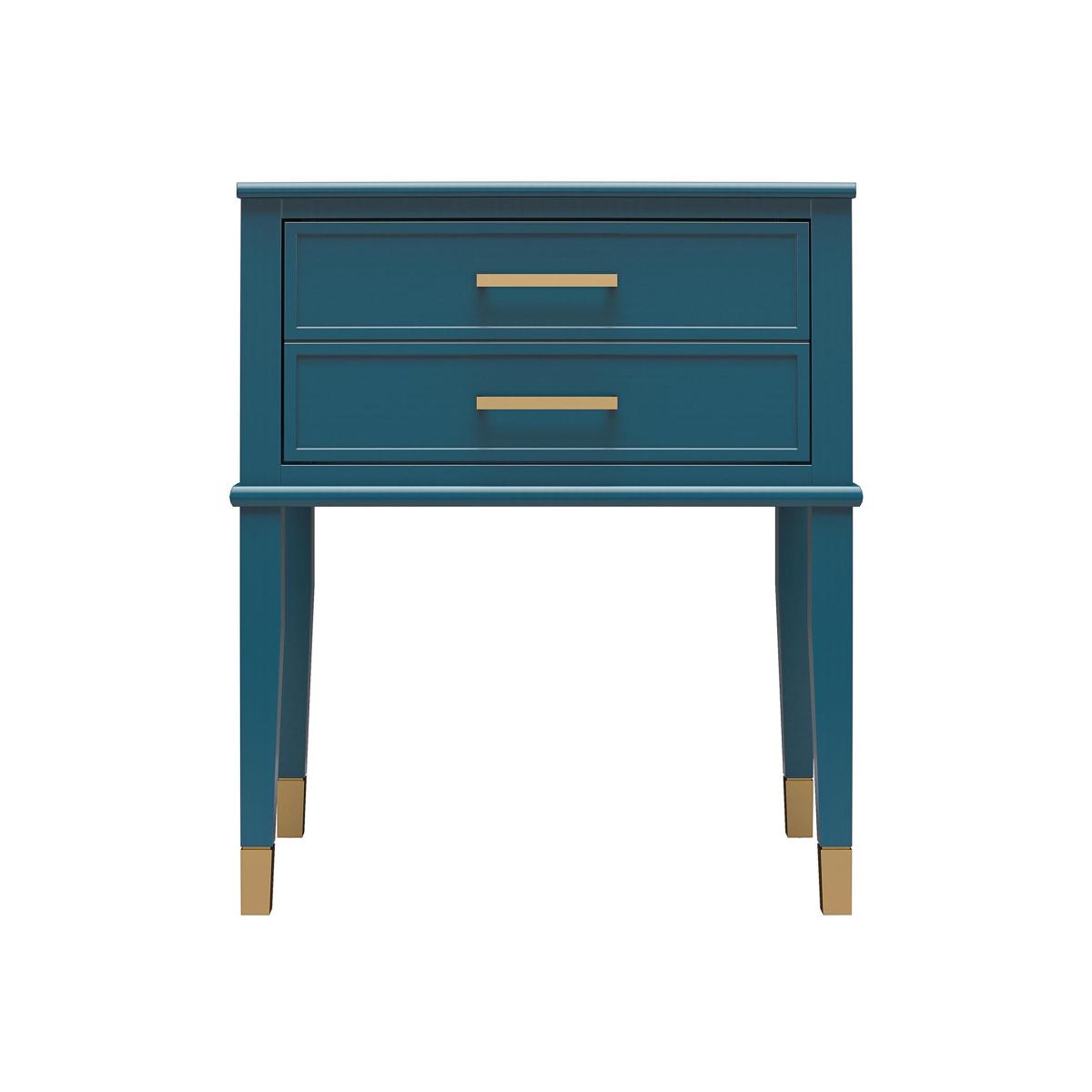 Take note: you can organize your living space and get the style you deserve with the Cosmo. Living by Cosmopolitan Westerleigh End Table. The sophisticated design is accented by trendy gold hardware for a bold Cosmolicious look that we are digging. Here are the deets: the drawer front looks like two drawers but gives you all the space to store larger items out of sight while the spacious tabletop provides room for all of your accessories.