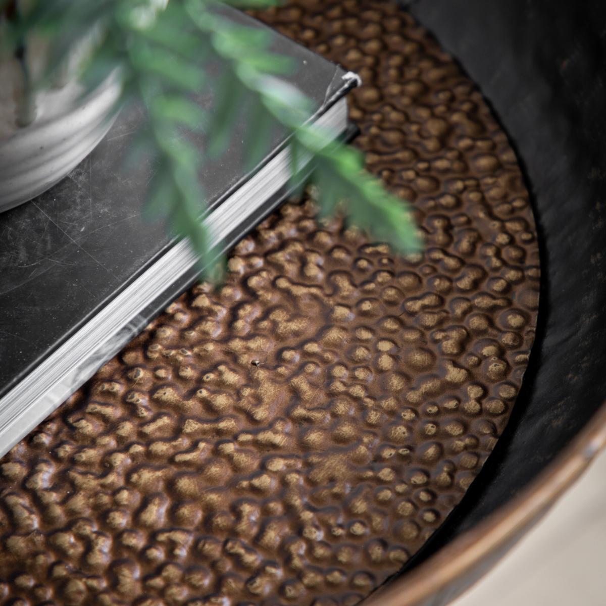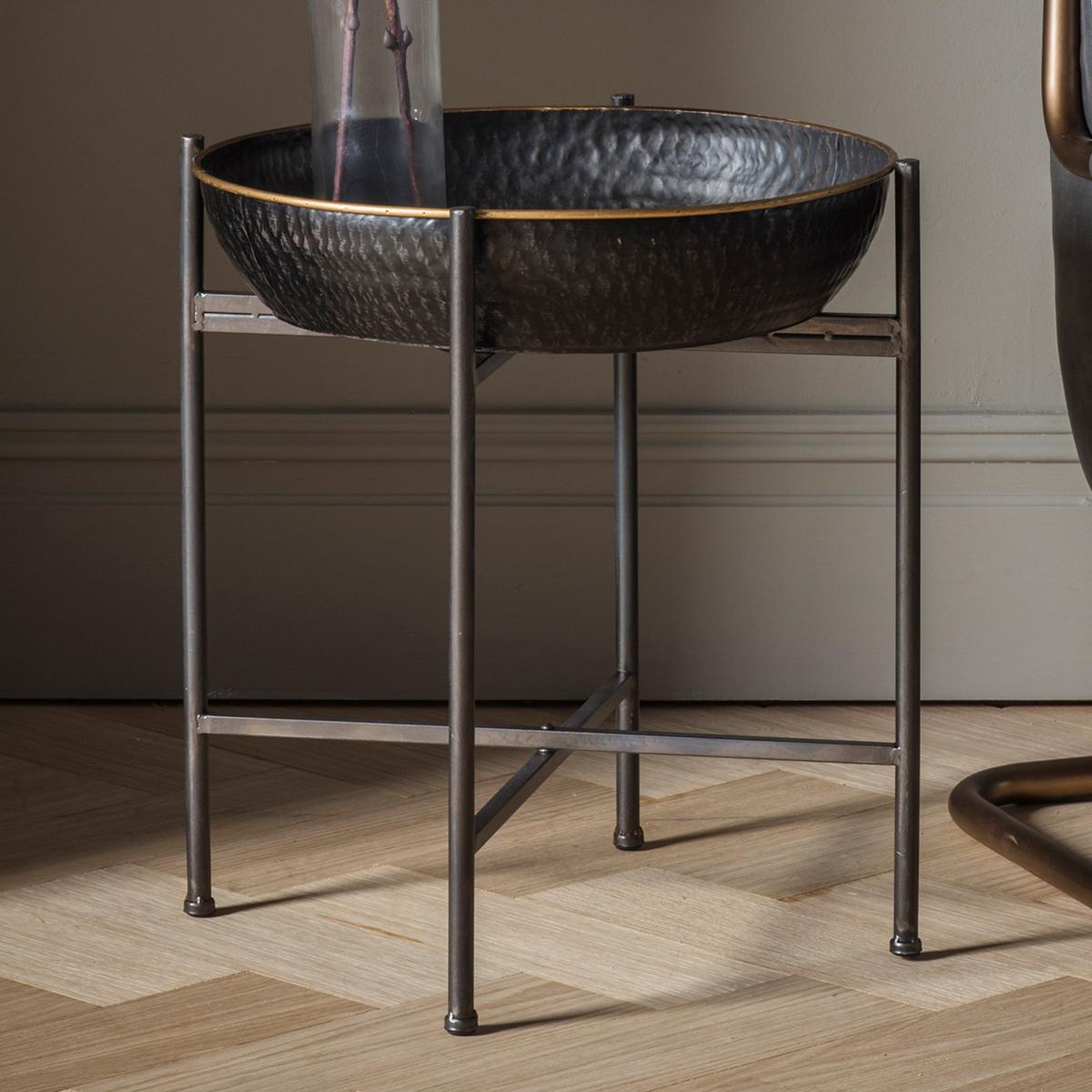 * Quirky, unusual side table* Metal cross bar stand* Deep hammered textured tray* Black finish with gold edge detailing This unusual side table features a metal cross bar stand that holds a deep hammered textured tray in a black finish with gold edge detailing.