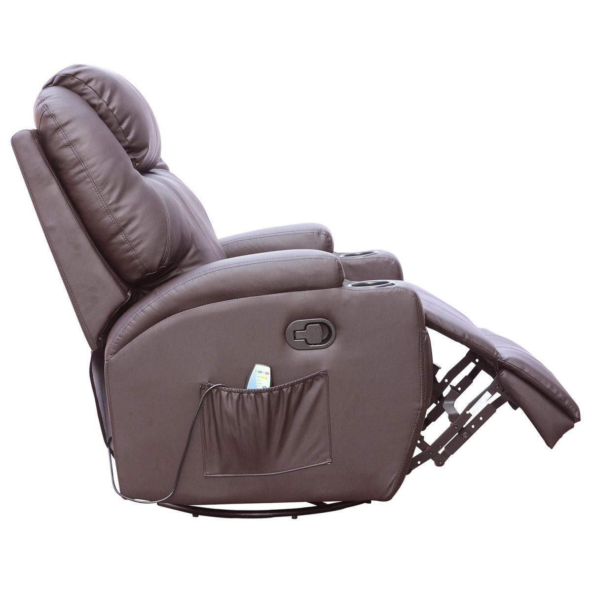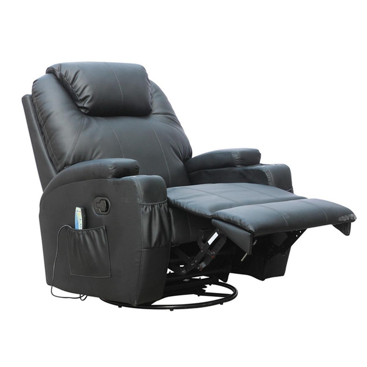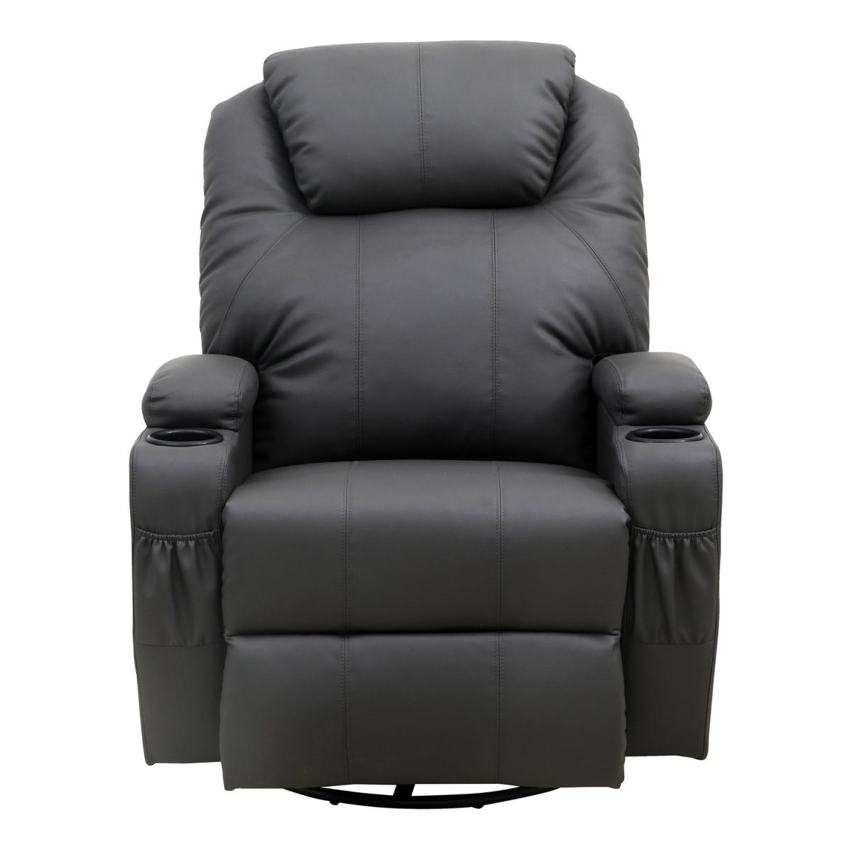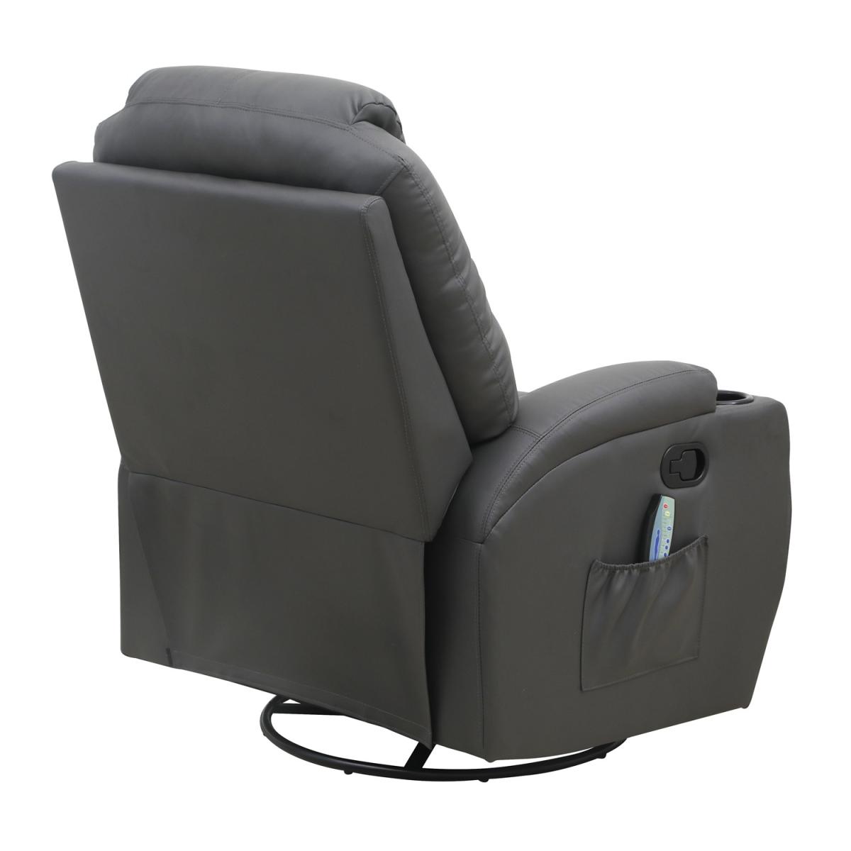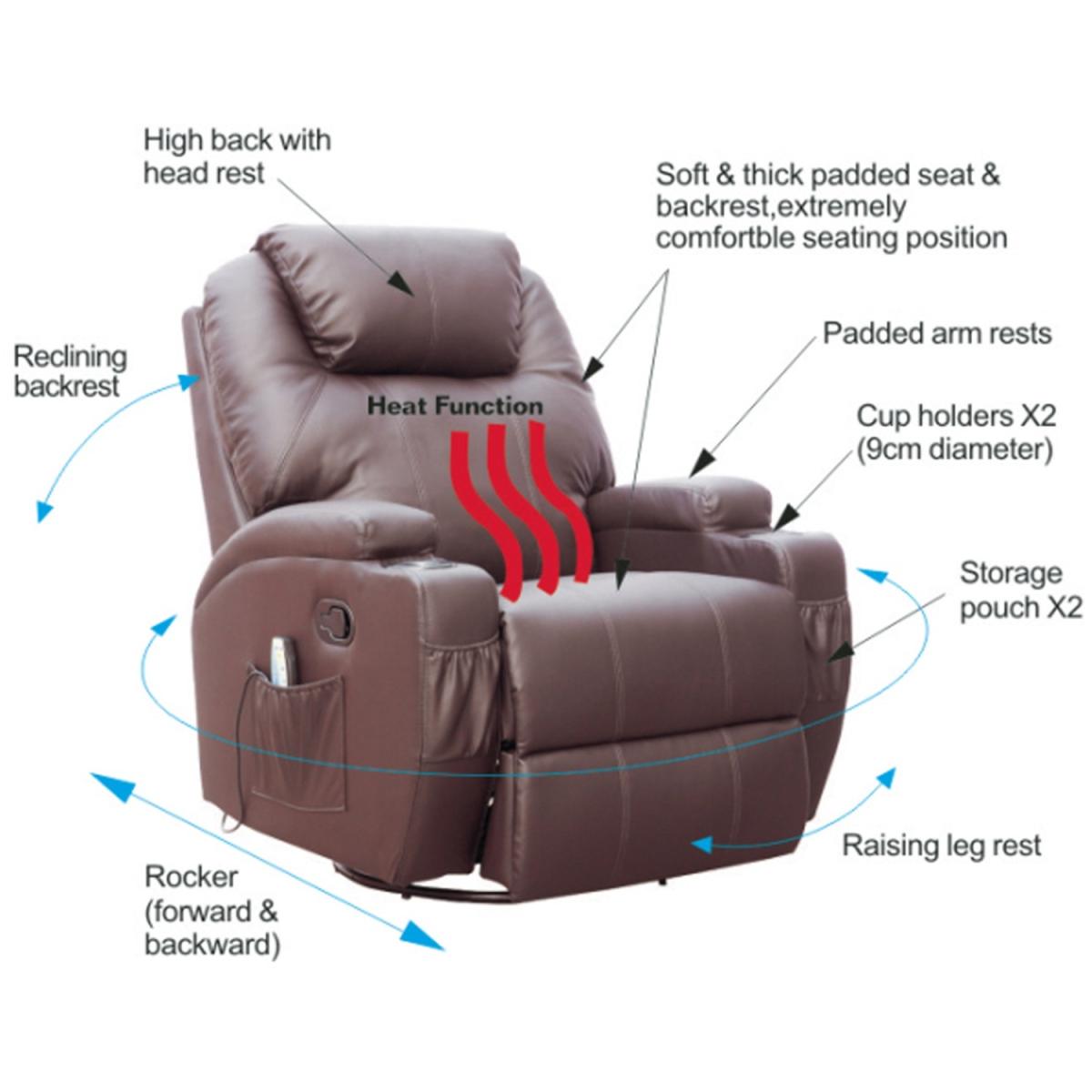 Pull the latch mechanism on the side turn the chair into a recliner and then you can apply the massage and heat just for relaxing or easing aches and pains and helping circulation. Additional functions are a 360-degree swivel and a backwards and forwards rocking action. Just for fun, the chair is fitted with a cup/bottle holder in each arm. Four pockets have been added for storage (Remote control or magazines). Swivel and rock function: Facilitated by an integral metal base under the chair. Easy to operate. Fully faced with thick bonded leather on the backrest and the seat. We do not use cheap PU or PVC (plastics) on the face of our chair.