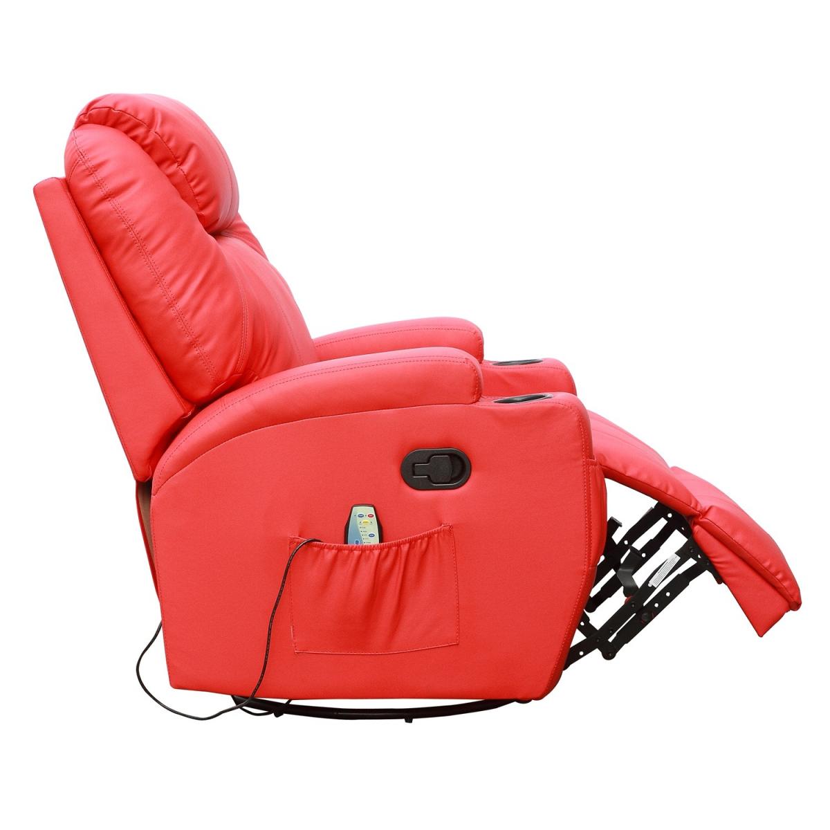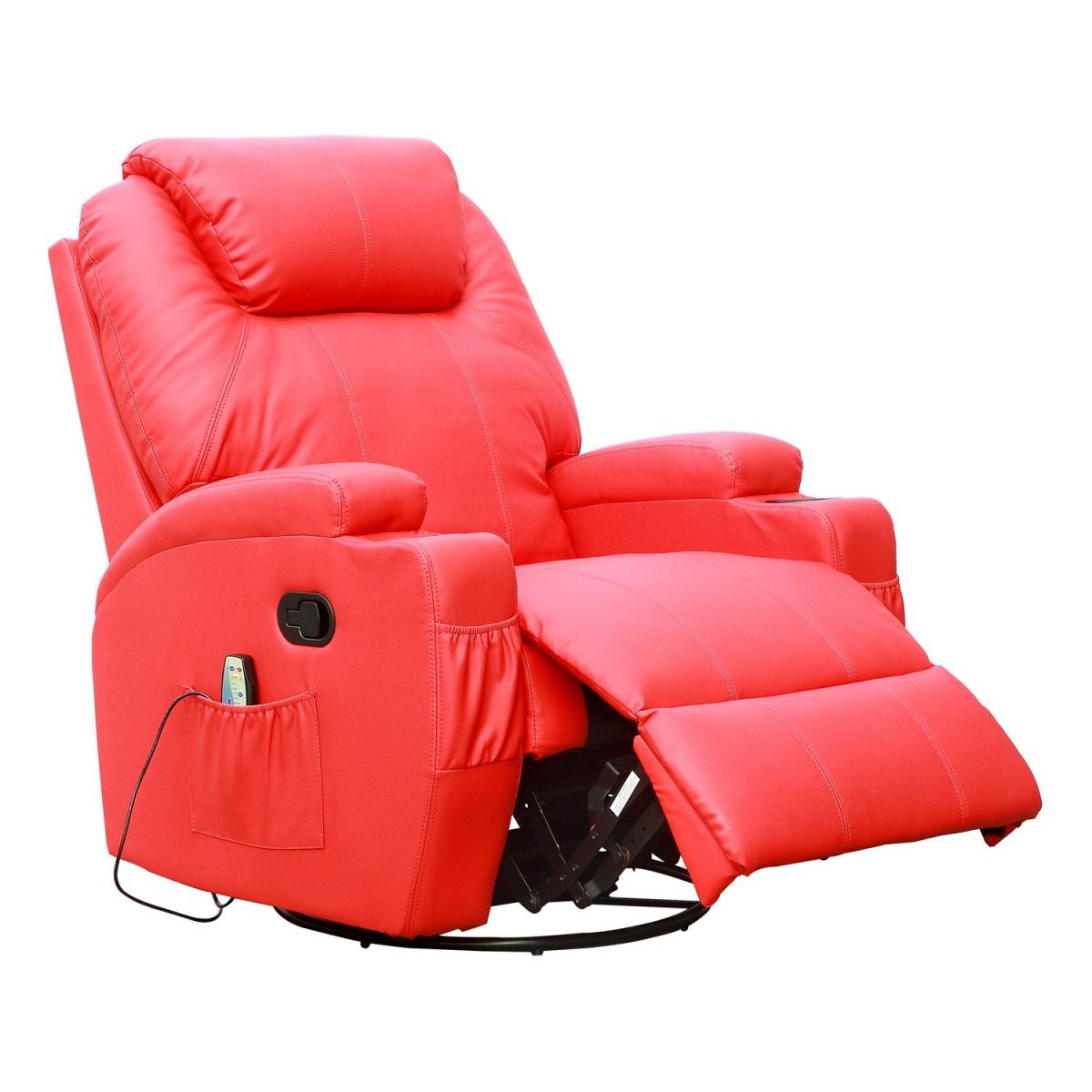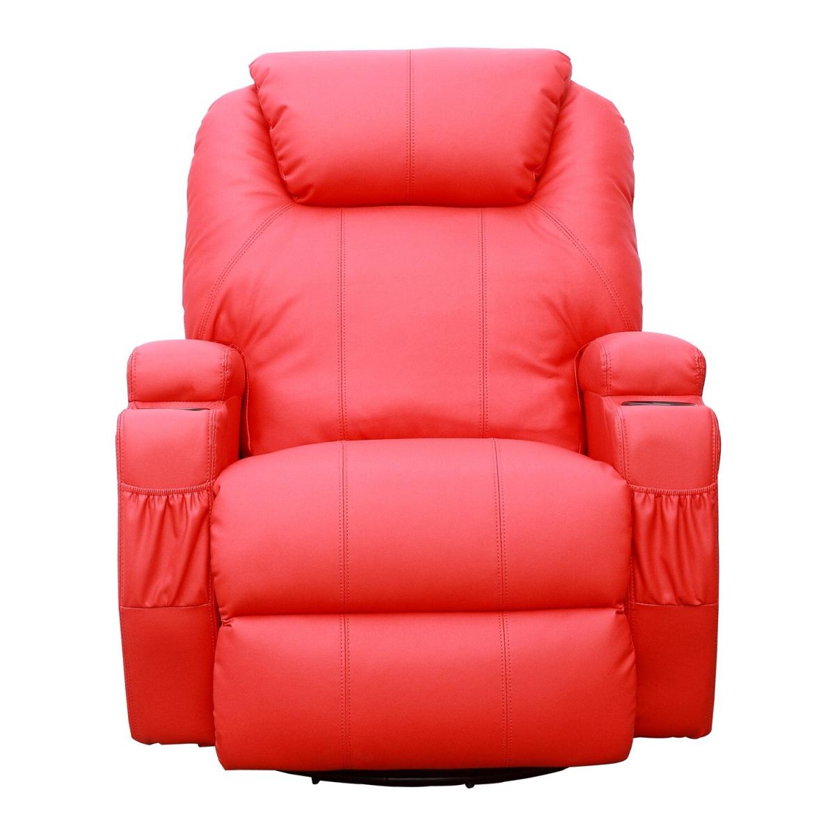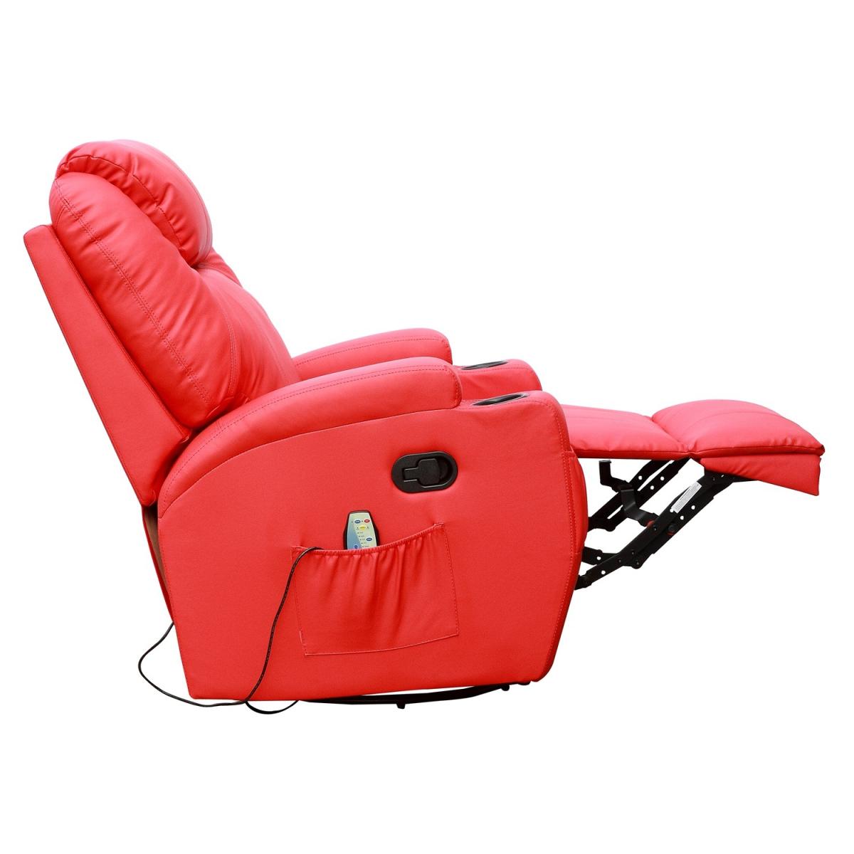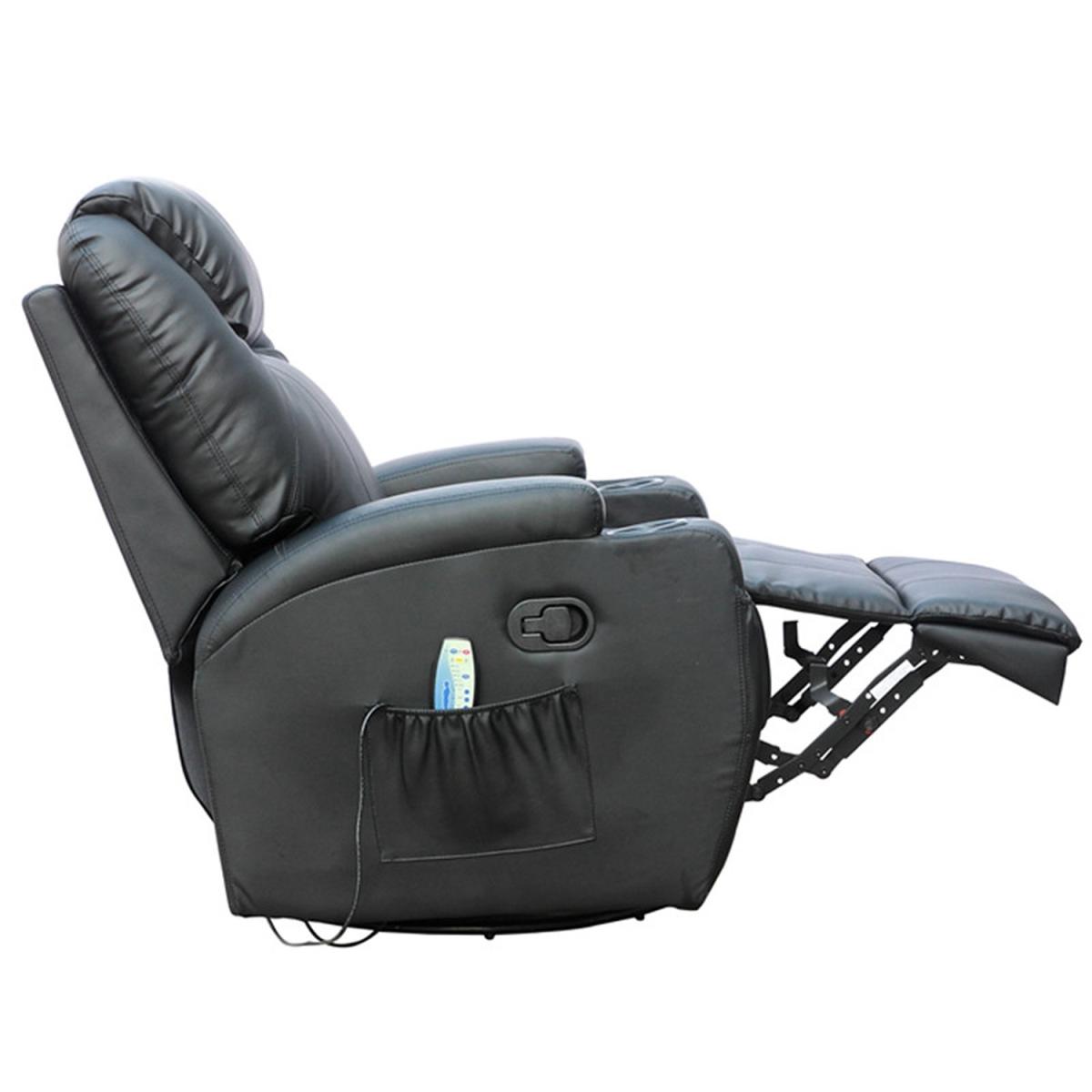 Pull the latch mechanism on the side turn the chair into a recliner and then you can apply the massage and heat just for relaxing or easing aches and pains and helping circulation. Additional functions are a 360-degree swivel and a backwards and forwards rocking action. Just for fun, the chair is fitted with a cup/bottle holder in each arm. Four pockets have been added for storage (Remote control or magazines). Swivel and rock function: Facilitated by an integral metal base under the chair. Easy to operate. Fully faced with thick bonded leather on the backrest and the seat. We do not use cheap PU or PVC (plastics) on the face of our chair.